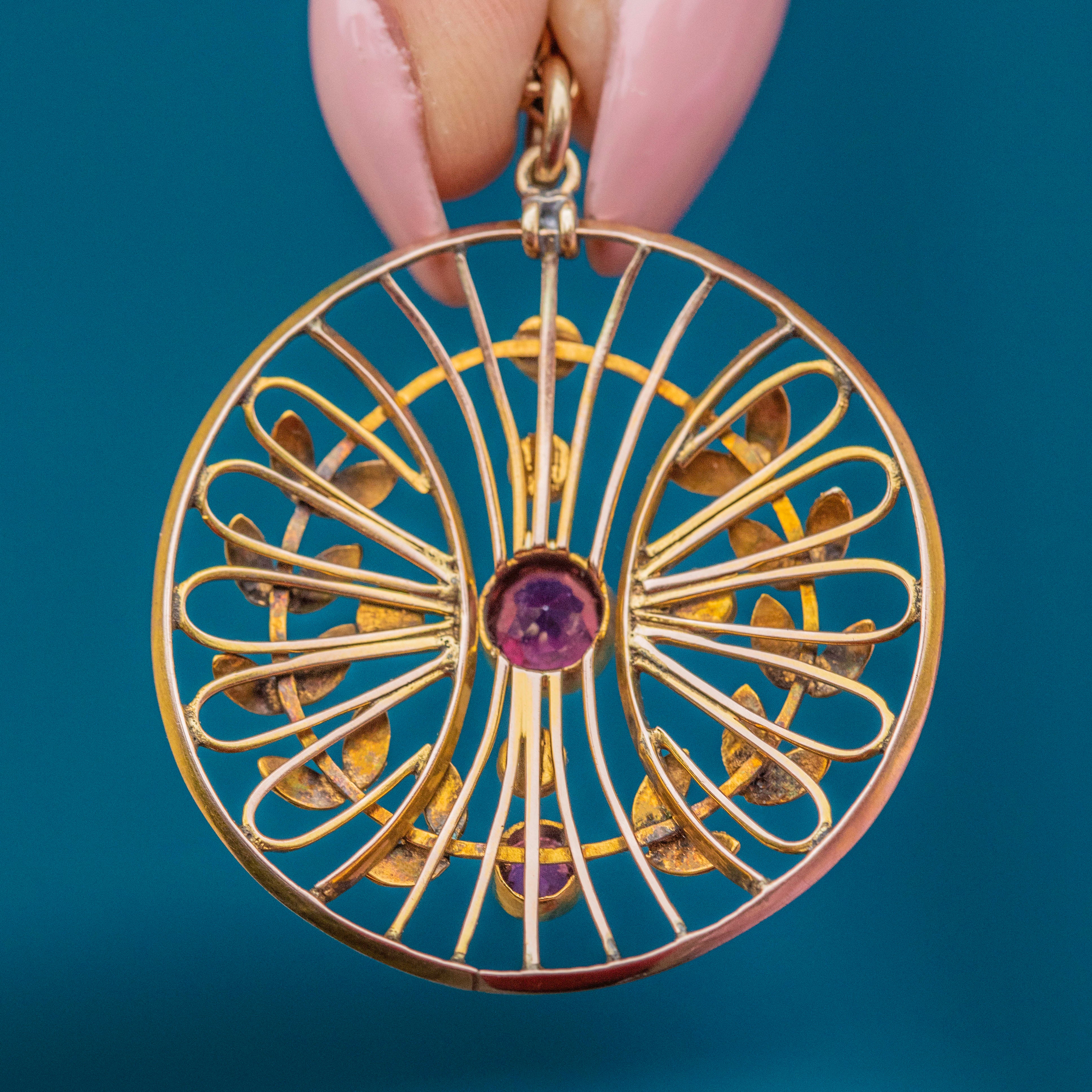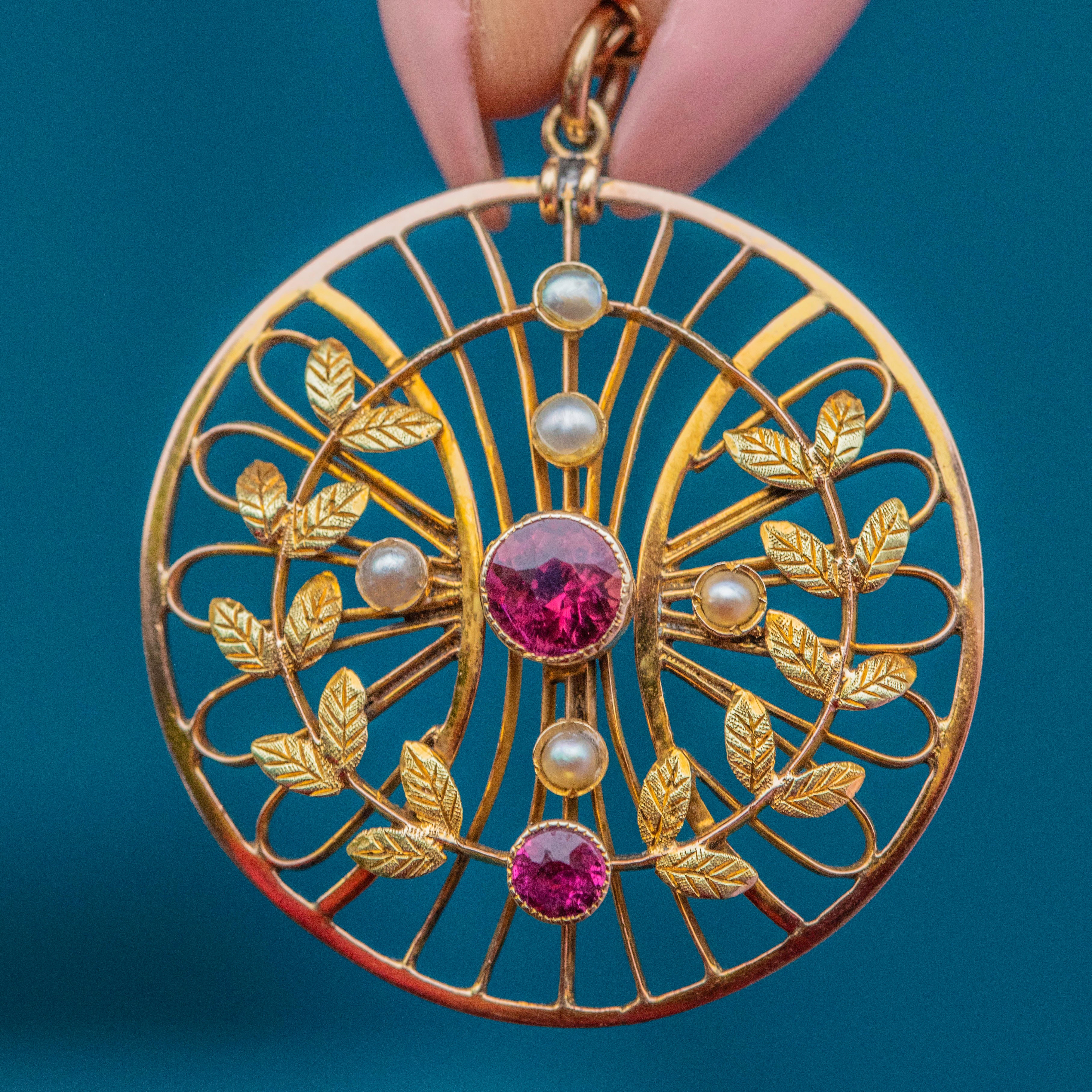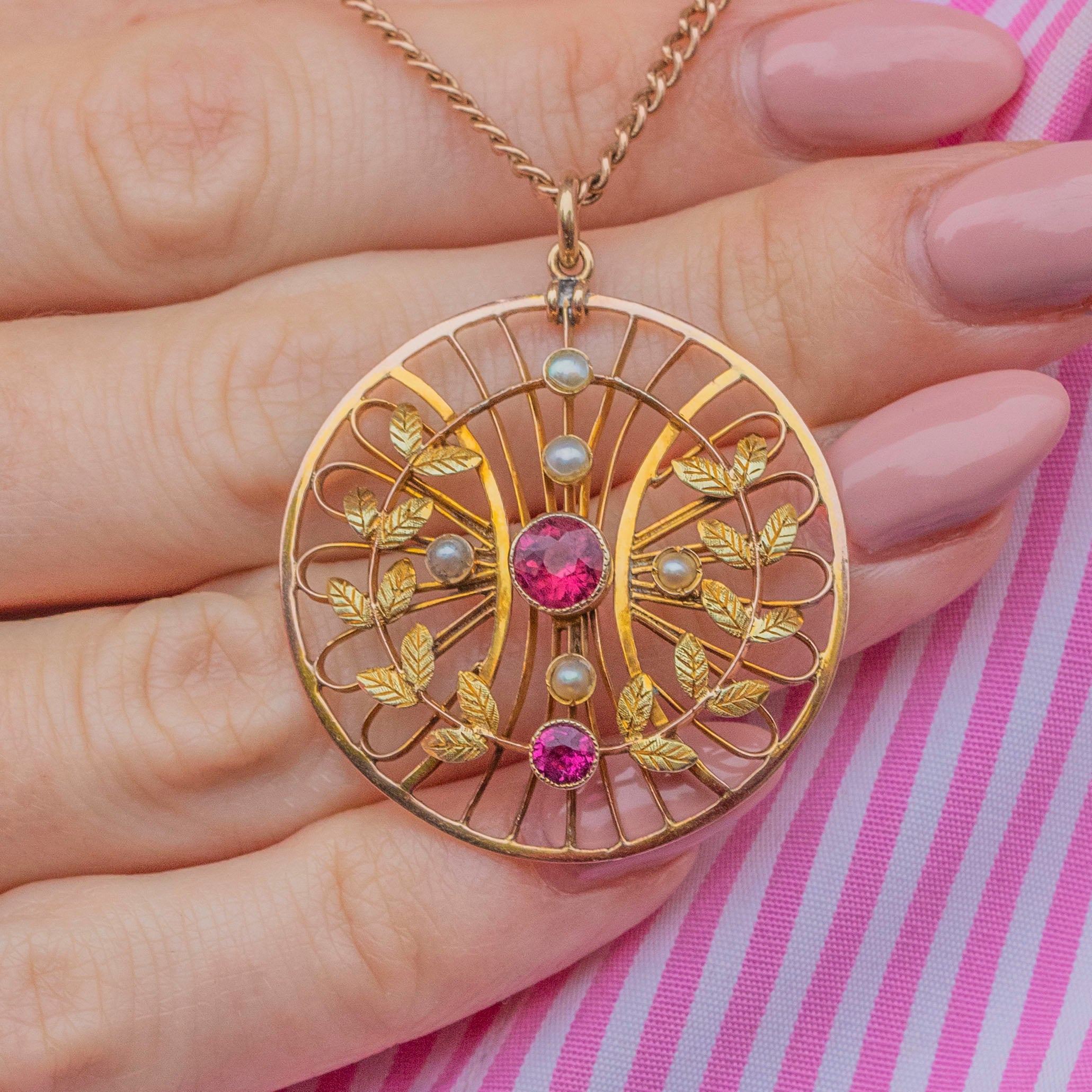 Add a pop of elegance to your collection with this Edwardian 18ct Gold Ruby Pearl round pendant!