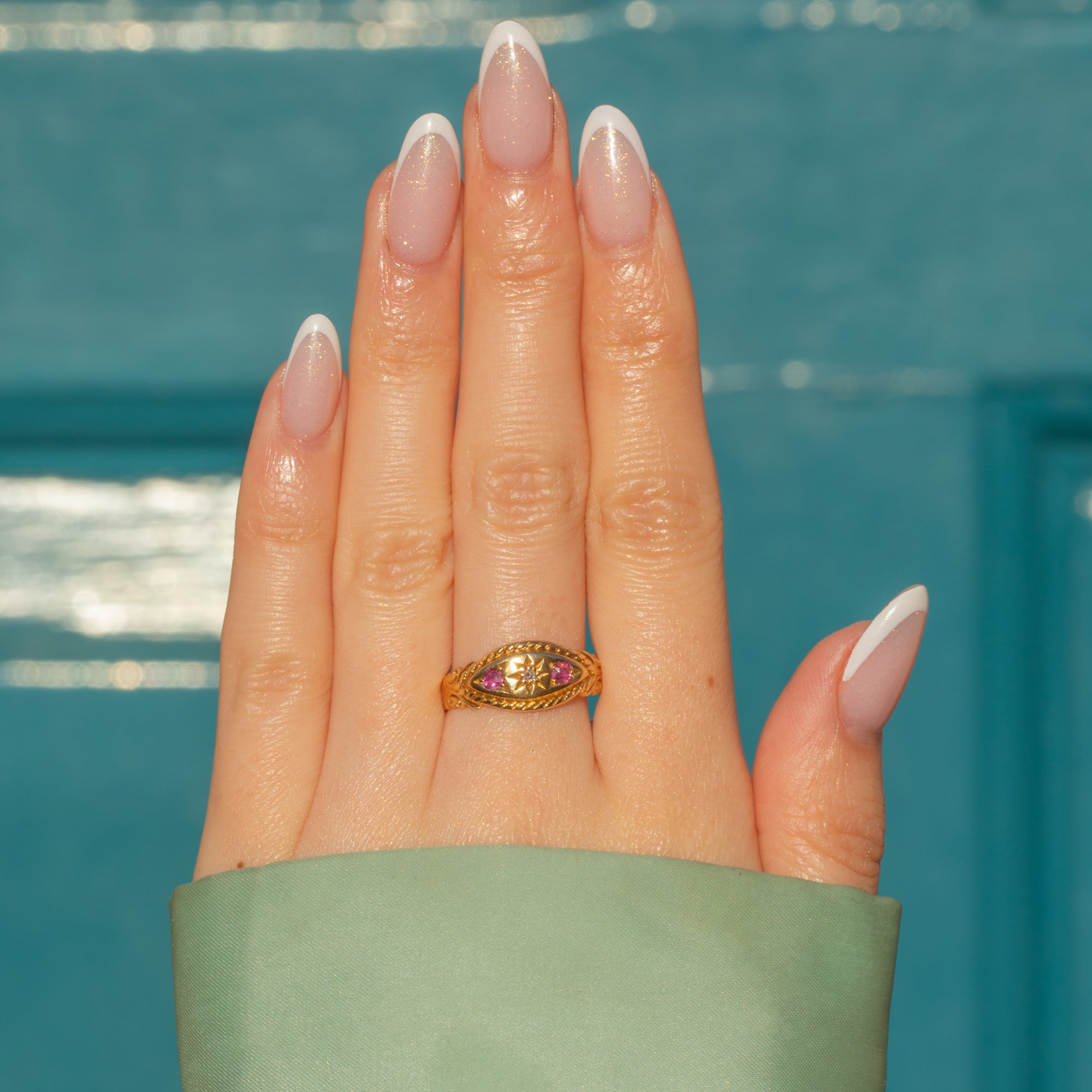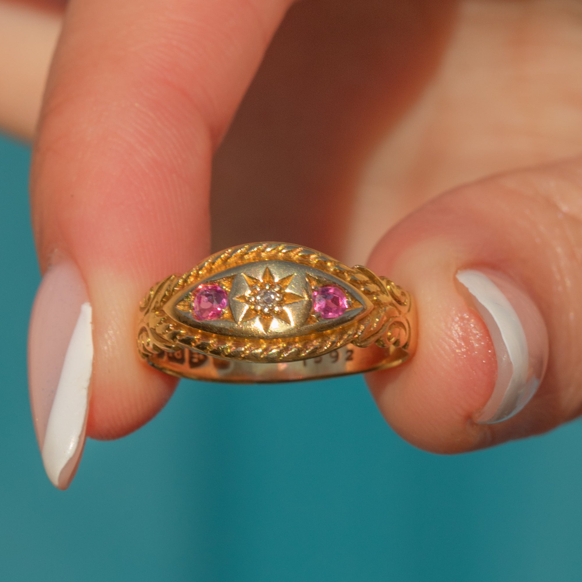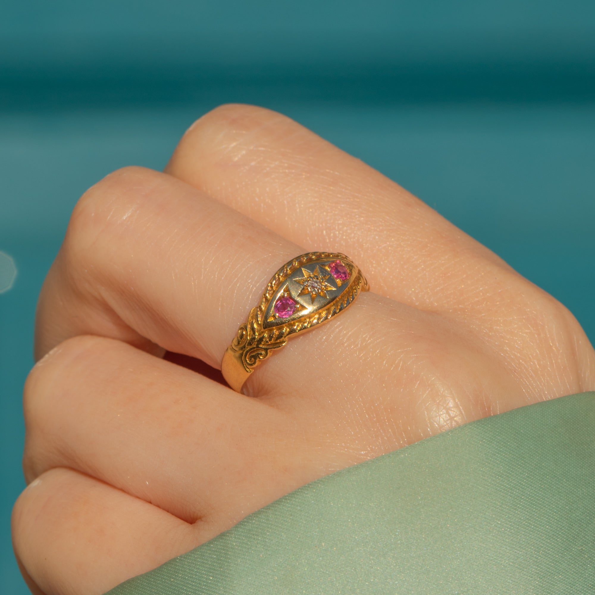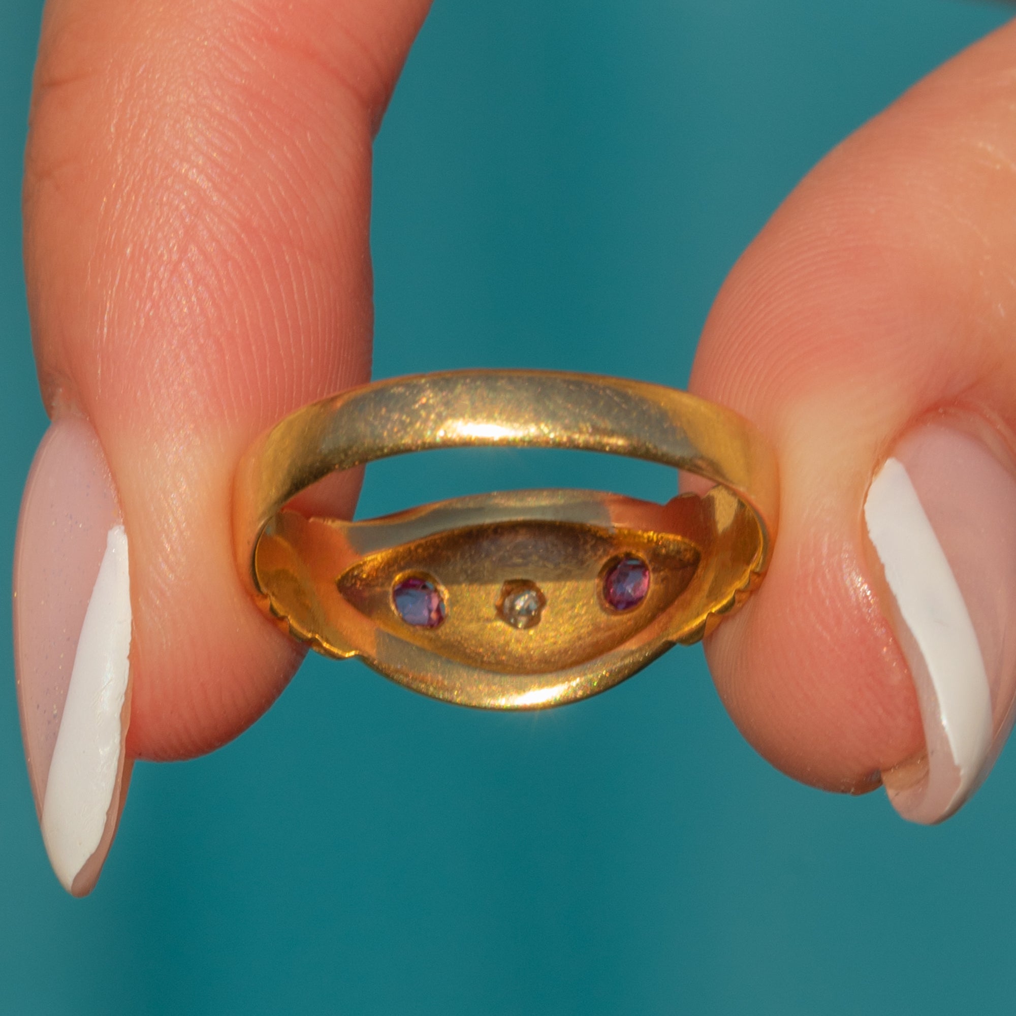 This buttery antique 18ct Gold Diamond and Ruby gypsy ring is an exemplar of Edwardian craftsmanship! With a central twinkling Diamond flanked by vibrant fuchsia Rubies, each gemstone is set within a traditional gypsy-style star setting, she truly is a quality piece.