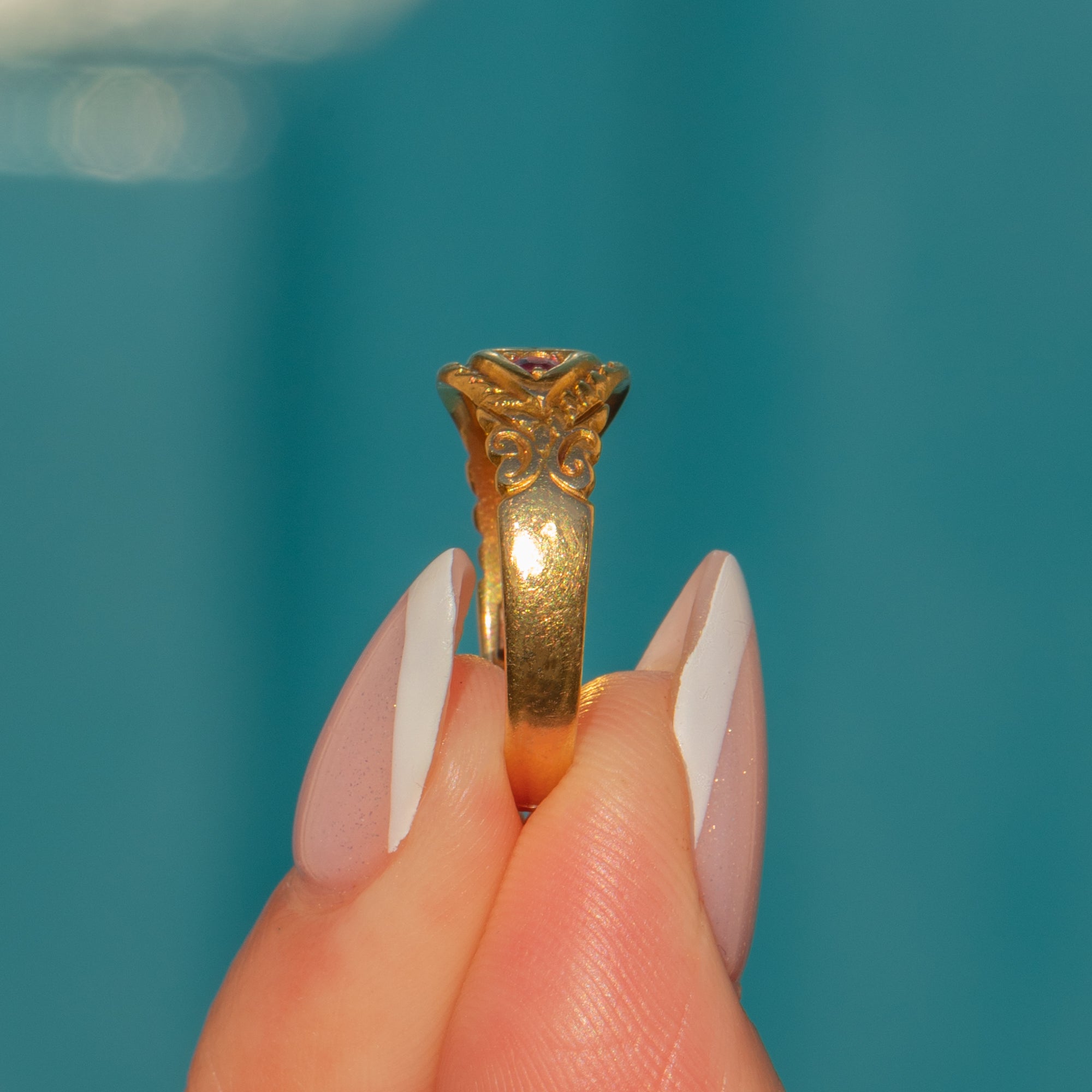 Fully hallmarked and dated to 1906, including the rare Chester Assay, this Edwardian gypsy ring is a highly coveted piece steeped in antique character!