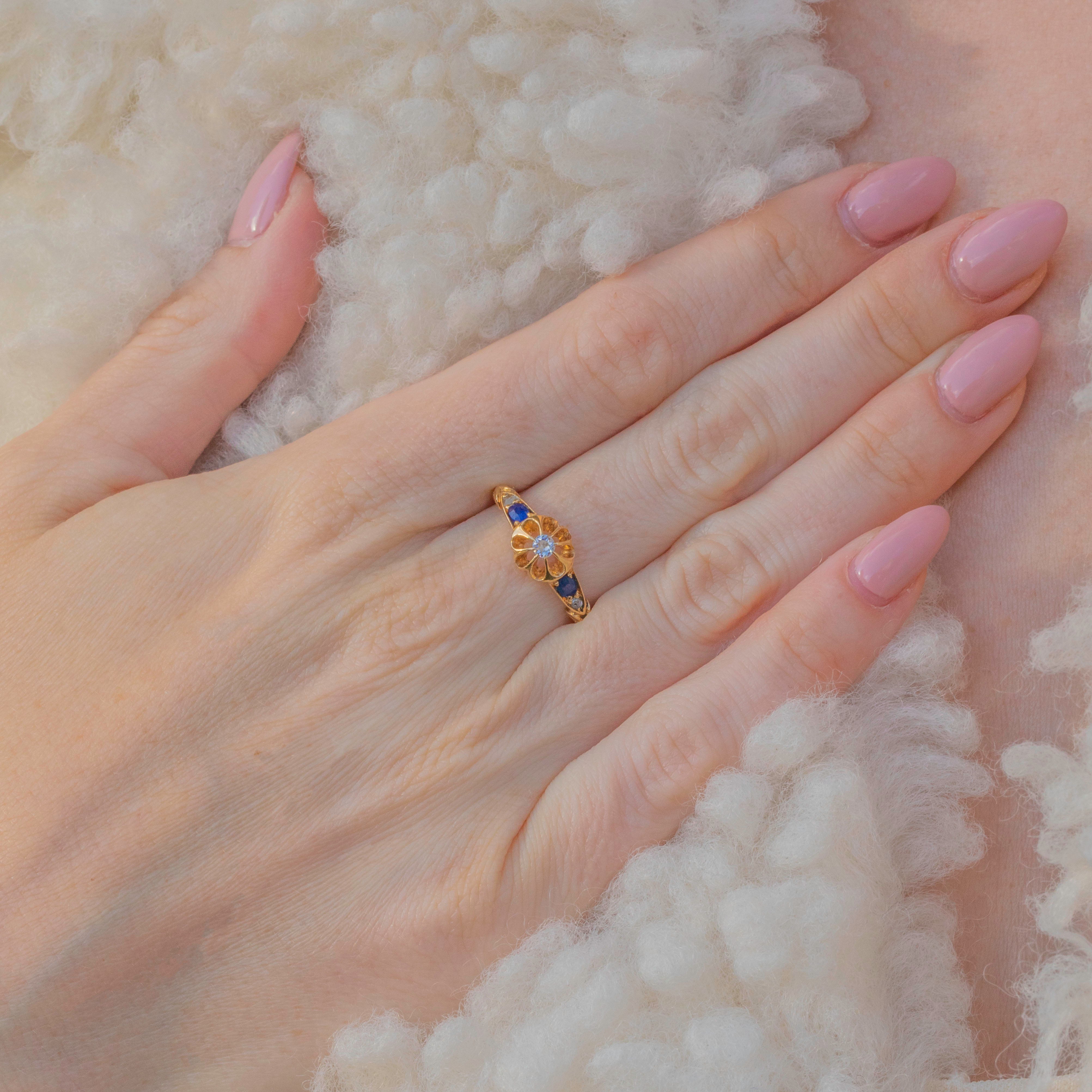 This Edwardian 18ct Gold Sapphire Diamond flower ring is just the sweetest! The star of the show is her Diamond elevated by feminine buttercup settings, allowing the light to pour through from every angle creating a mesmerising glisten.