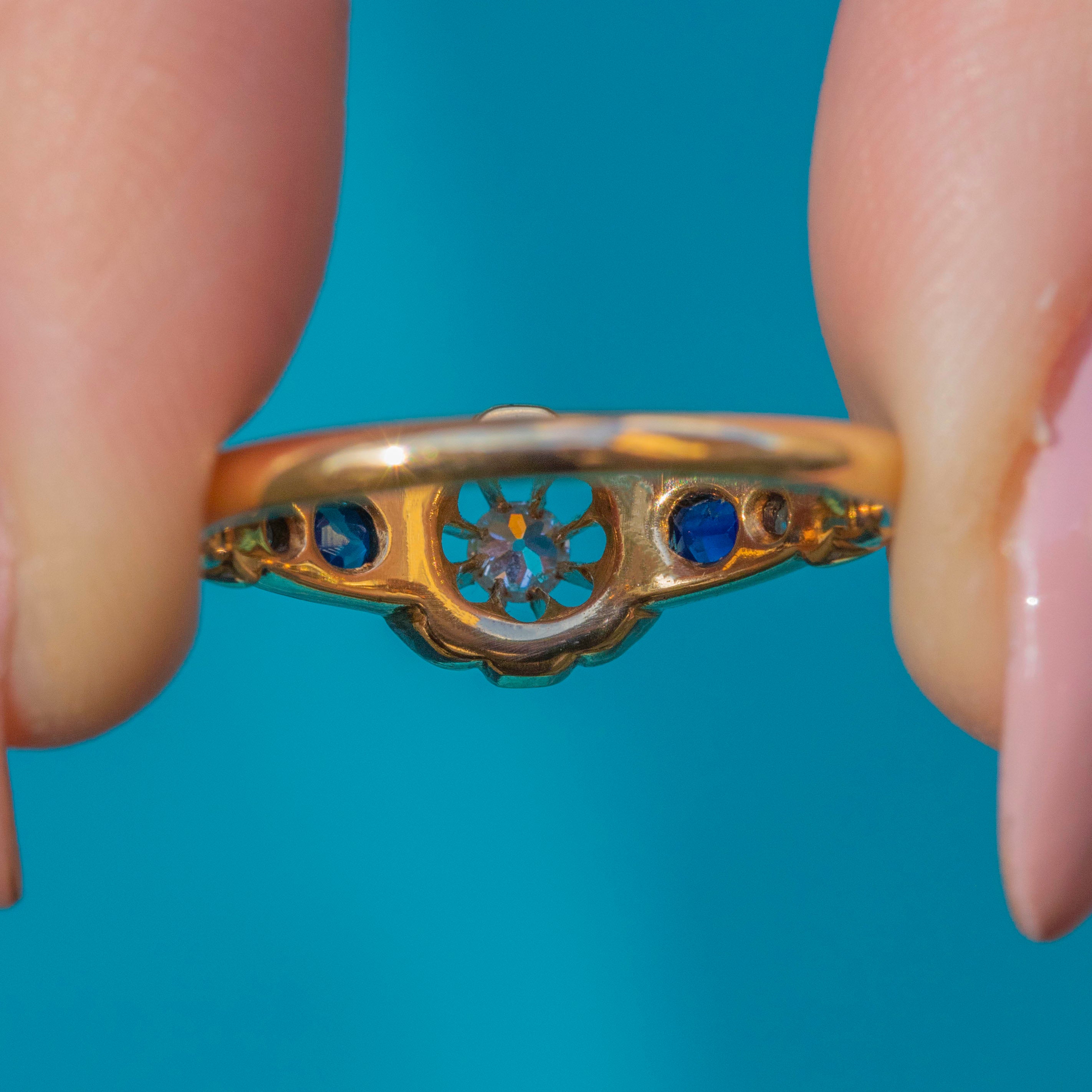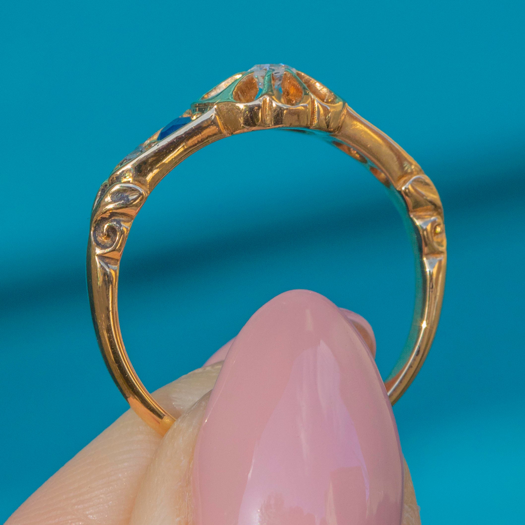 The shoulders of this Edwardian ring are exquisite, inlaid with two glistening Sapphires and two more Diamonds for the finishing touch. With gorgeous scrollwork on either side, all eyes are guaranteed to draw towards her.