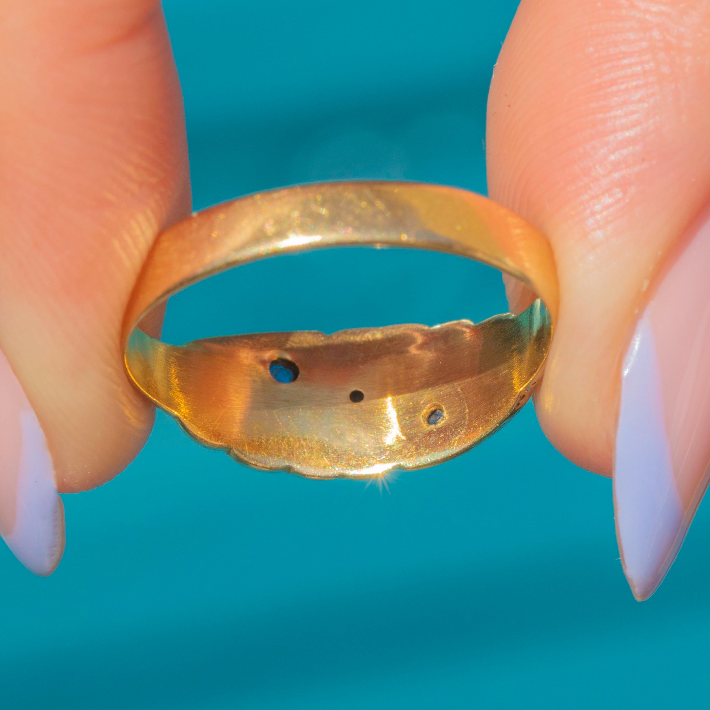 Crafted from solid 18ct Gold, the chubby ring band feels luxurious as it caresses the finger, with its low profile making it perfect for everyday wear. The inside of the band is fully hallmarked, including the rare Chester Assay stamp, dating this Edwardian gypsy ring to 1905, making it a highly coveted antique treasure!