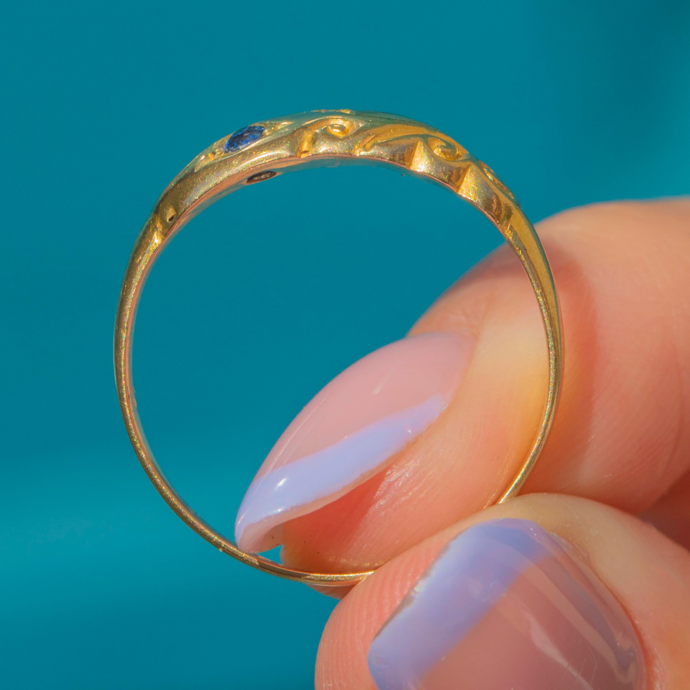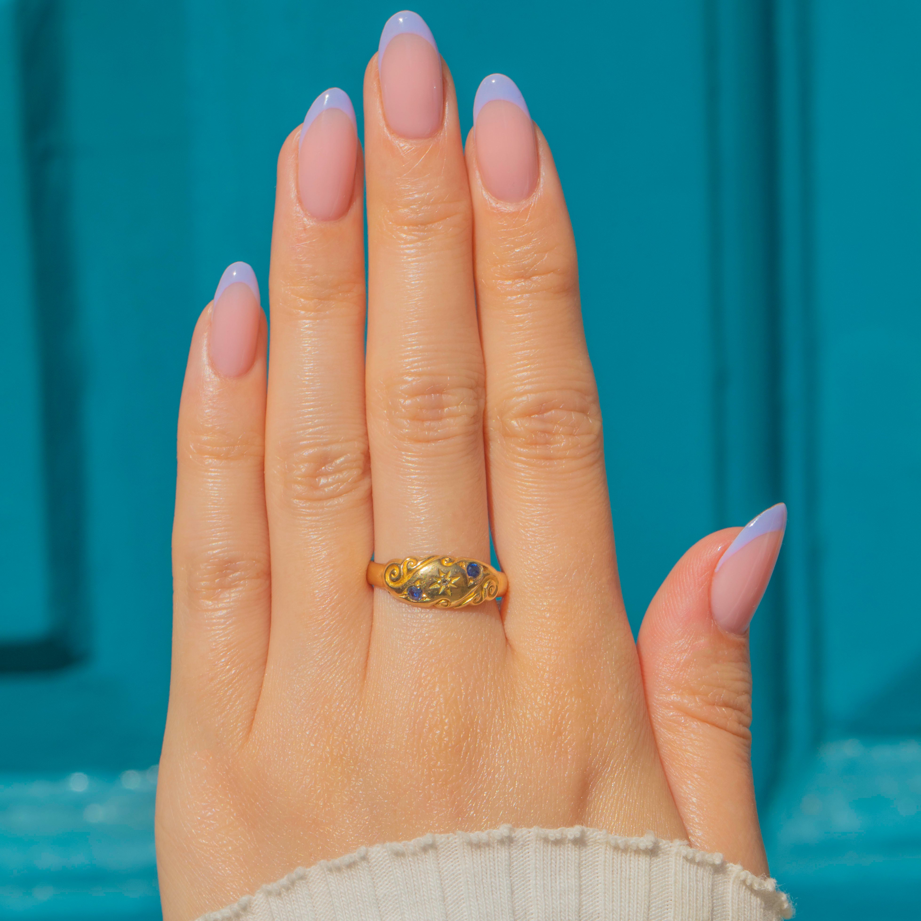 This Edwardian 18ct Gold Sapphire Diamond gypsy ring is a celestial dream! The gemstones are flush-set in distinct star settings, with whimsical engraved details curving around the trilogy to create an undeniably enchanting piece.