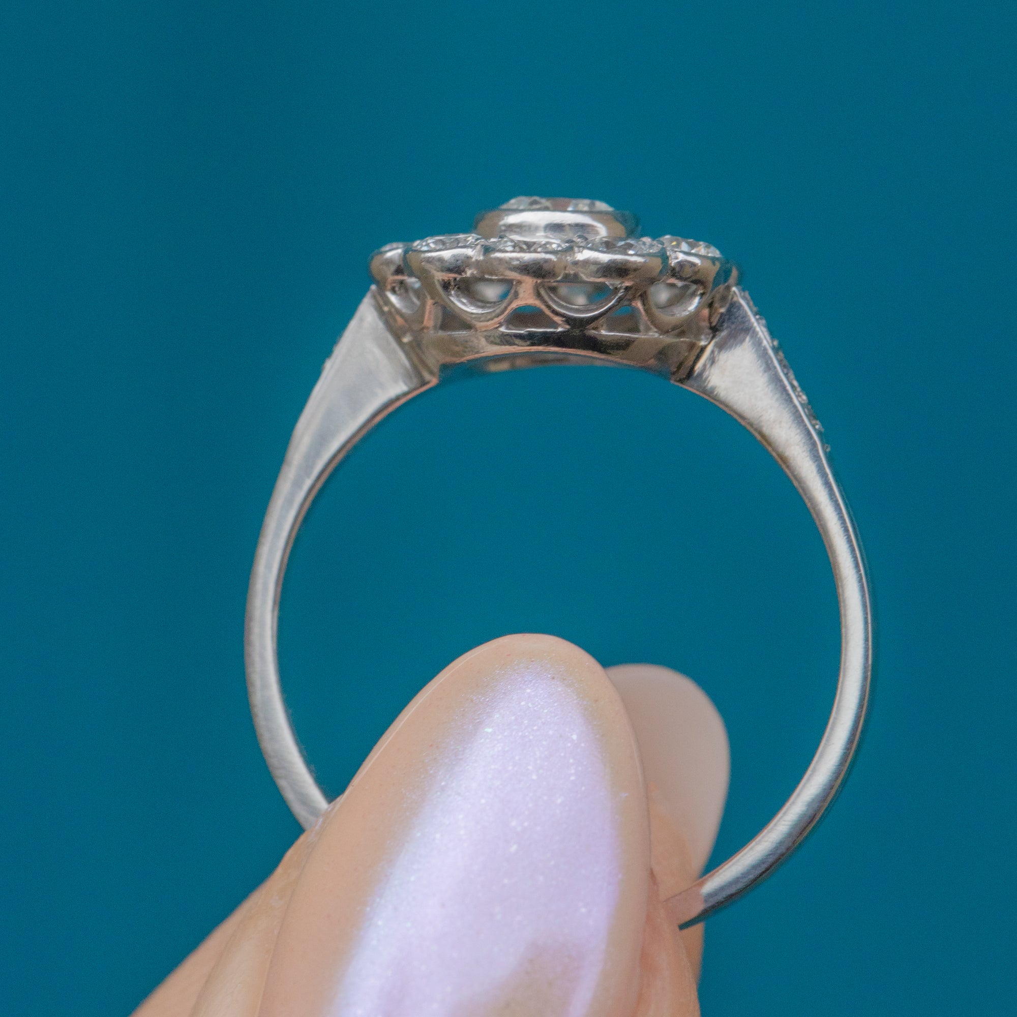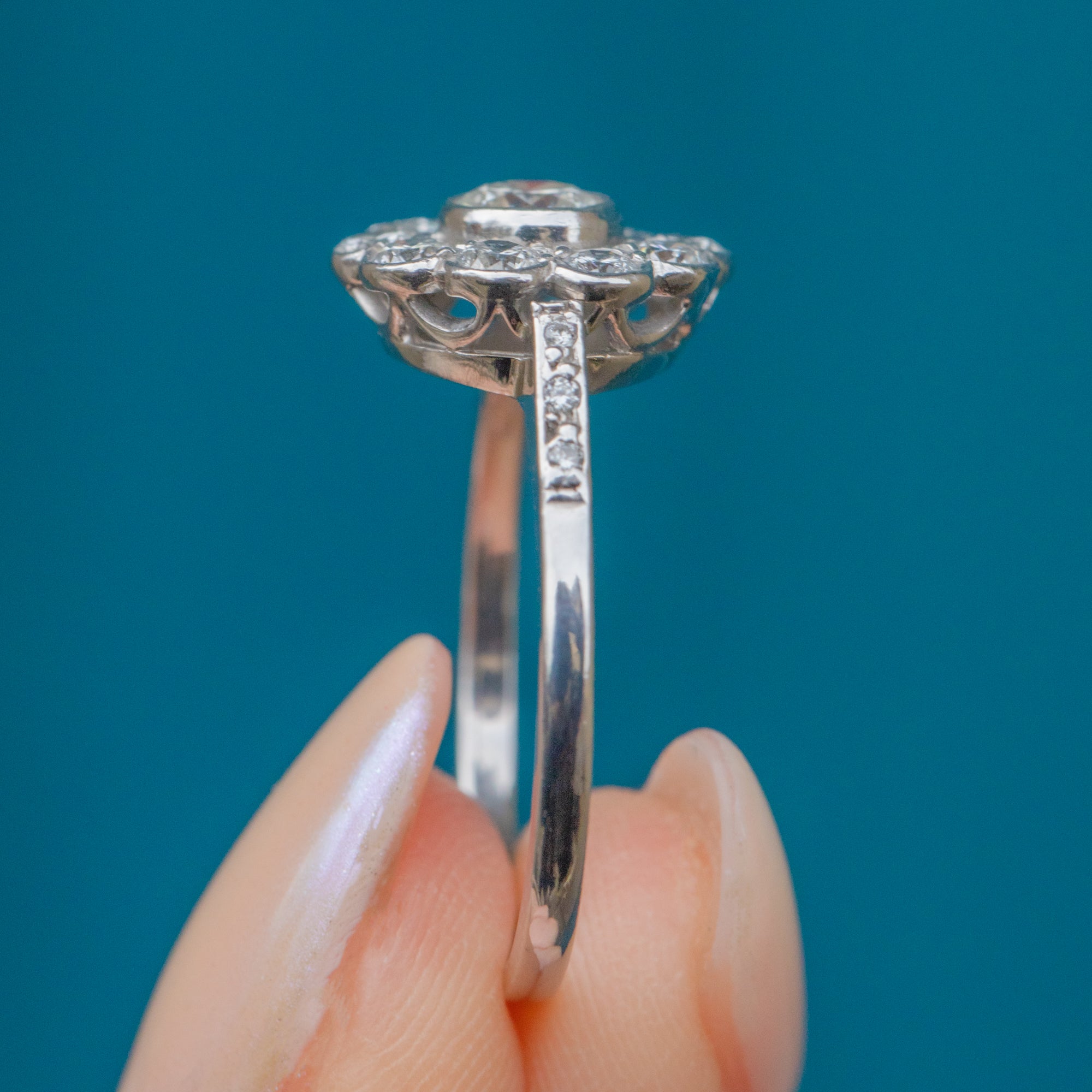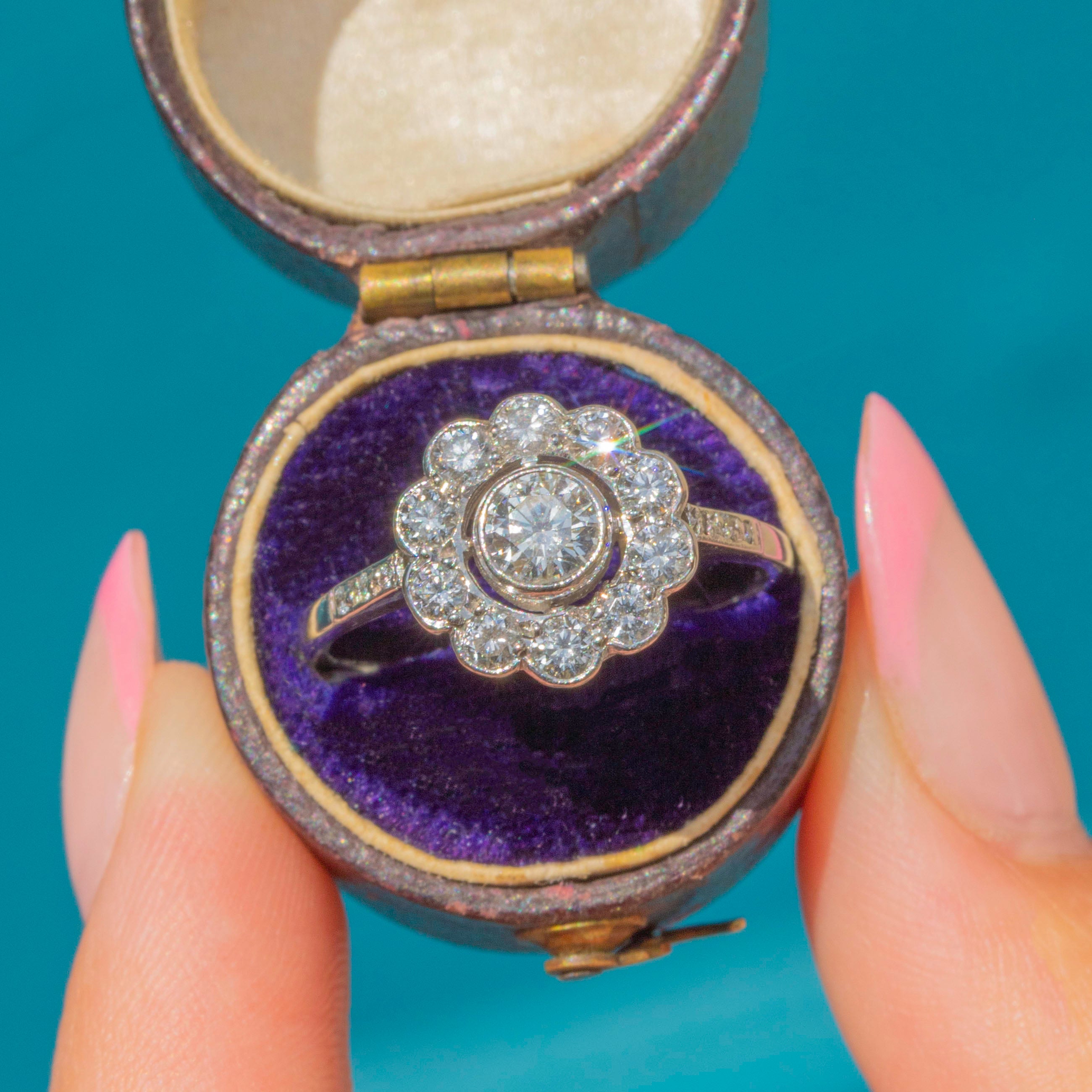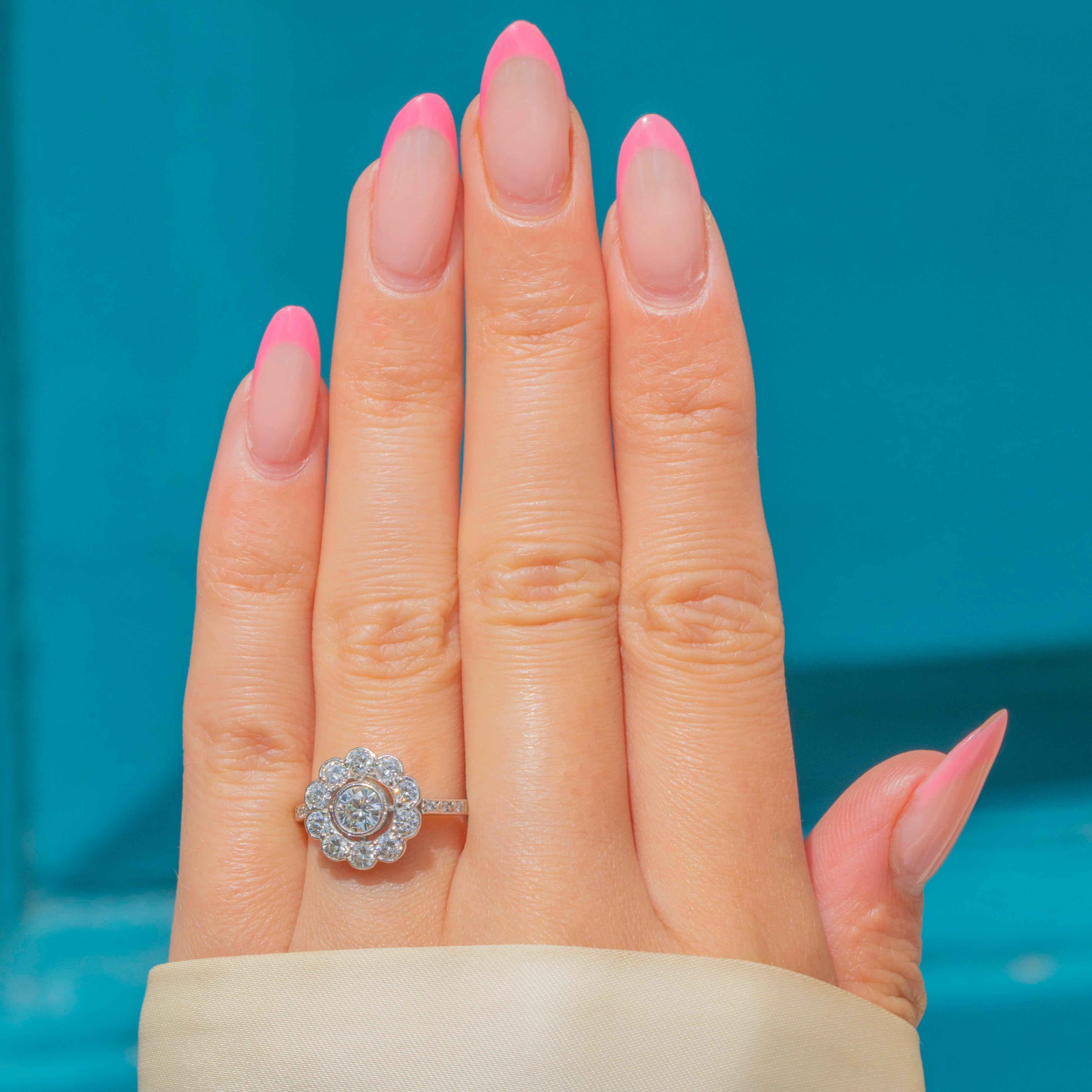 This Edwardian 18ct White Gold Diamond daisy cluster ring will be the easiest yes! A timeless choice of engagement ring, this Diamond cluster takes the form of a daisy flower.