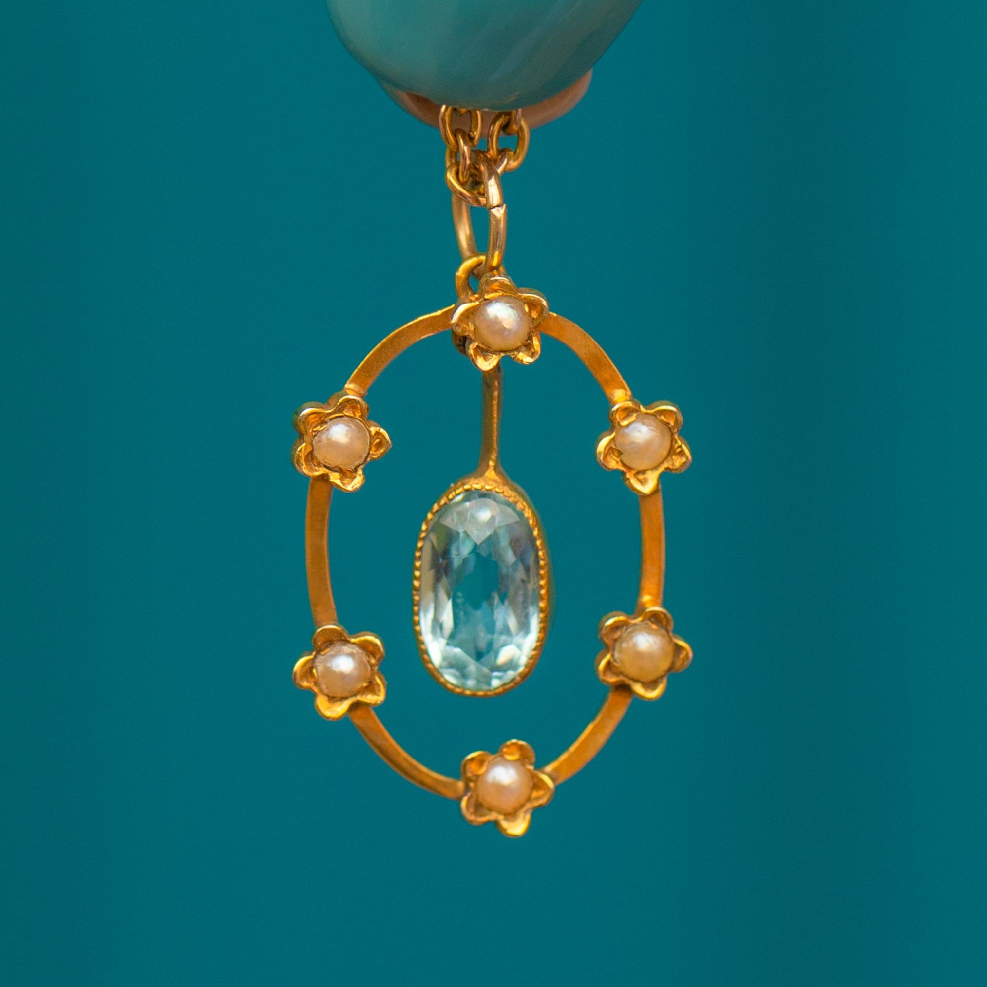 MATERIALS: Tests as 9ct Gold throughout, Aquamarine (0.50ct), Pearls.