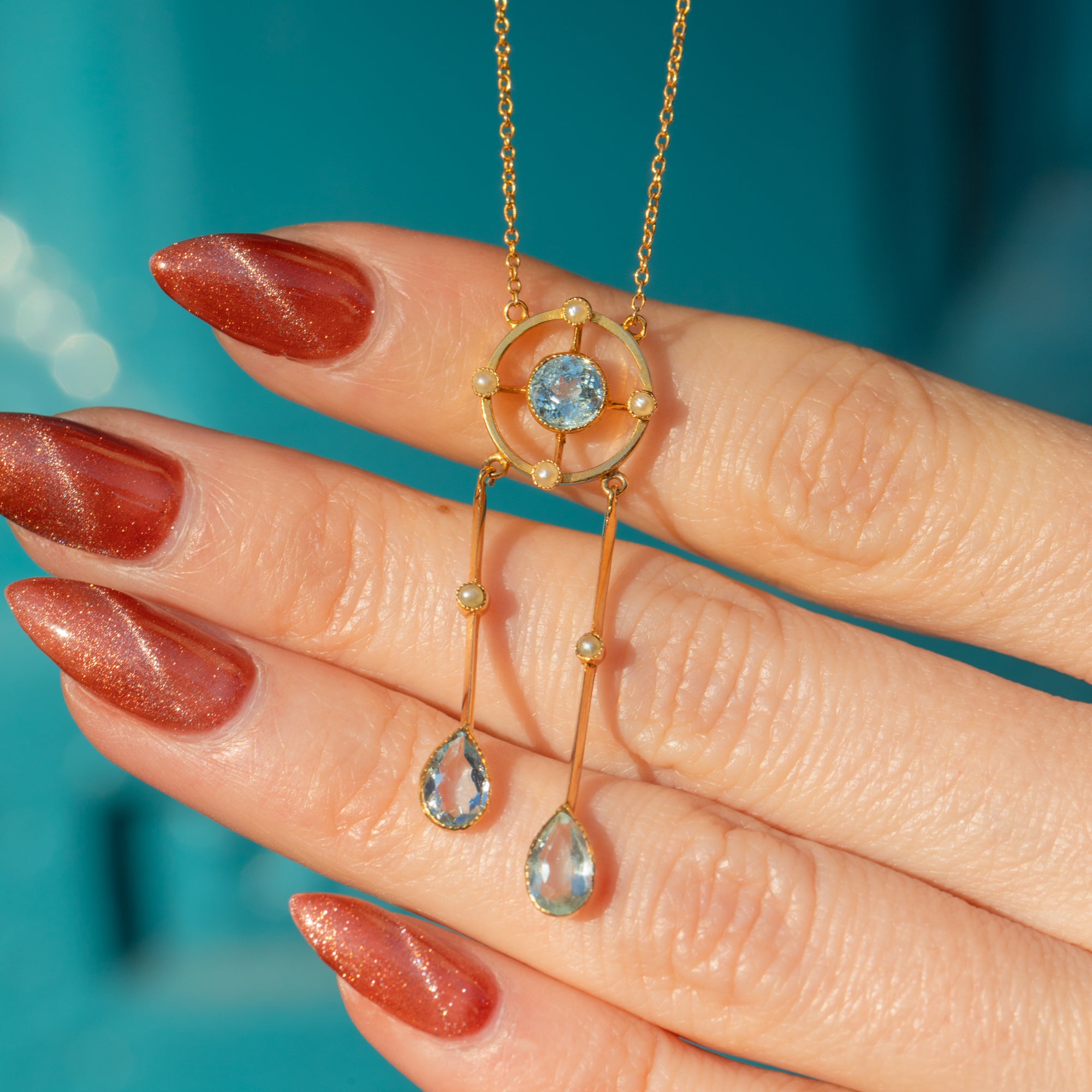 Add antique elegance to your collection with this Edwardian 9ct Gold Aquamarine Pearl negligee necklace!