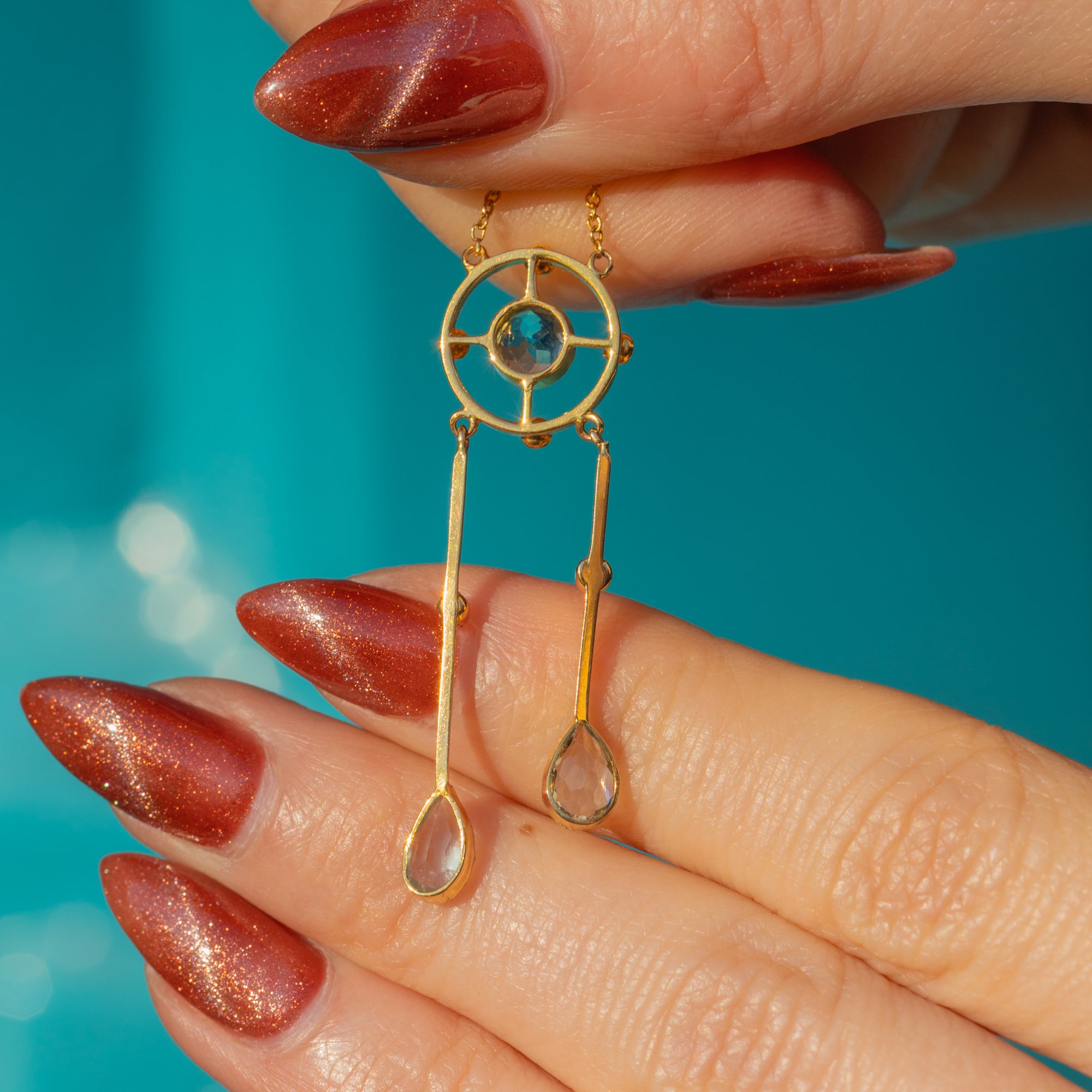 Crafted from buttery 9ct Gold, this antique necklace features a stunning drop pendant as her focal point, intricately crafted and adorned with Aquamarines and dainty Seed Pearls. Each Aquamarine boasts icy blue hues, effortlessly complemented by the iridescent Seed Pearls.