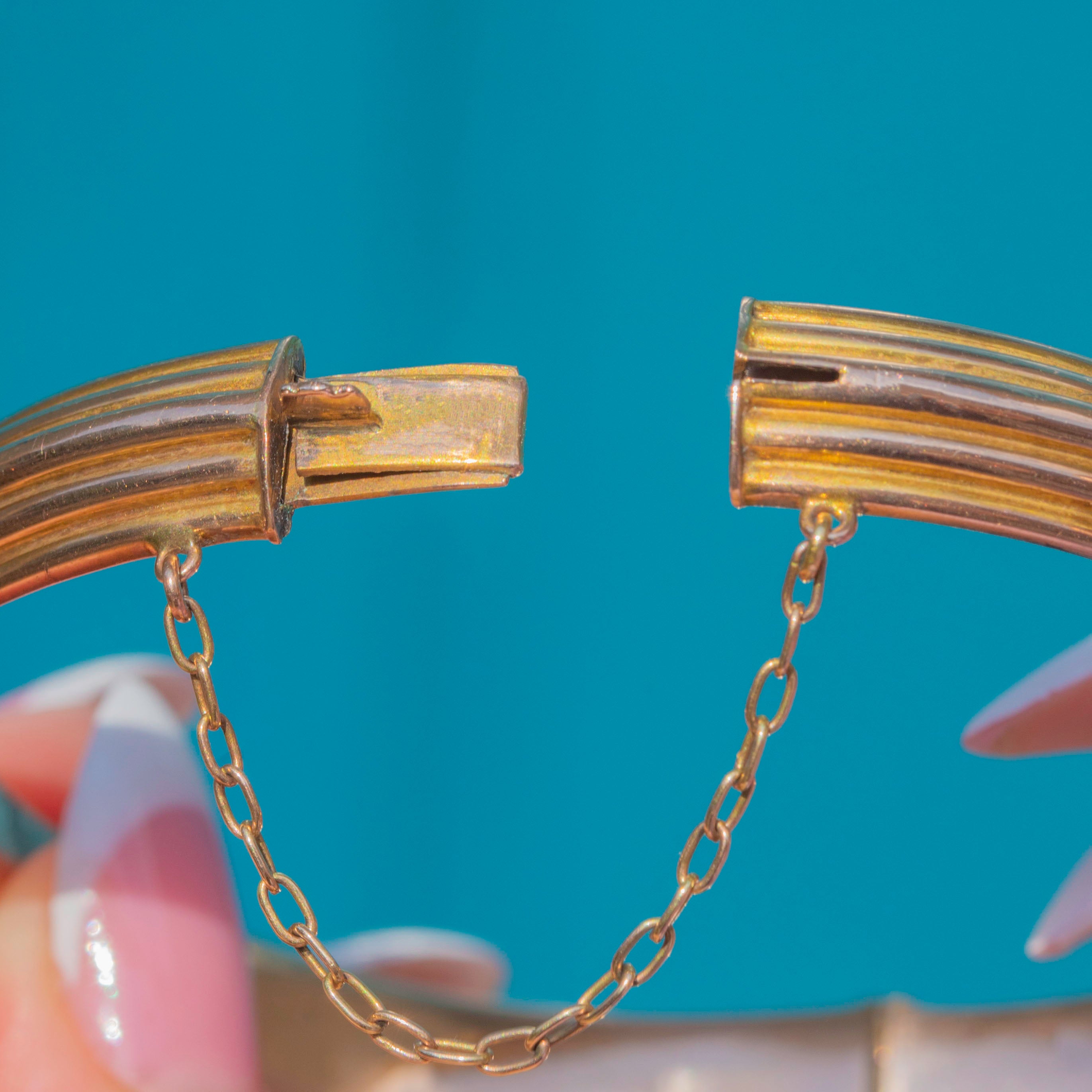 This antique bangle boasts a gorgeous, buttery 9ct Gold sheen and features fashionable grooves across its front, perfectly capturing the intricate designs of Victorian-era craftsmanship.