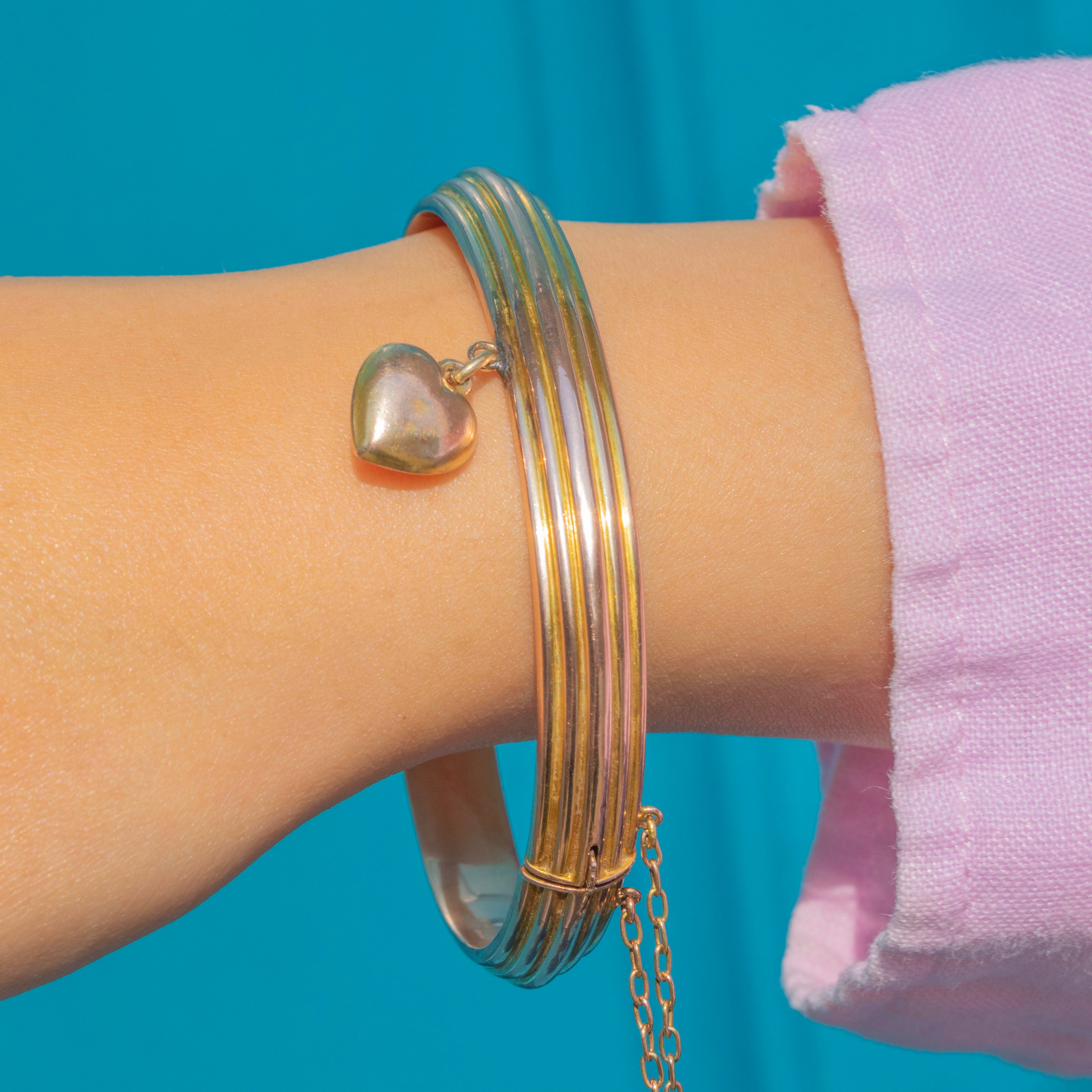 VERY GOOD-EXCELLENT: The Gold is rosy and bright and her grooves have remained crisp. There are some spots of discolouration and light surface wear to the Gold, particularly near the clasp and the charm, though this is not overtly evident during wear. With her heart charm securely soldered and complete with a safety chain, you can wear this engraved bangle with utmost confidence!