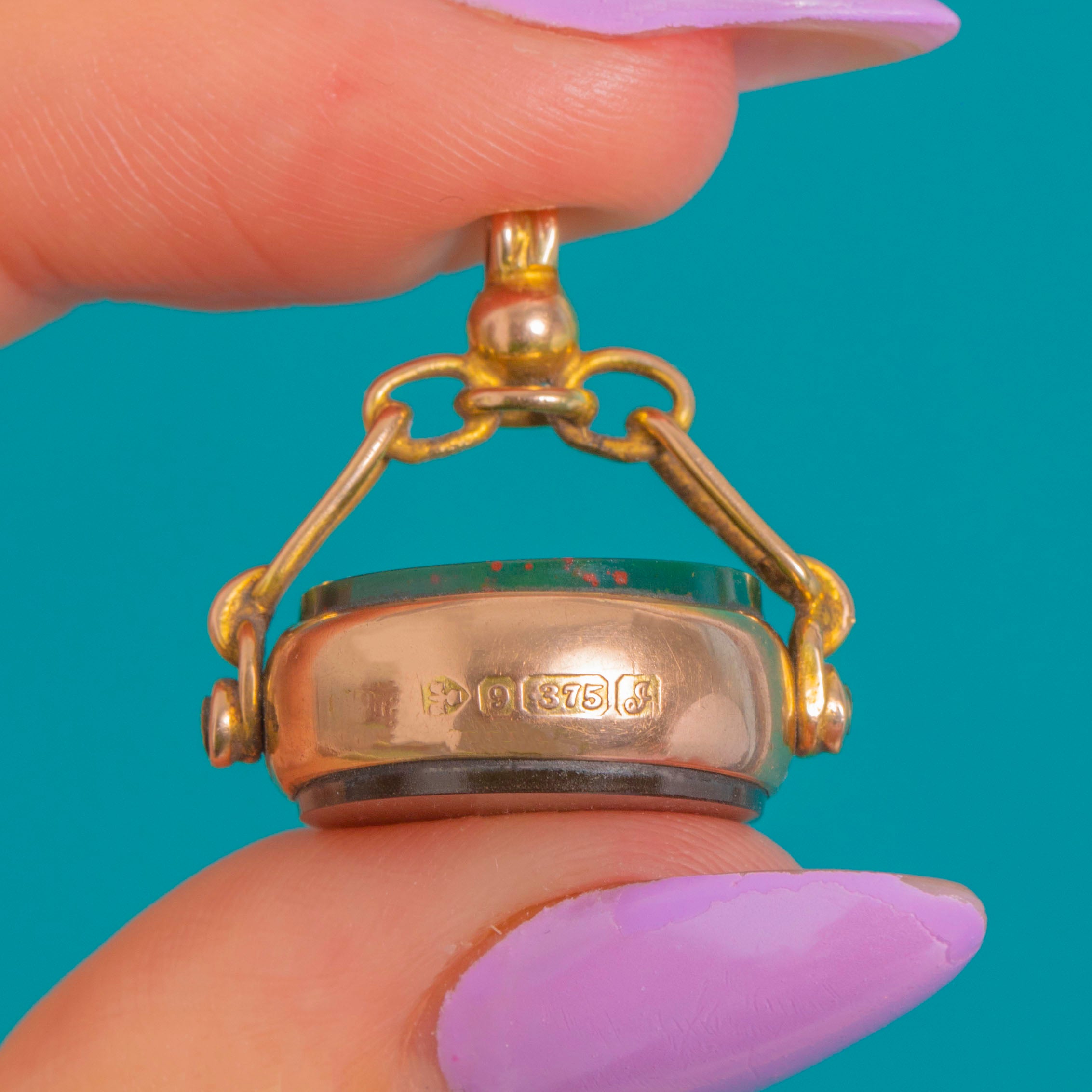 A refined Edwardian fob pendant crafted in rich 9ct Gold, this circular treasure is set with characterful Bloodstone flecked with vivid reds and complemented by sleek Onyx. The cabochon sits in a smooth bezel, suspended from an elegant double-armed, articulated bracket and petite round bail for a poised, timeless silhouette.