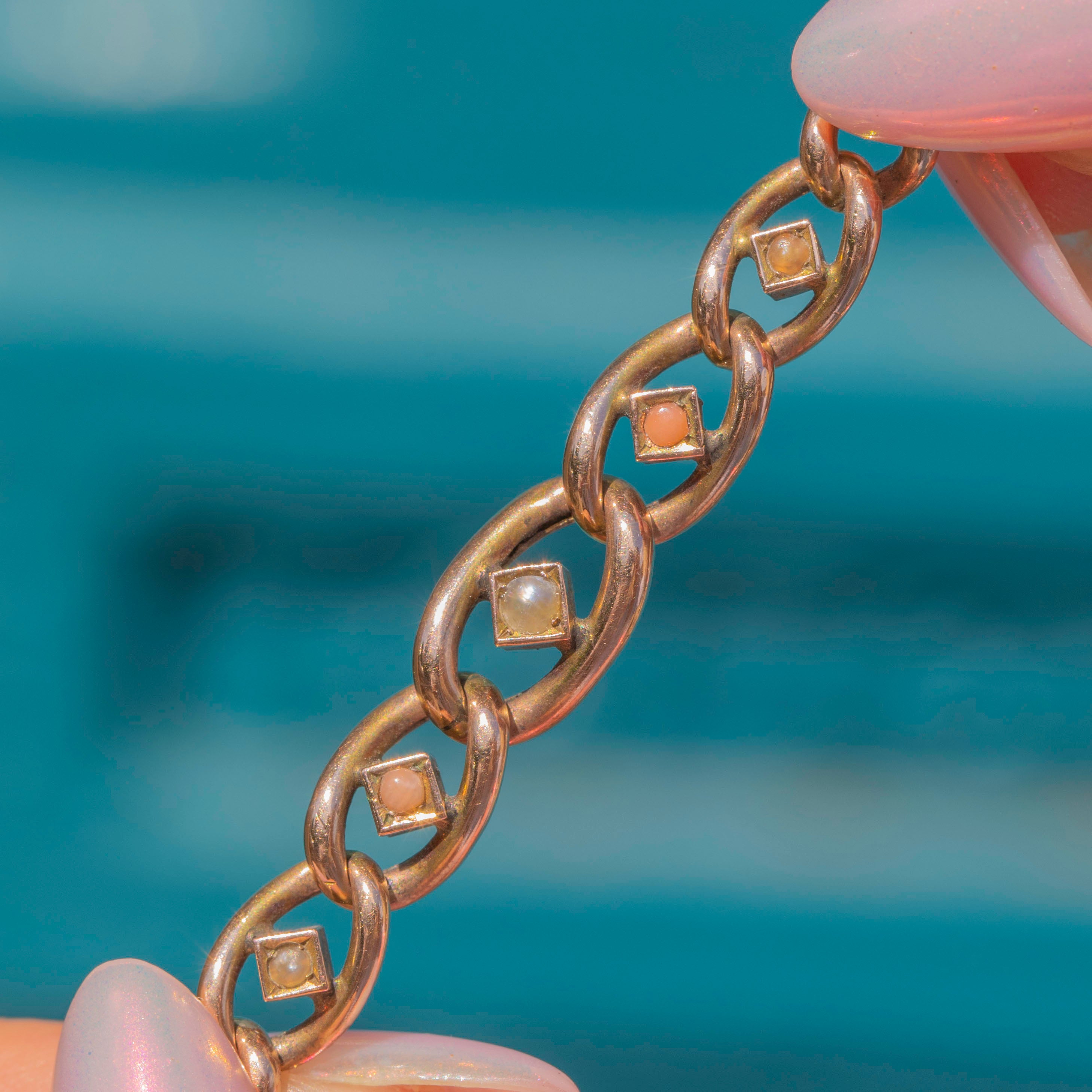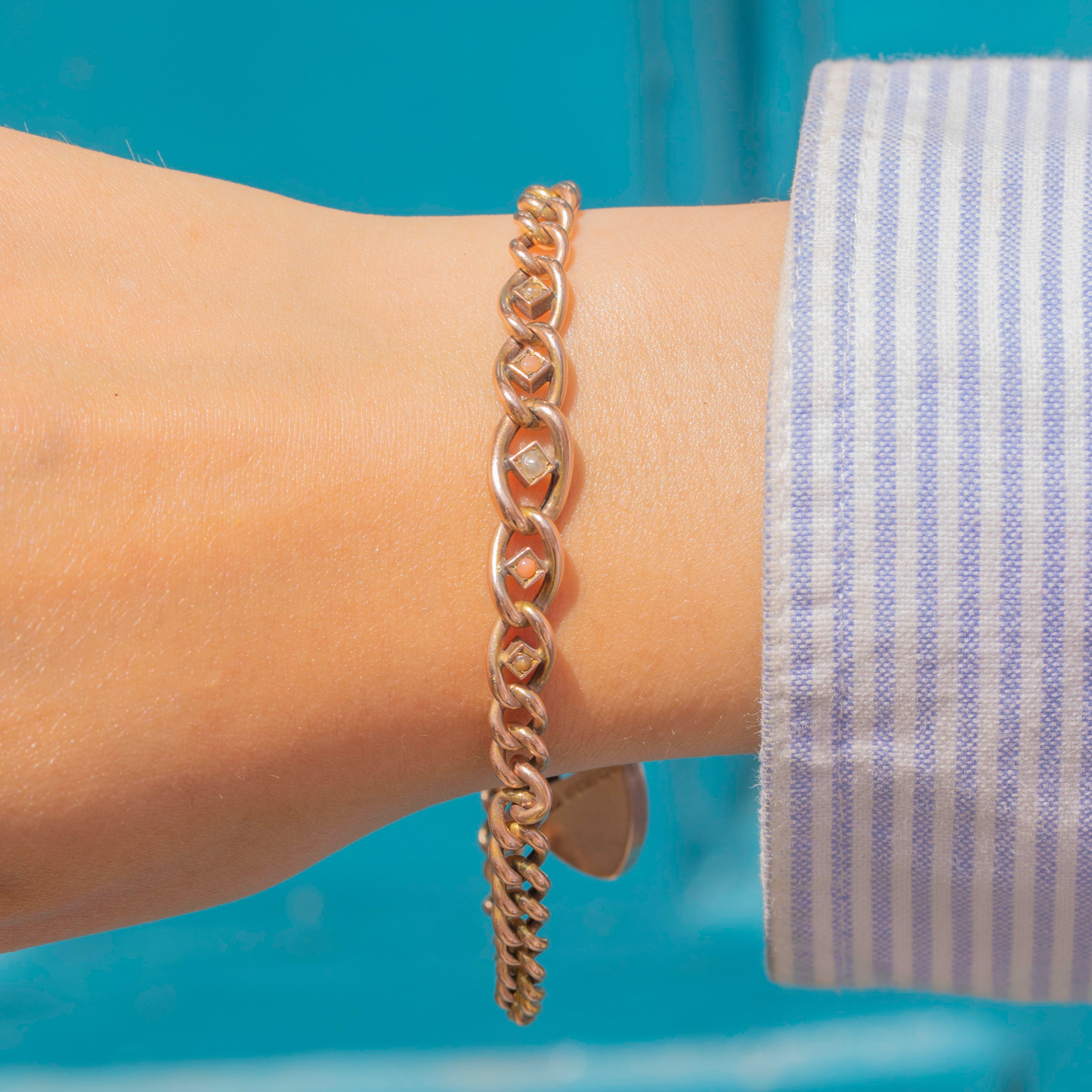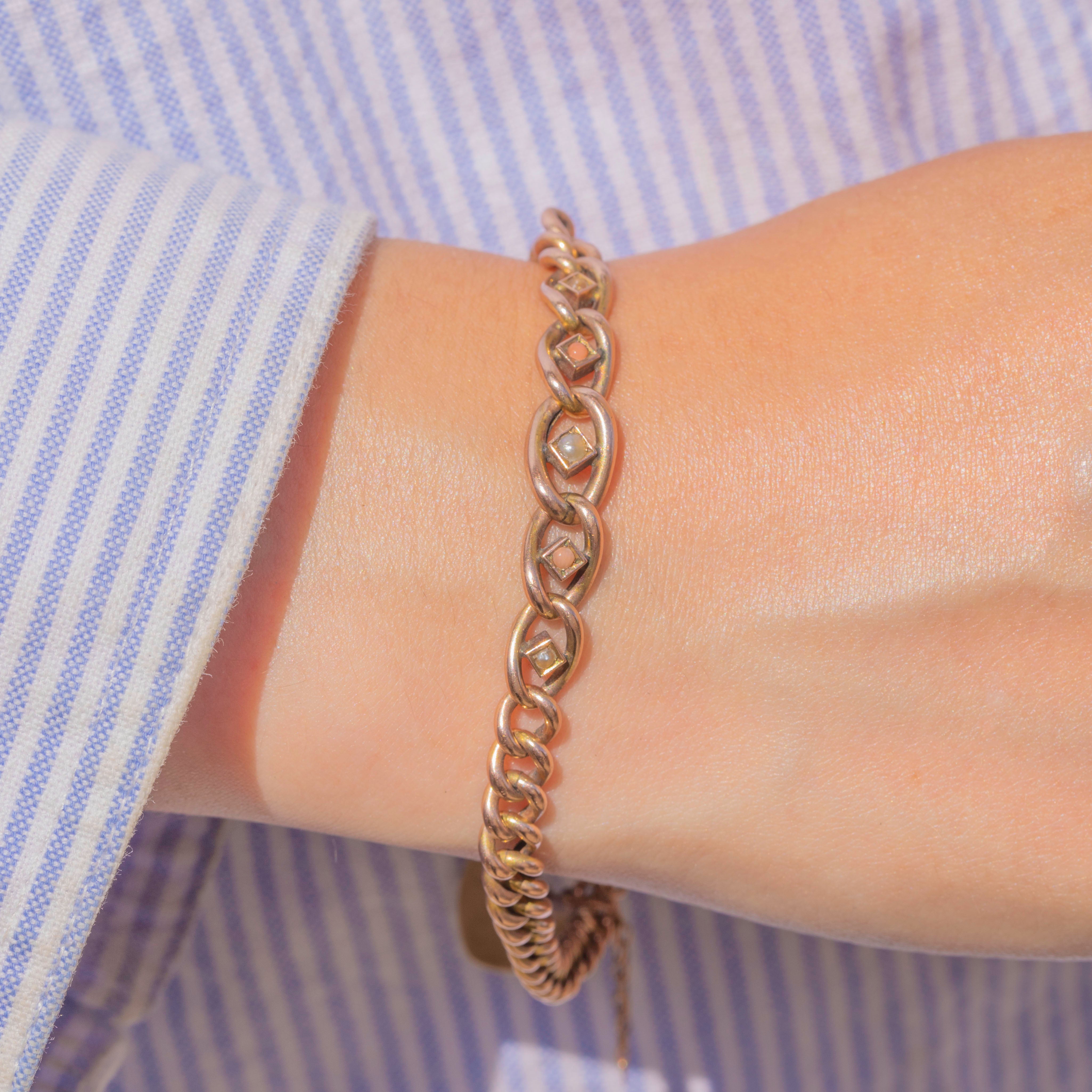 VERY GOOD:  This Edwardian 9ct Gold Coral Pearl graduating curb link bracelet is in very good condition. The Gold is buttery with a gorgeous rosy hue, and each link is securely connected, with only minor discolouration on the back. The gems are all present, and although some have surface wear, they remain securely set. The padlock is fully functional and closes securely, so you can enjoy wearing this antique Coral Pearl bracelet with utmost confidence!
