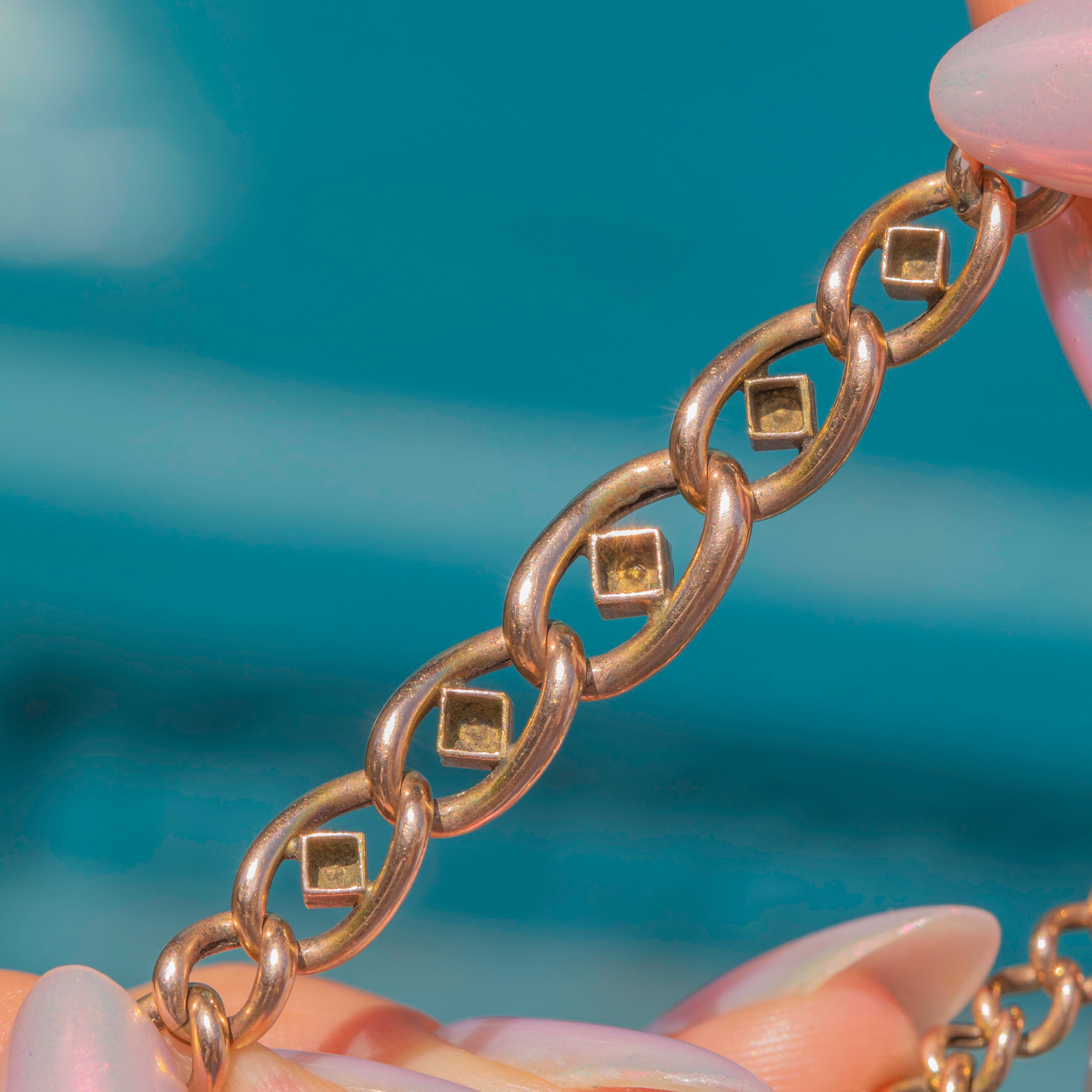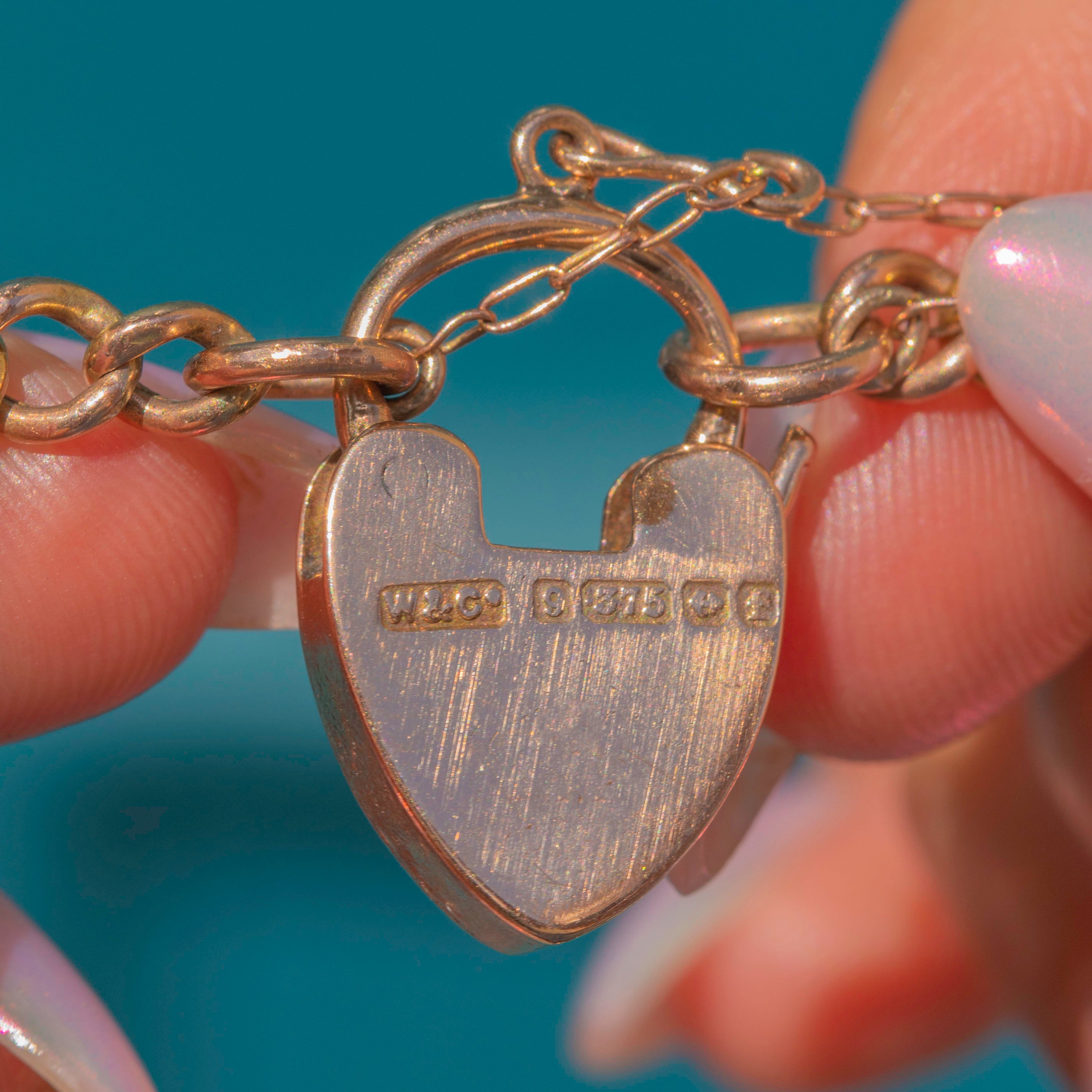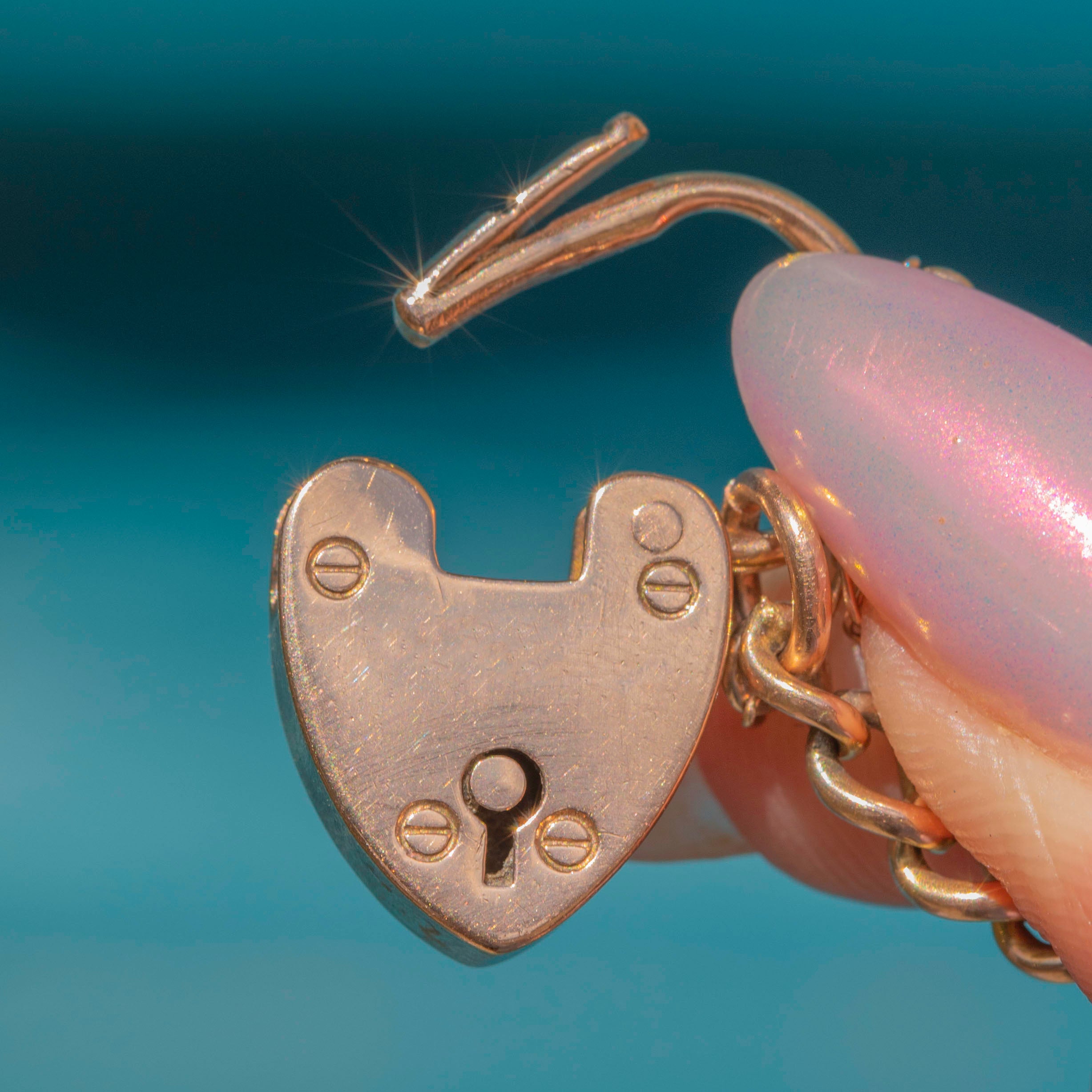 This Edwardian 9ct Gold Coral Pearl graduating curb link bracelet is a sumptuous piece of wrist candy! The soft, curb links are crafted from solid 9ct Gold, wrapping around your wrist with undeniable luxury and fastened by a sweet heart padlock.