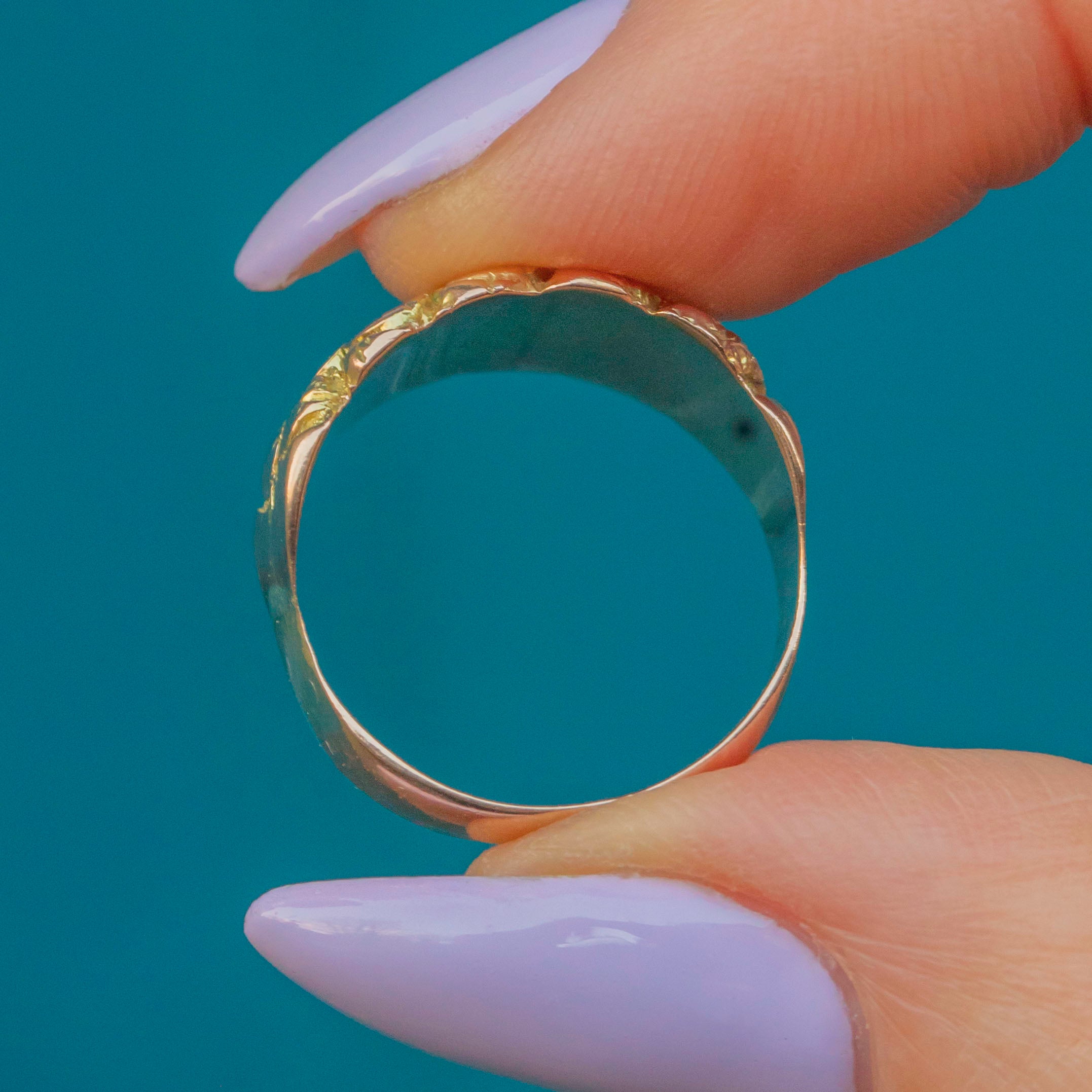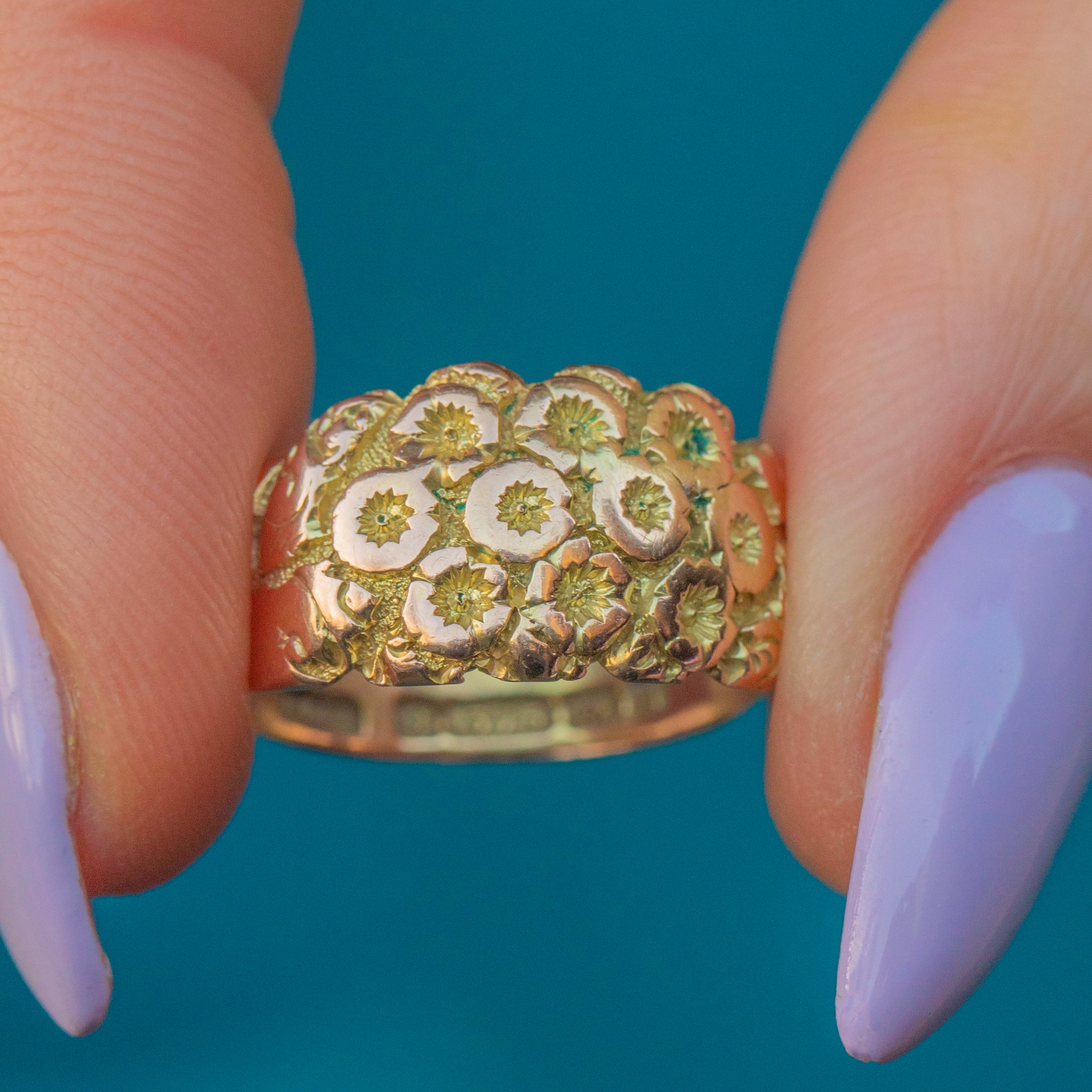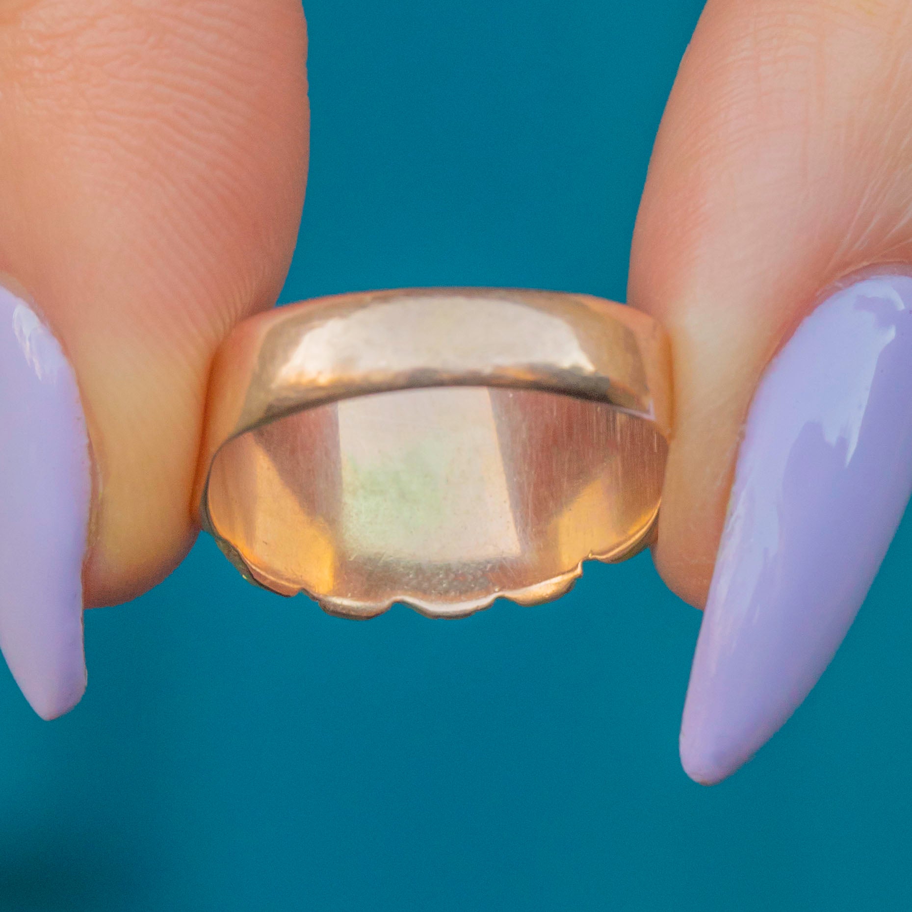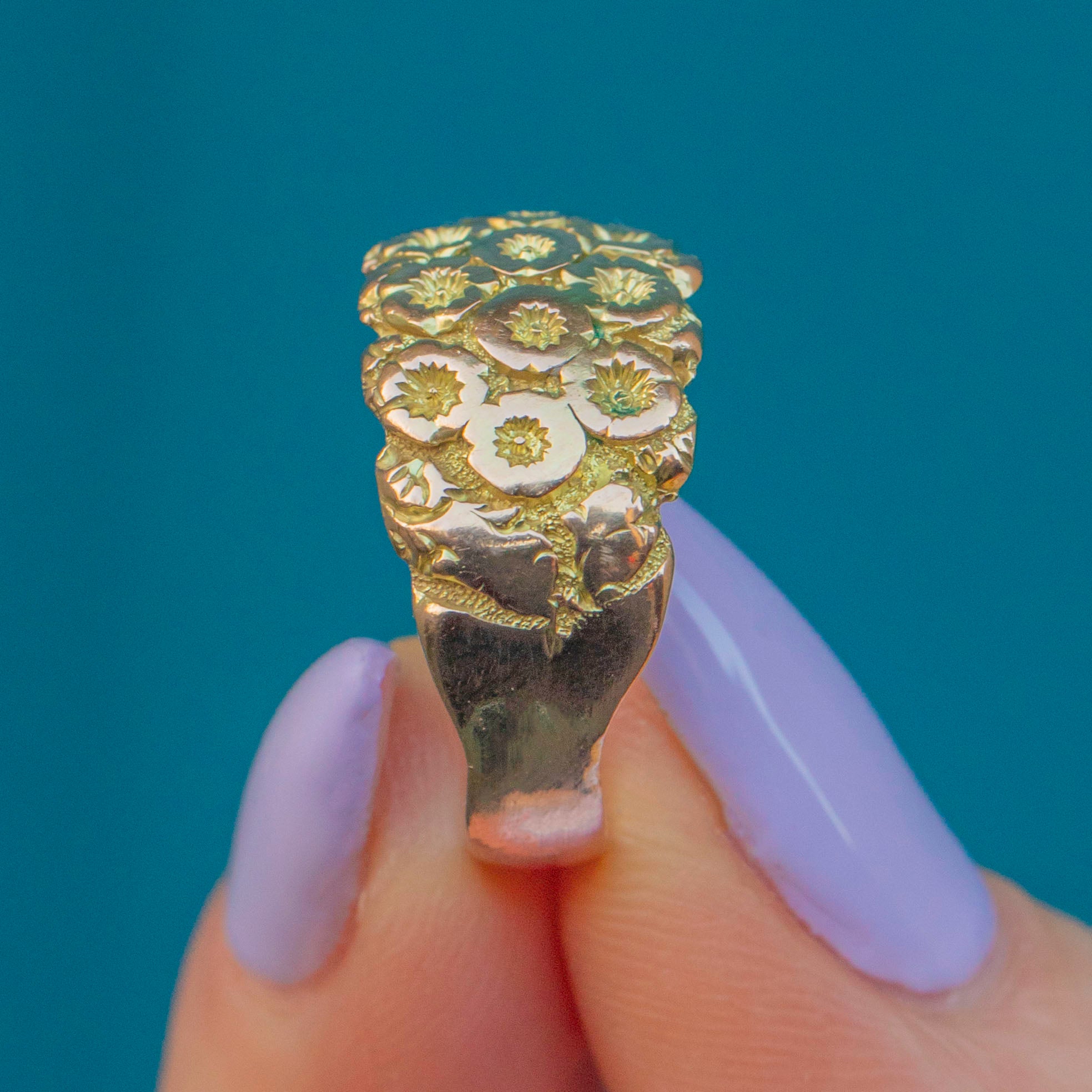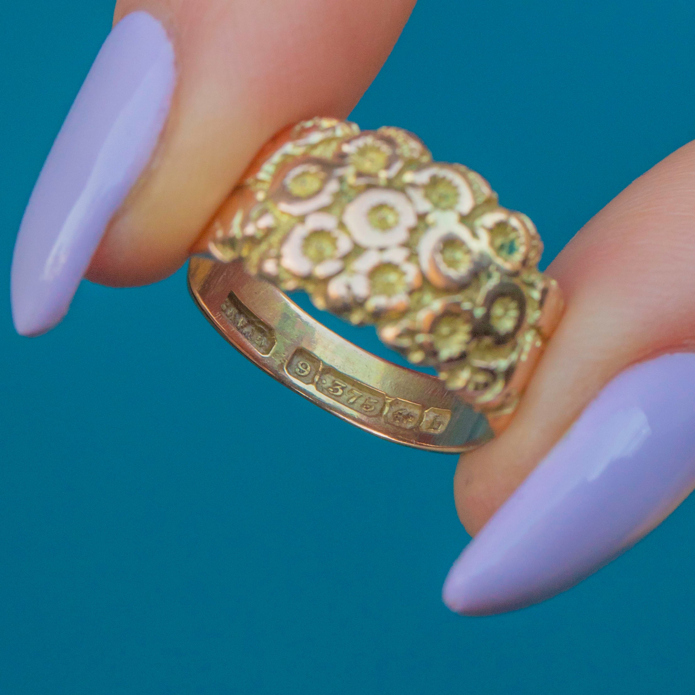 This Edwardian 9ct Gold floral engraved chunky ring looks gorgeous on the finger!
