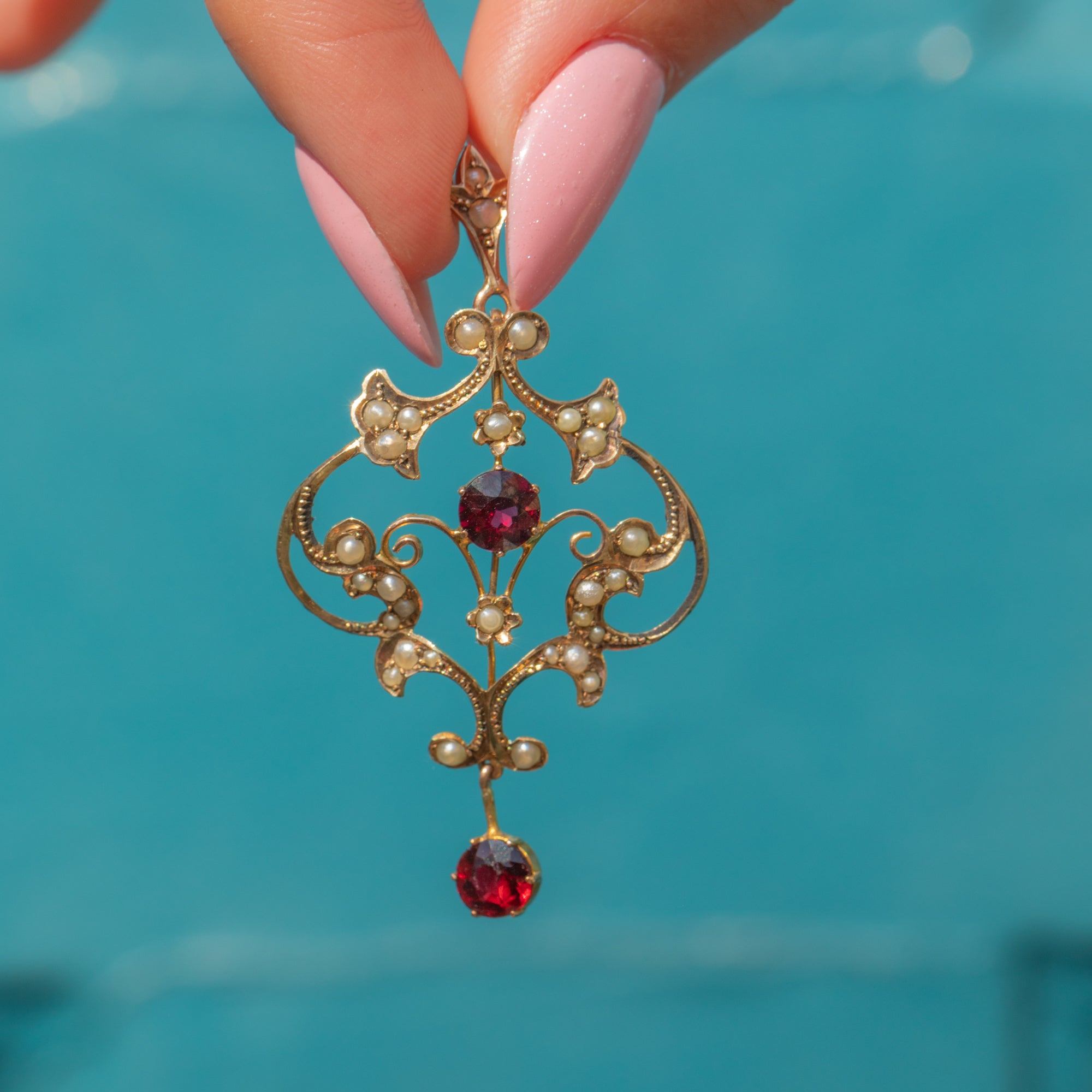 Edwardian 9ct Gold Garnet Pearl Lavalier Pendant