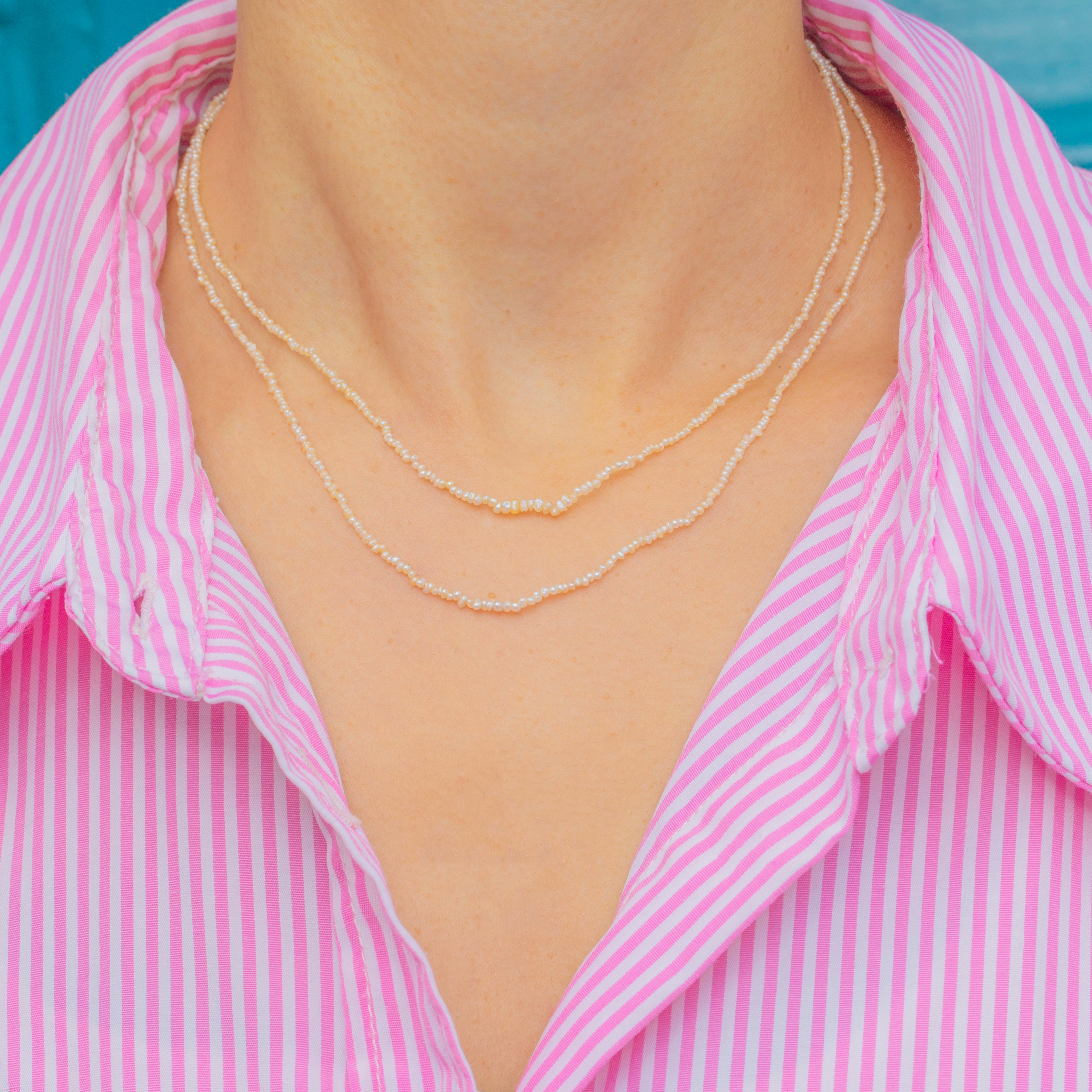 An elegant Edwardian-era necklace featuring two dainty strands of natural Pearls, each subtly graduated and layered to create a delicate, refined effect.