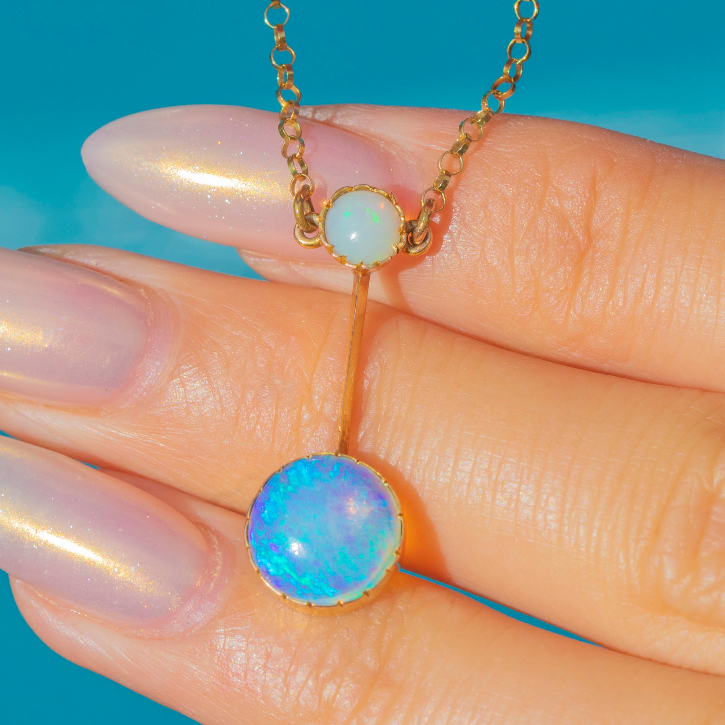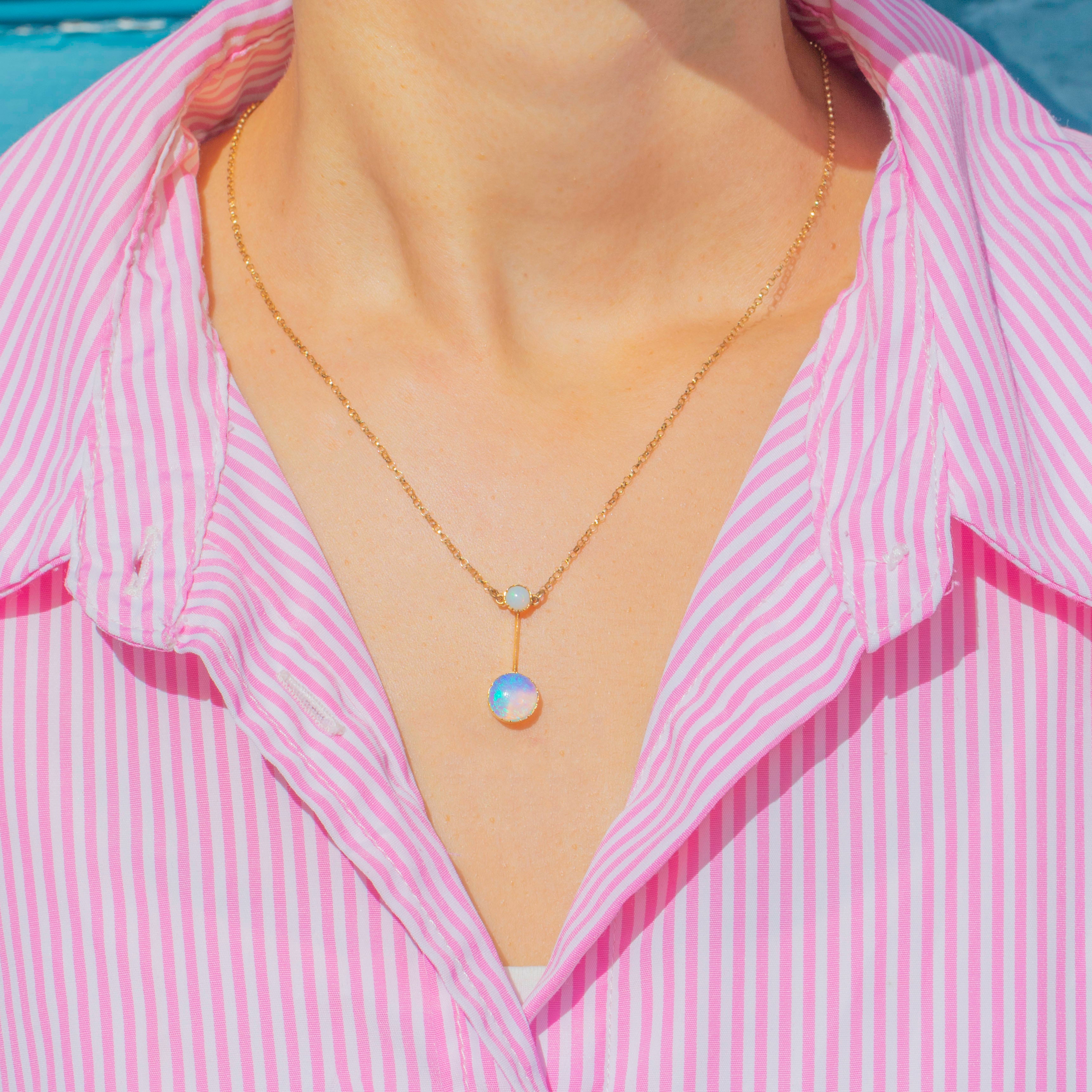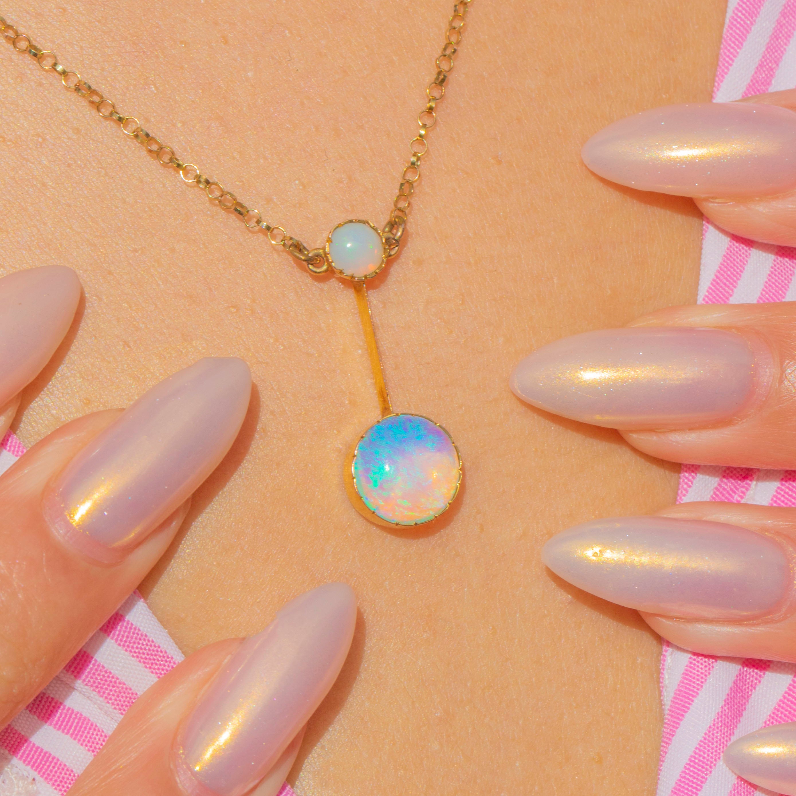 The larger Opal displays billowing orange, lilac, and flashes of neon blue, while the smaller Opal above shows a glowing orange base with minty green play-of-colour. Suspended from a delicate chain, this refined necklace exudes the romantic elegance and subtle whimsy of Edwardian jewellery.