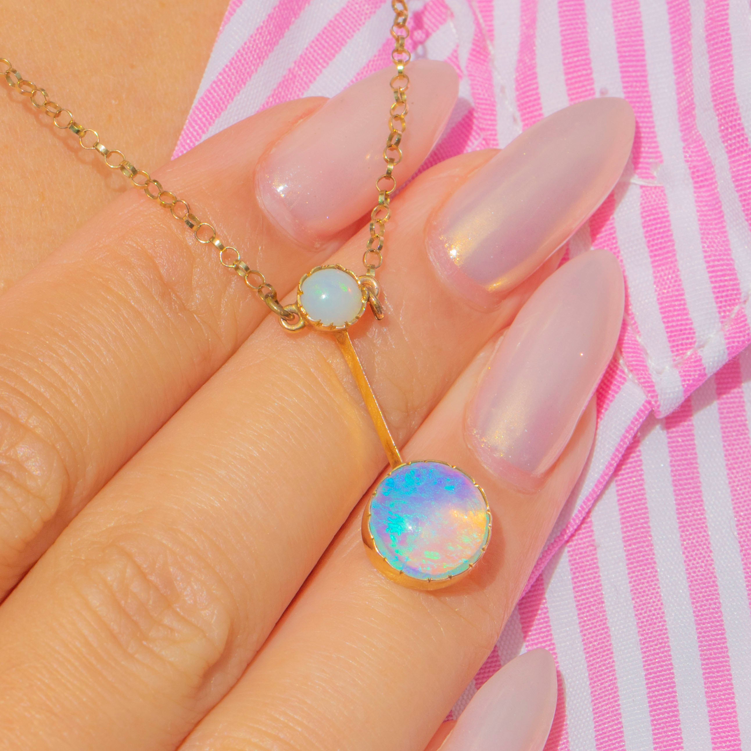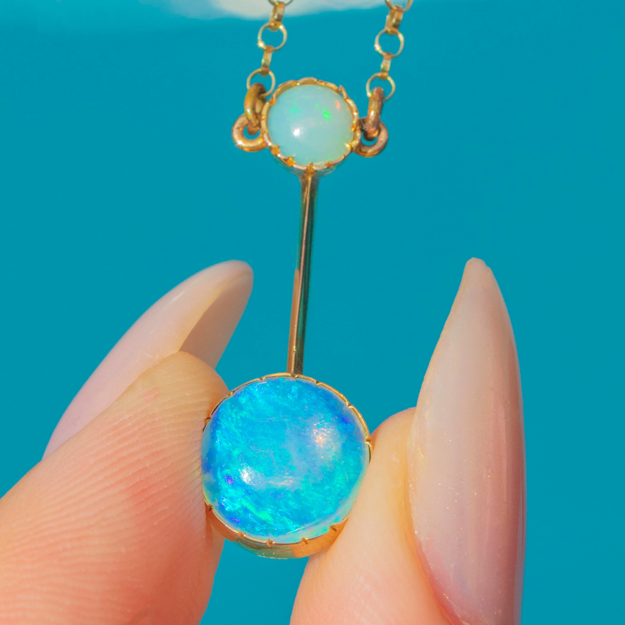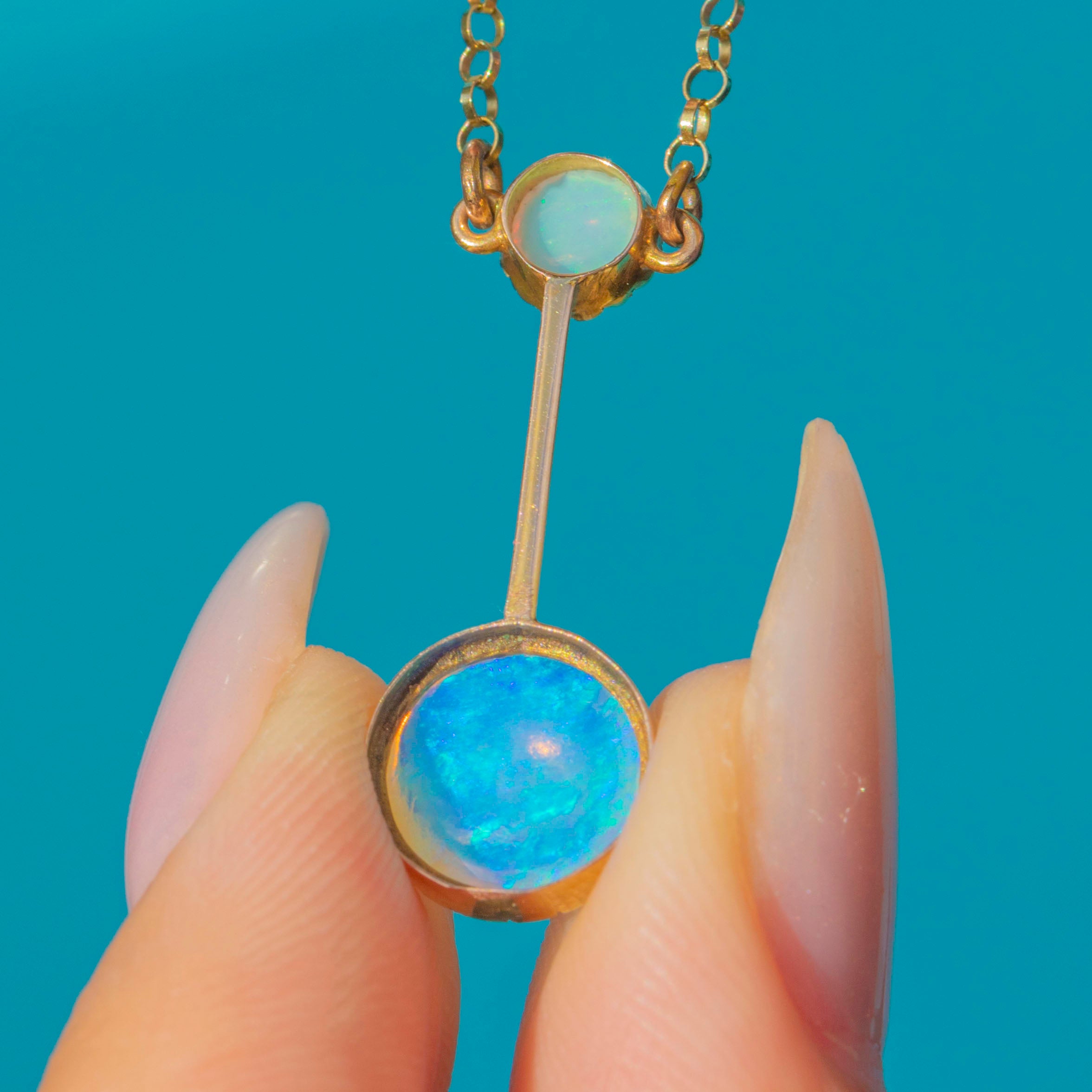 The larger Opal displays billowing orange, lilac, and flashes of neon blue, while the smaller Opal above shows a glowing orange base with minty green play-of-colour. Suspended from a delicate chain, this refined necklace exudes the romantic elegance and subtle whimsy of Edwardian jewellery.