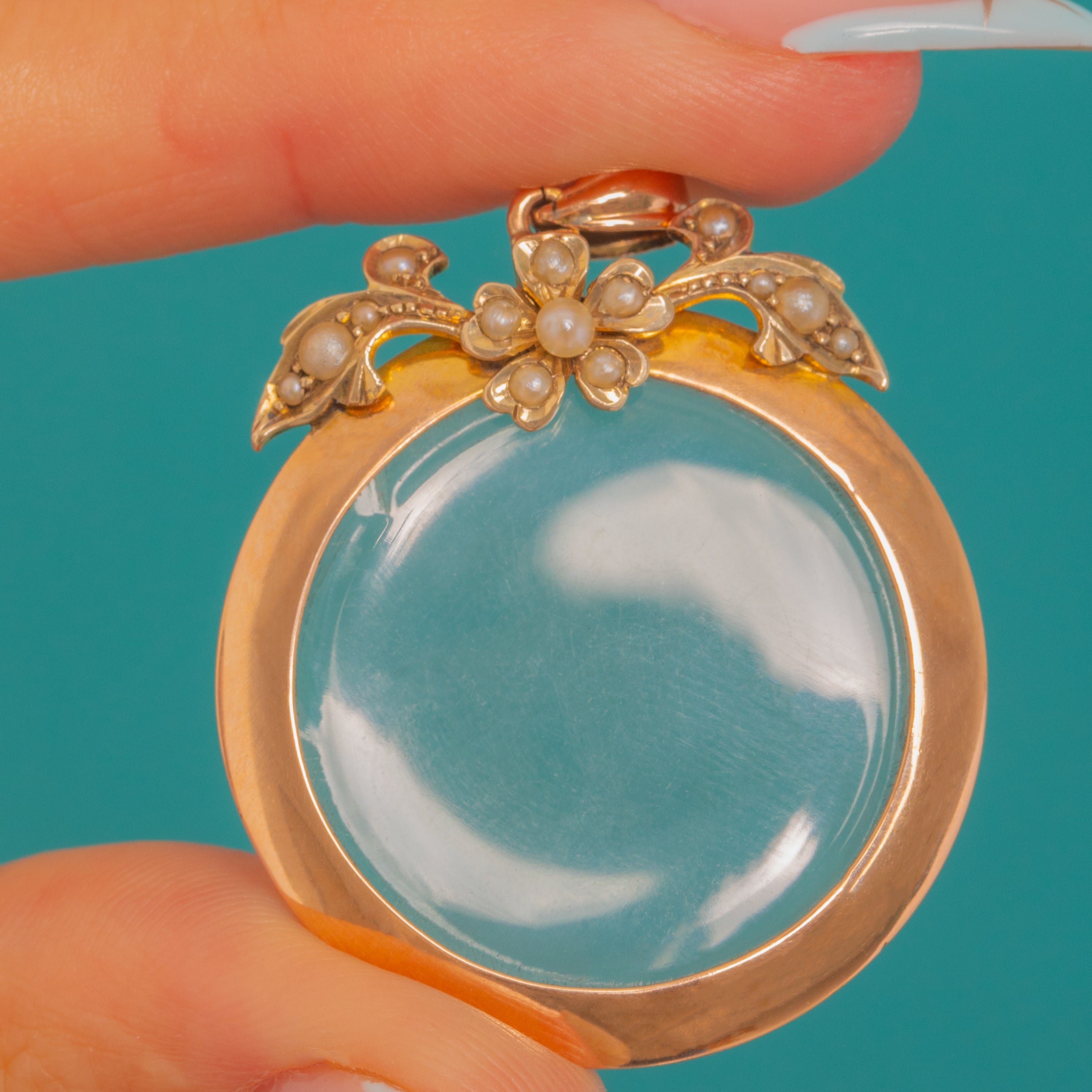 A delicate Edwardian picture locket in solid 9ct Gold, crowned with a charming Pearl flower. The smooth, rounded frame holds a beautifully clear, double‑domed window, creating an elegant, coin‑like silhouette that feels refined and romantic.
