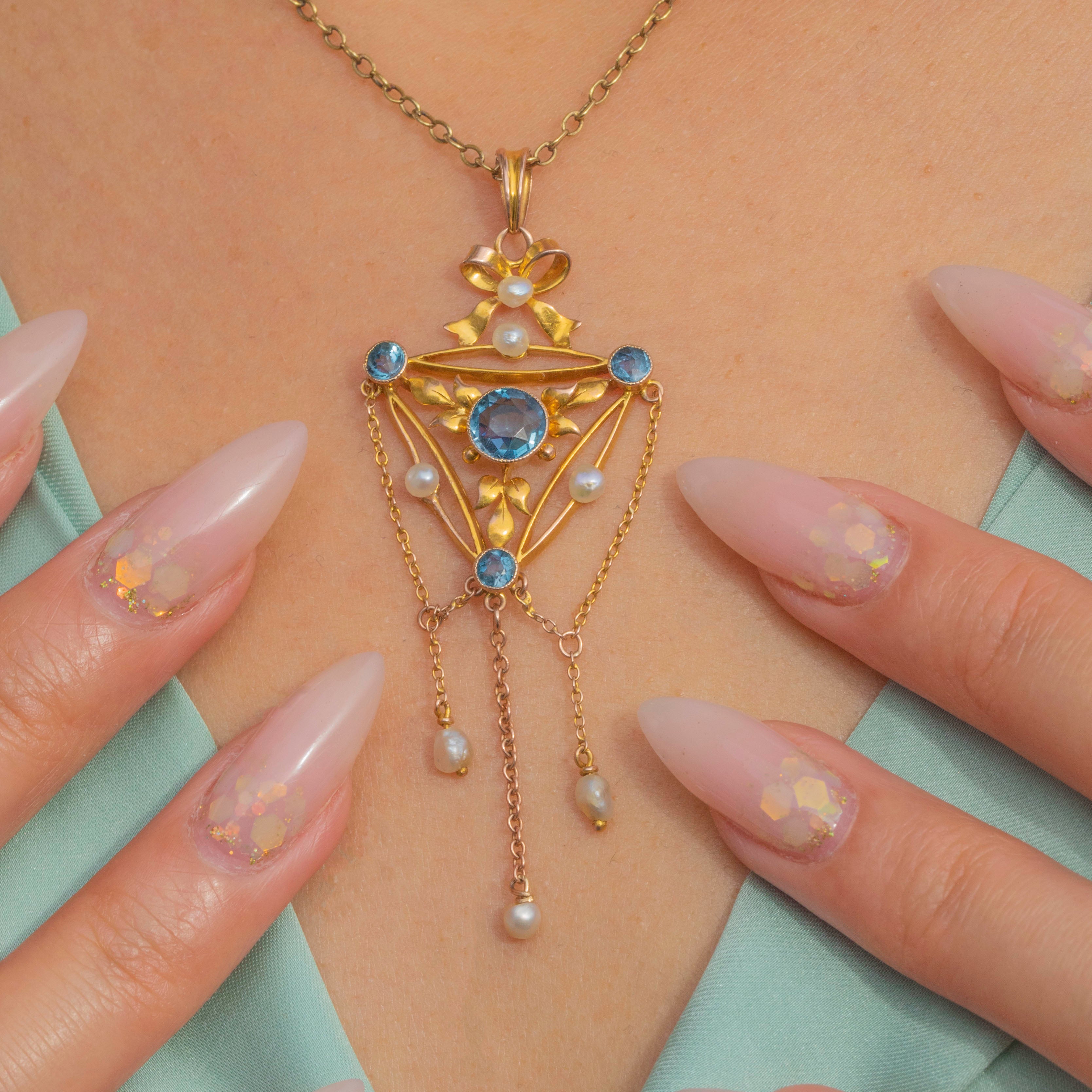 This beautiful Edwardian pendant has all the grace and elegance of the era. Crafted in 9ct Gold, the design centres on a delicate bow motif, set with lustrous Pearls and sparkling blue Paste gemstones. The openwork frame is adorned with foliate details, with dainty chains suspended from the base, each ending with a natural Pearl drop that sways gently with movement.