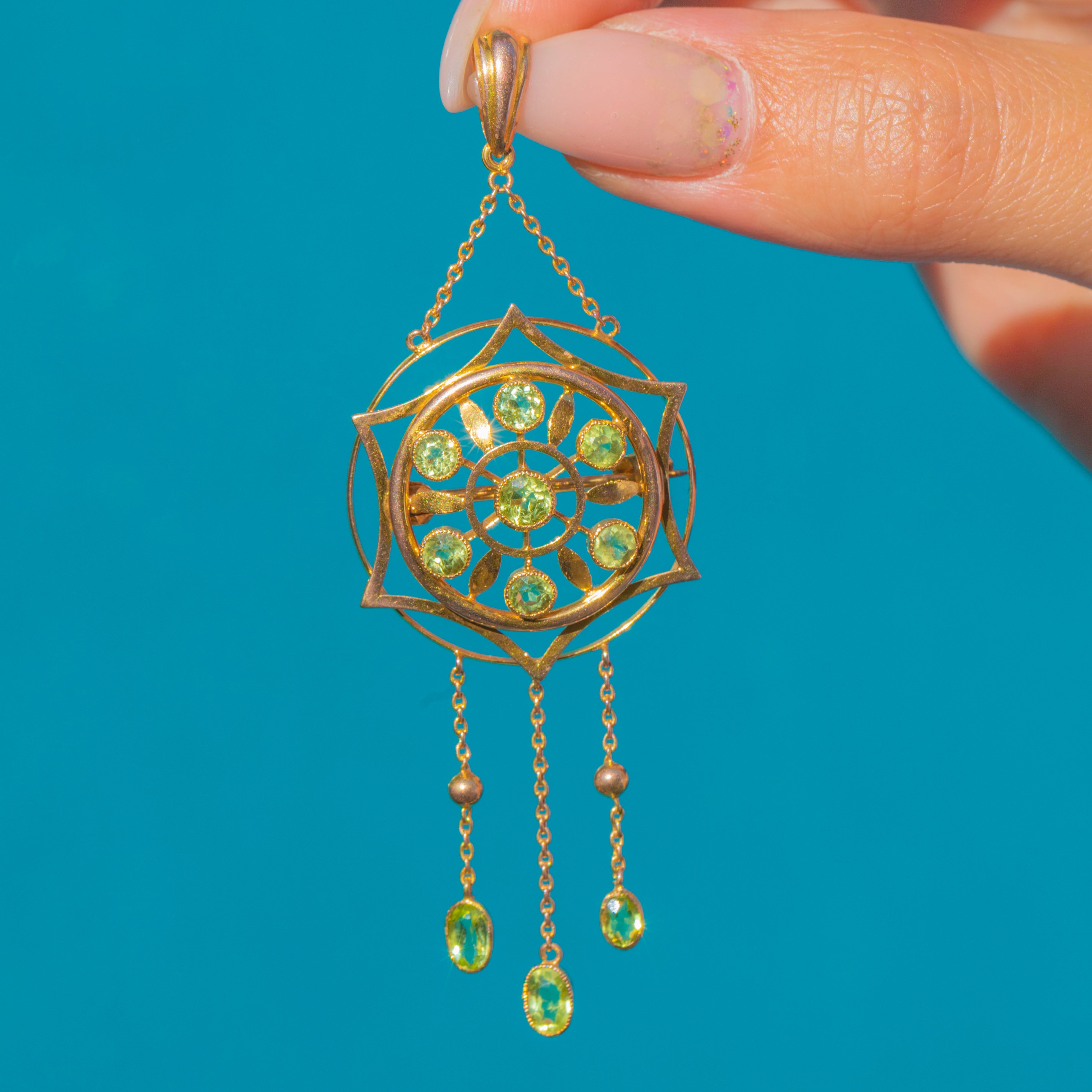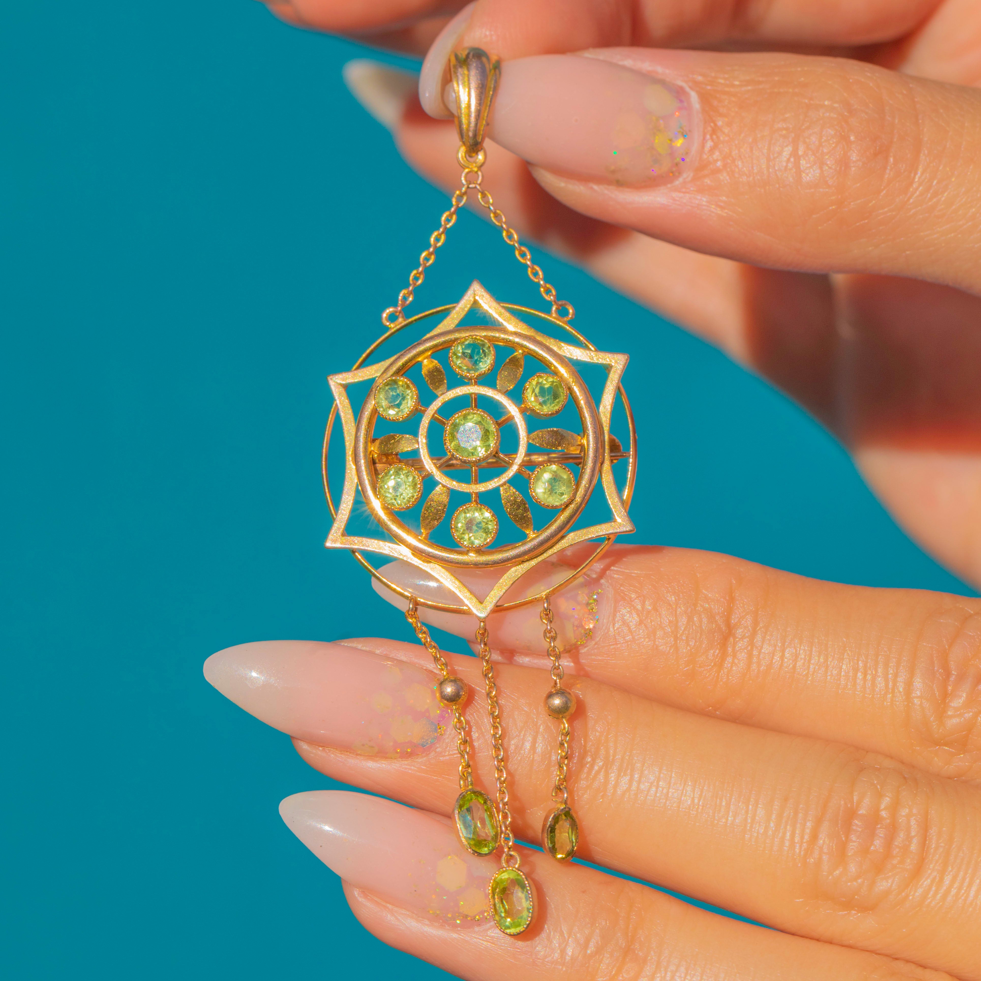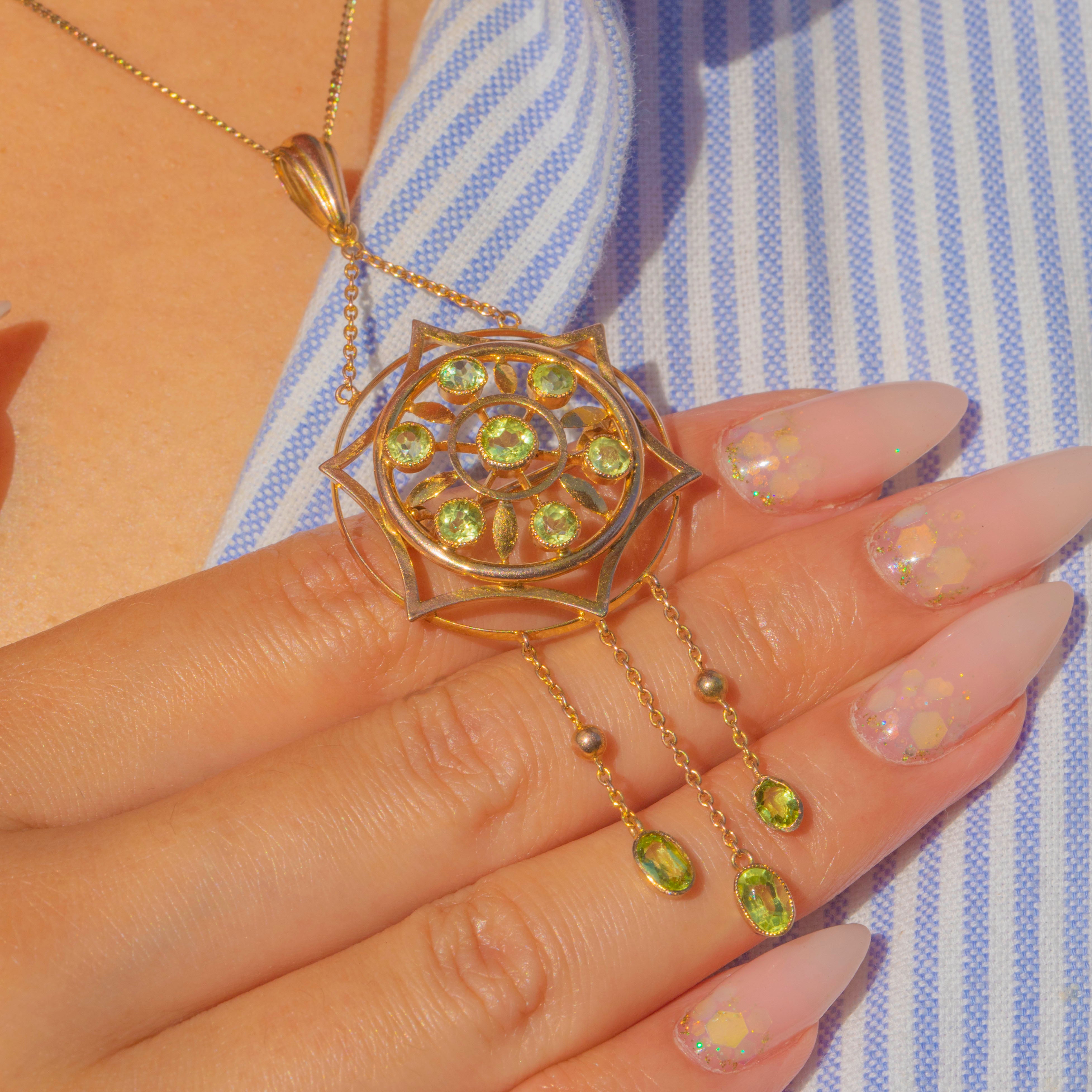 This exquisite Edwardian pendant is crafted in 9ct Yellow Gold and set with zingy green Peridots. Designed with a circular centrepiece resembling a starburst motif, the pendant is set with seven sparkling round Peridots radiating from the middle. From the base hang three delicate Gold chains, each suspending an oval Peridot drop, adding movement and elegance.