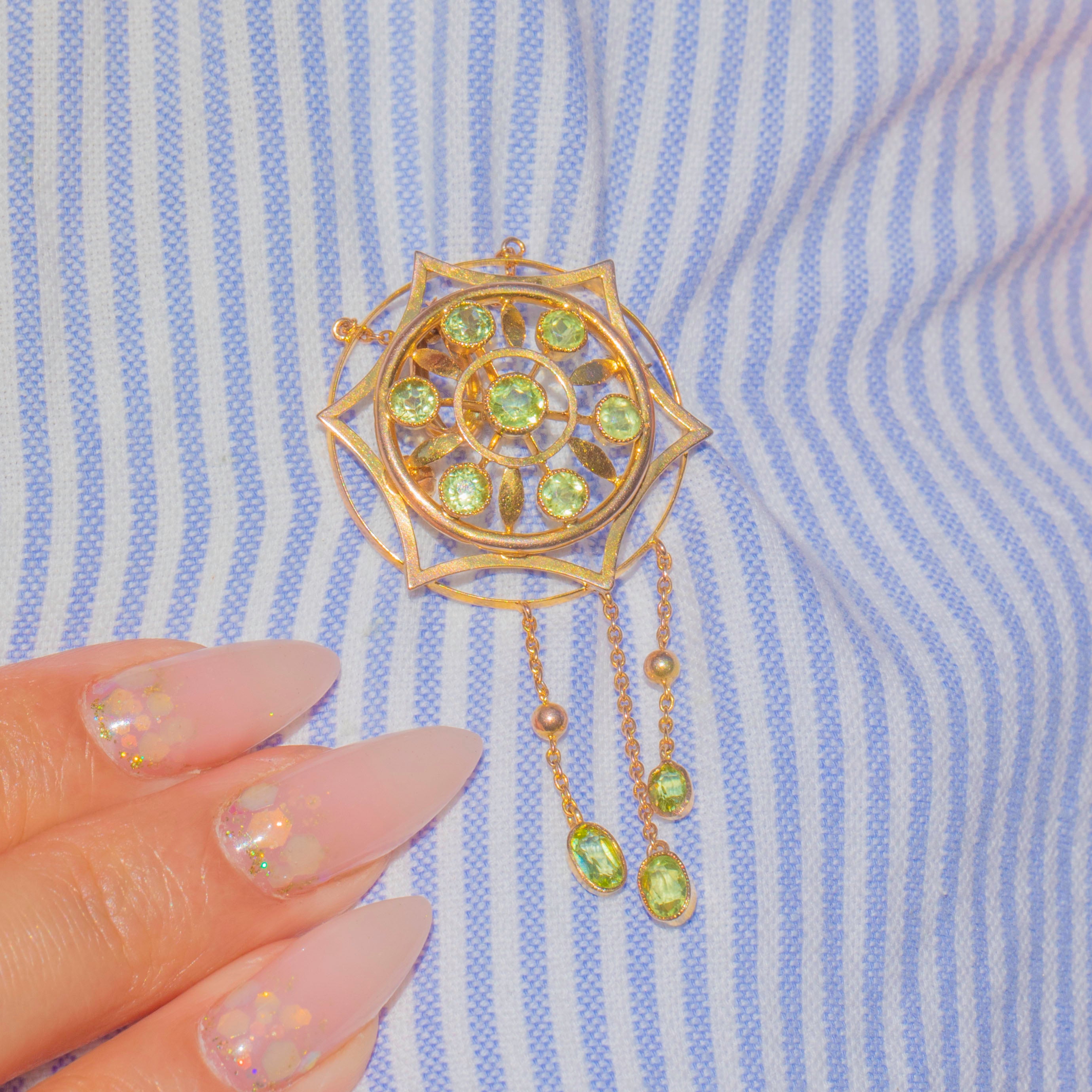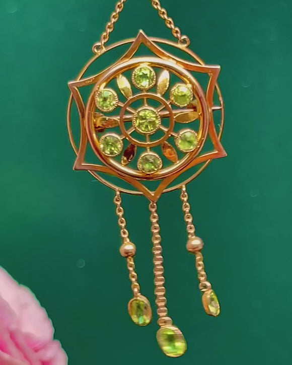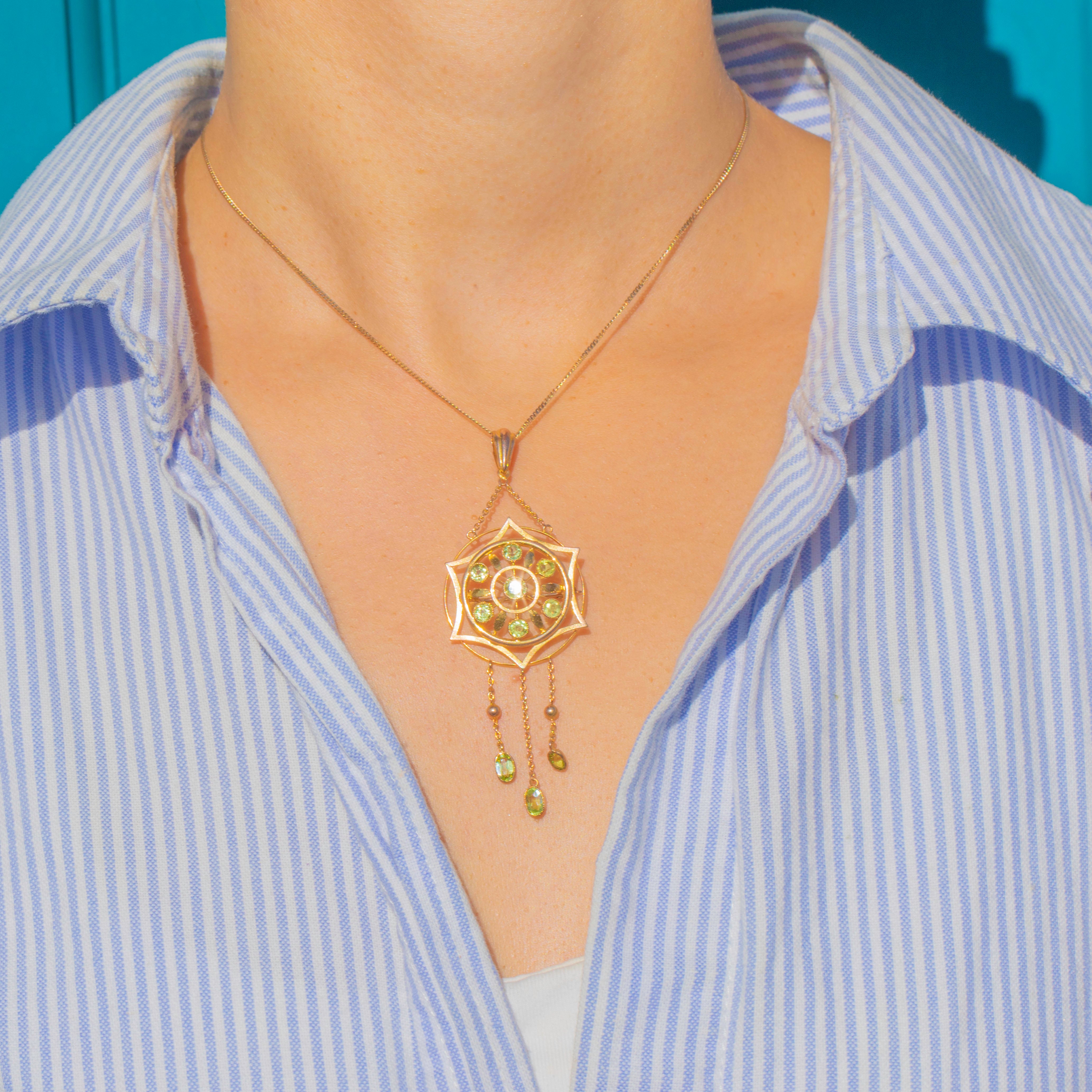 This exquisite Edwardian pendant is crafted in 9ct Yellow Gold and set with zingy green Peridots. Designed with a circular centrepiece resembling a starburst motif, the pendant is set with seven sparkling round Peridots radiating from the middle. From the base hang three delicate Gold chains, each suspending an oval Peridot drop, adding movement and elegance.