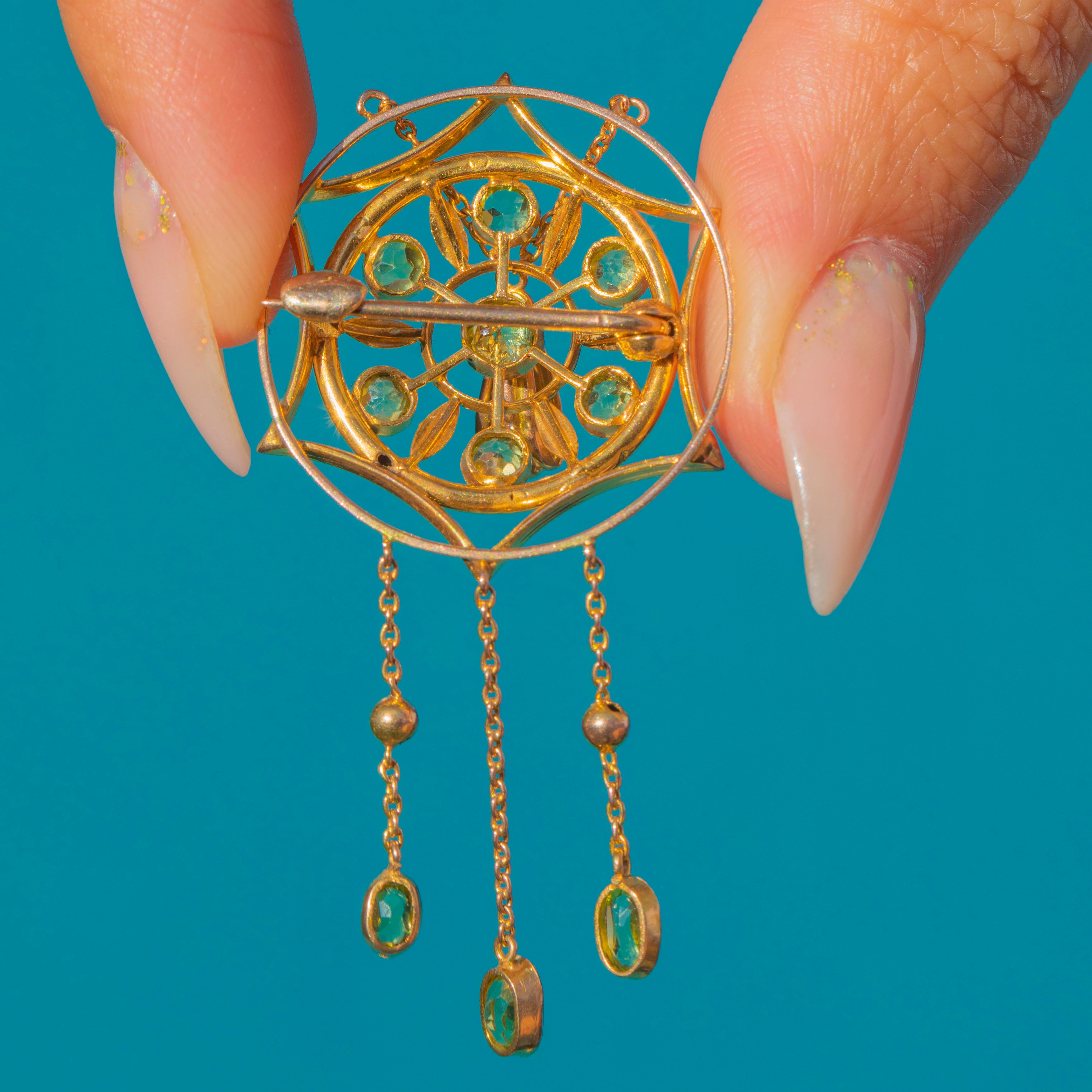 The Gold has a bright, rich colour with the appearance of higher carat Gold, complementing the lively apple-green gemstones beautifully. Complete with its original “9CT” stamped bale and brooch fittings to the reverse, this versatile jewel can be worn as both pendant and brooch, making it a fabulous addition to any antique jewellery collection.
