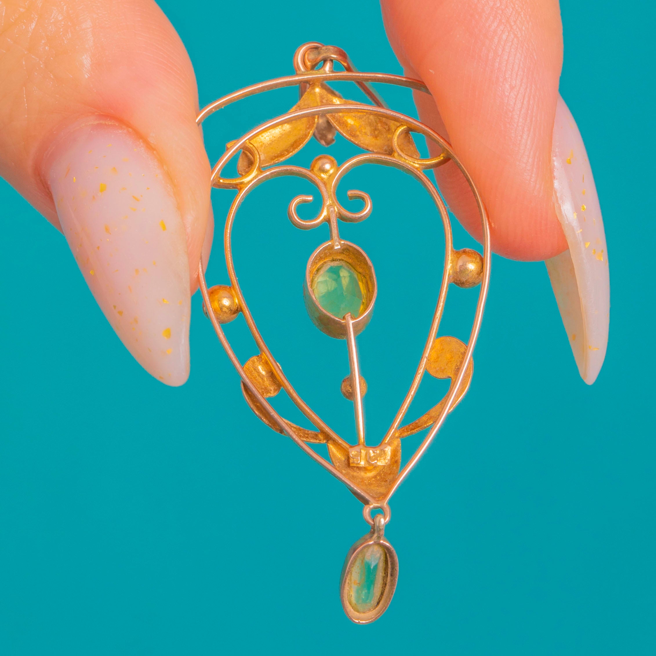 A romantic Edwardian lavalier pendant crafted in 9ct Gold, this piece traces graceful whiplash curves into a delicate openwork heart. Tiny foliate and bead accents add texture and movement, while a lively apple-green Peridot glows at the centre.