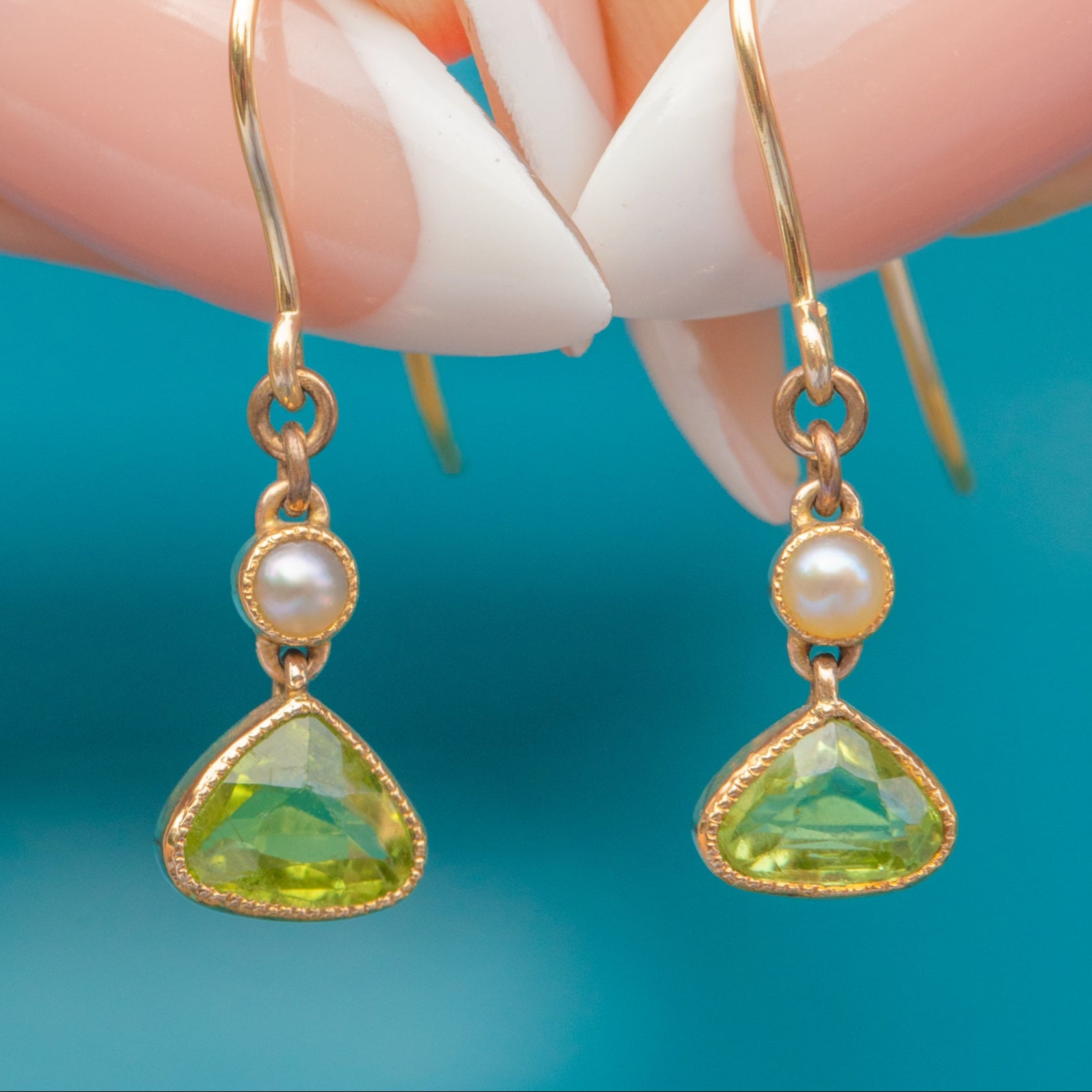 The Peridots are beautifully cut, displaying their lively olive-green hue, while the Pearls add a subtle glow. Lightweight and easy to wear, these earrings bring an elegant antique touch to any outfit.