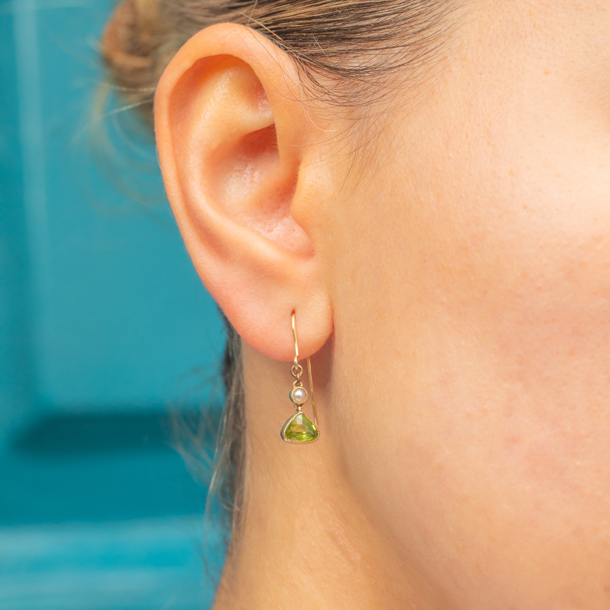 A dainty pair of antique drop earrings crafted in 9ct Gold, each set with a fresh green Peridot and creamy Pearl. The delicate design combines colour and luminosity, capturing the lightness and femininity characteristic of the Edwardian era.