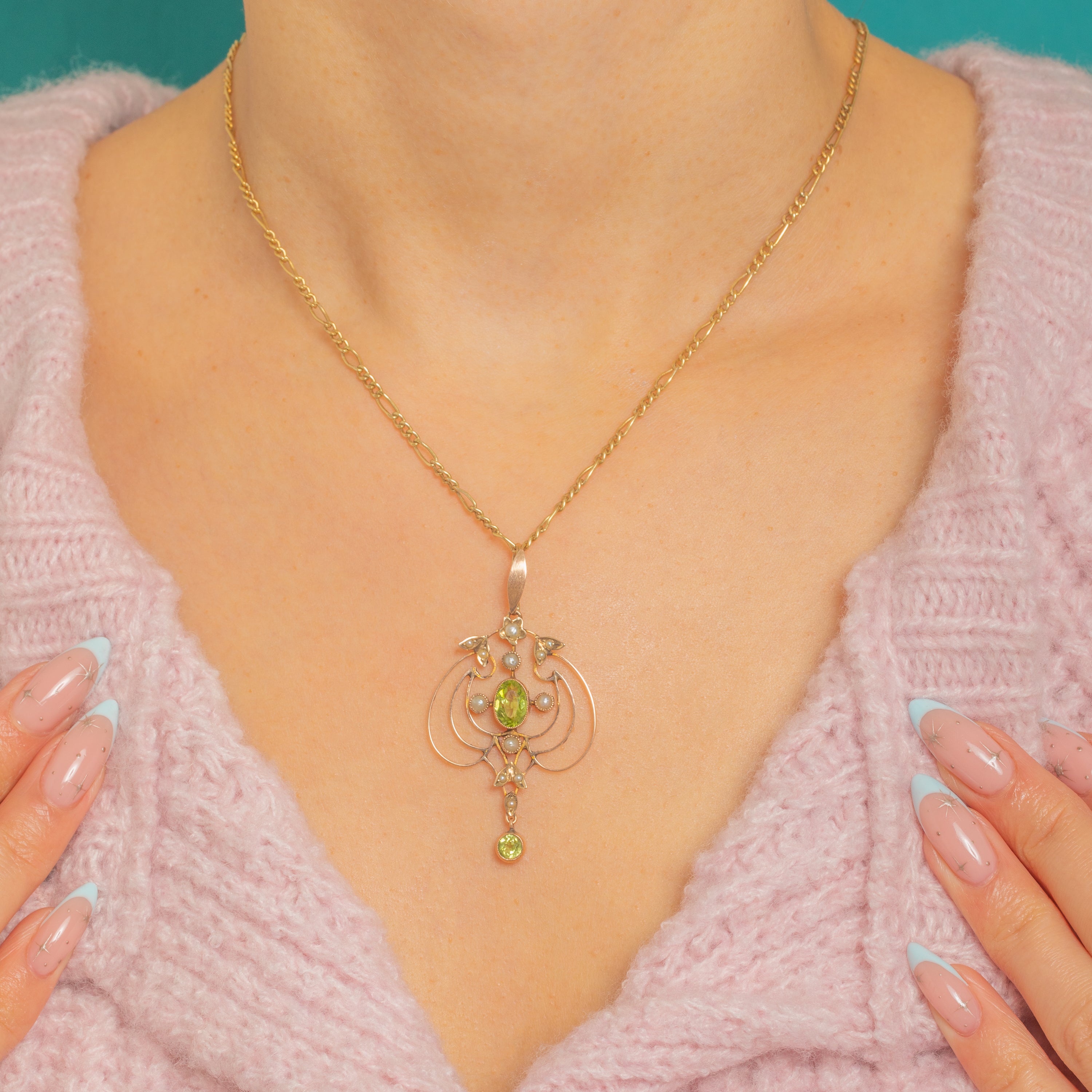 A graceful Edwardian pendant crafted in 9ct Gold, its airy openwork traced with flowing whiplash curves and tiny foliate accents. At the heart glows an oval Peridot in a fine milgrain collet, its fresh apple-green hue echoed by a dainty round Peridot drop that dances below. Creamy Pearls are dotted across the design, lending soft lustre against the warm Gold.