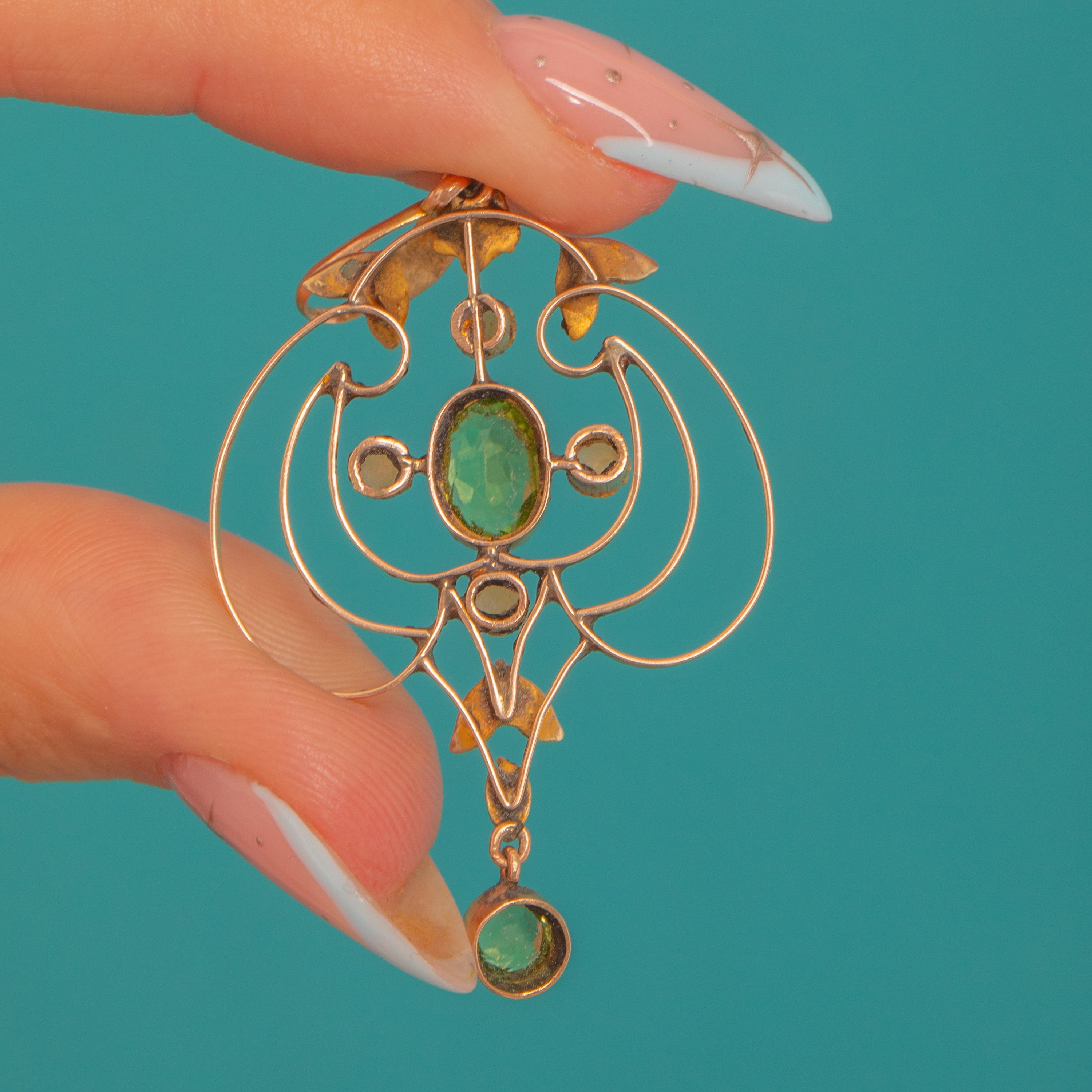 VERY GOOD: The Peridots are bright and lively with no obvious chips or abrasions; Pearls are intact with gentle, natural variation to their surfaces and lustre. The openwork Gold and milgrain collets are secure with light surface wear and a soft patina consistent with age. The articulated drop moves freely and the pendant bail are in good working order.