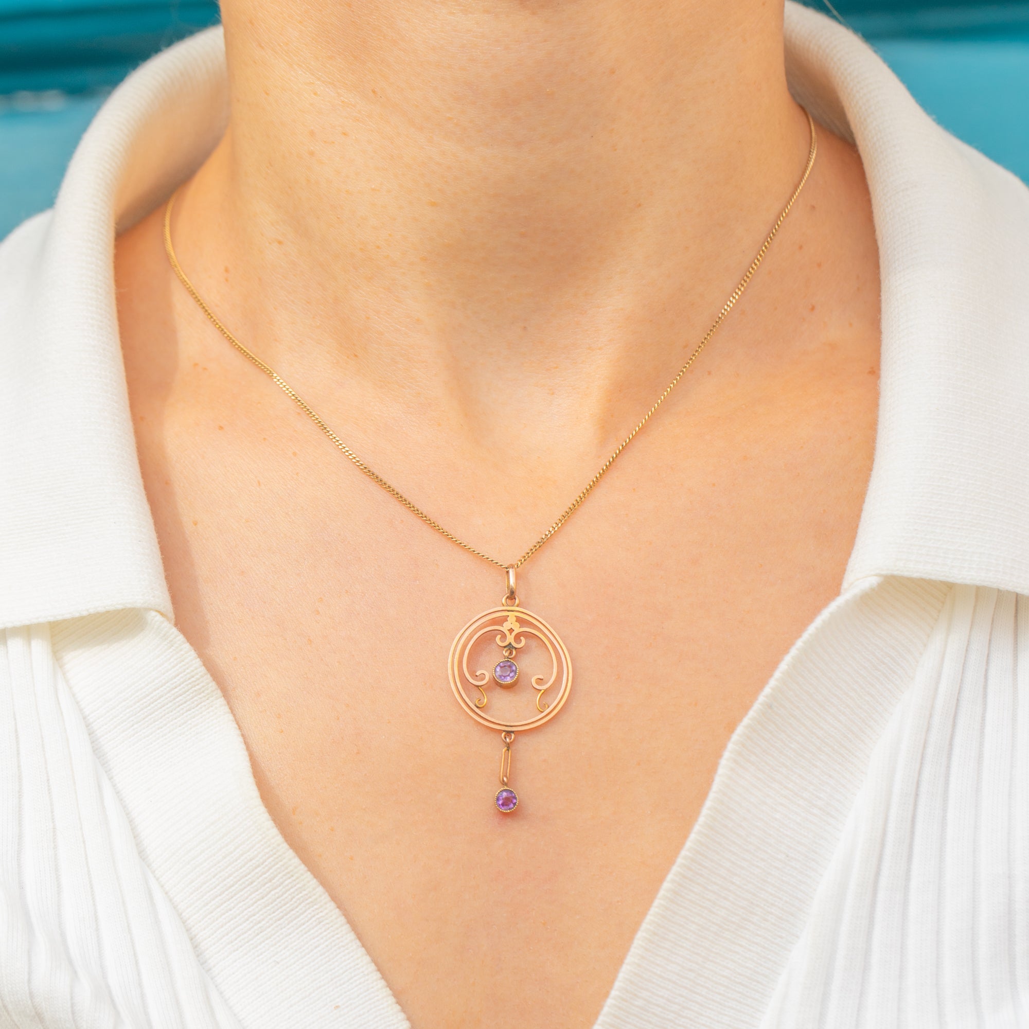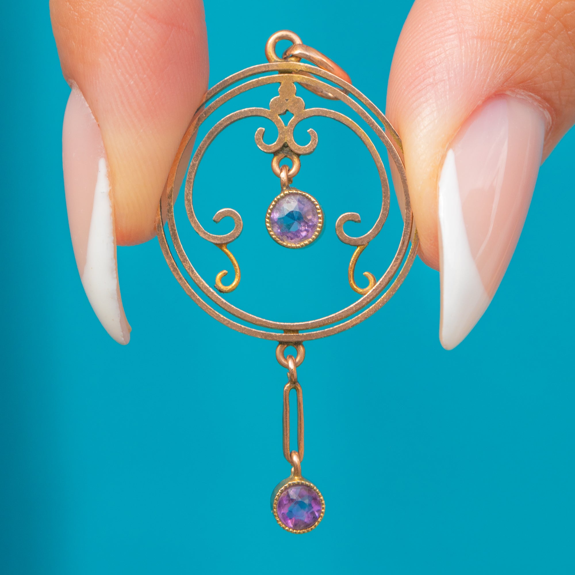 Their lively violet colour catches the light beautifully, giving this elegant jewel wonderful movement and sparkle. A perfect pendant for lovers of refined antique jewellery and timeless Edwardian style.