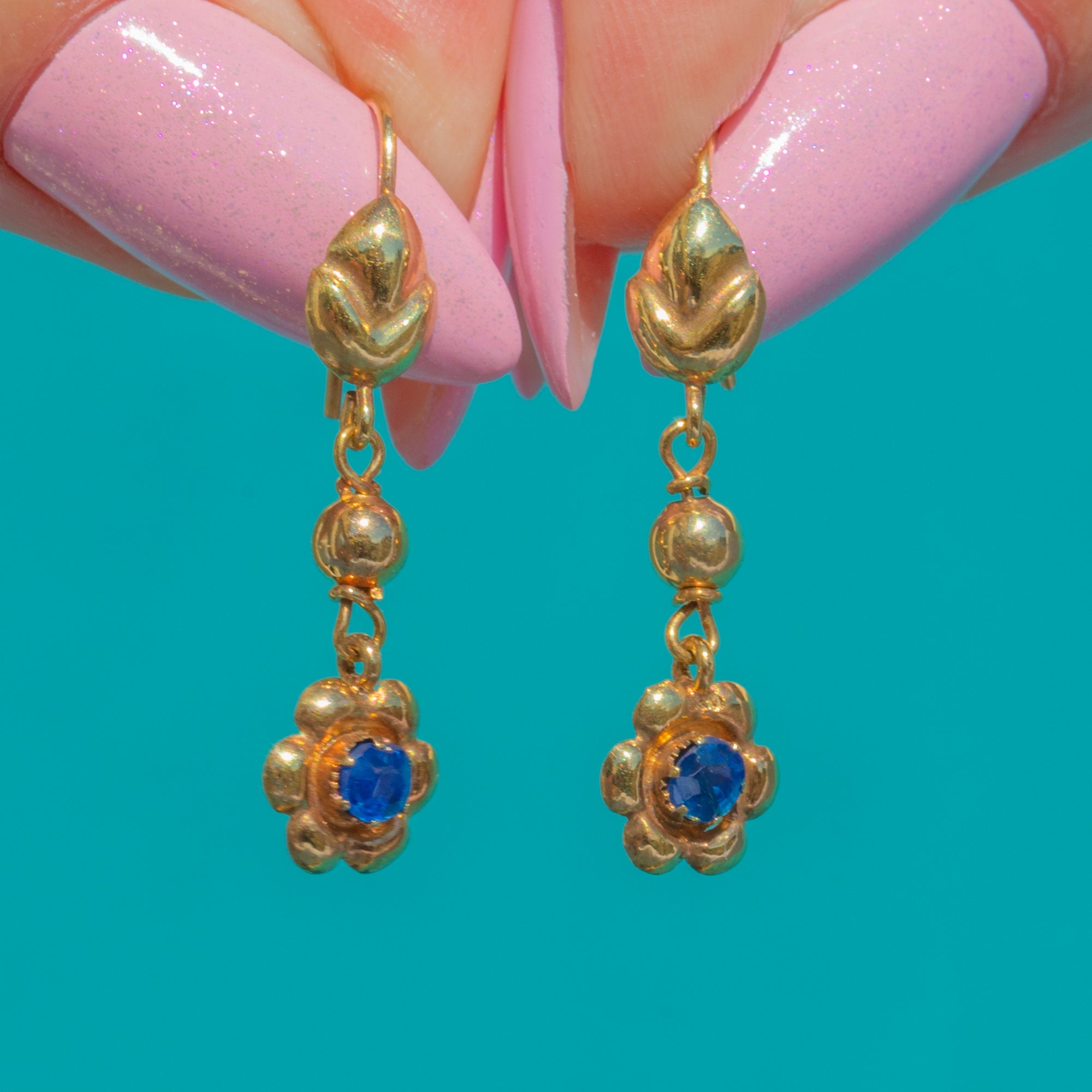 These antique Edwardian drop earrings are a charmingly delicate pair, crafted in rich 9ct Gold and set with vivid blue Sapphires. Each earring is formed with a graceful hooked top, a polished Gold bead, and a sweet flower-shaped drop centred with a sparkling Sapphire.