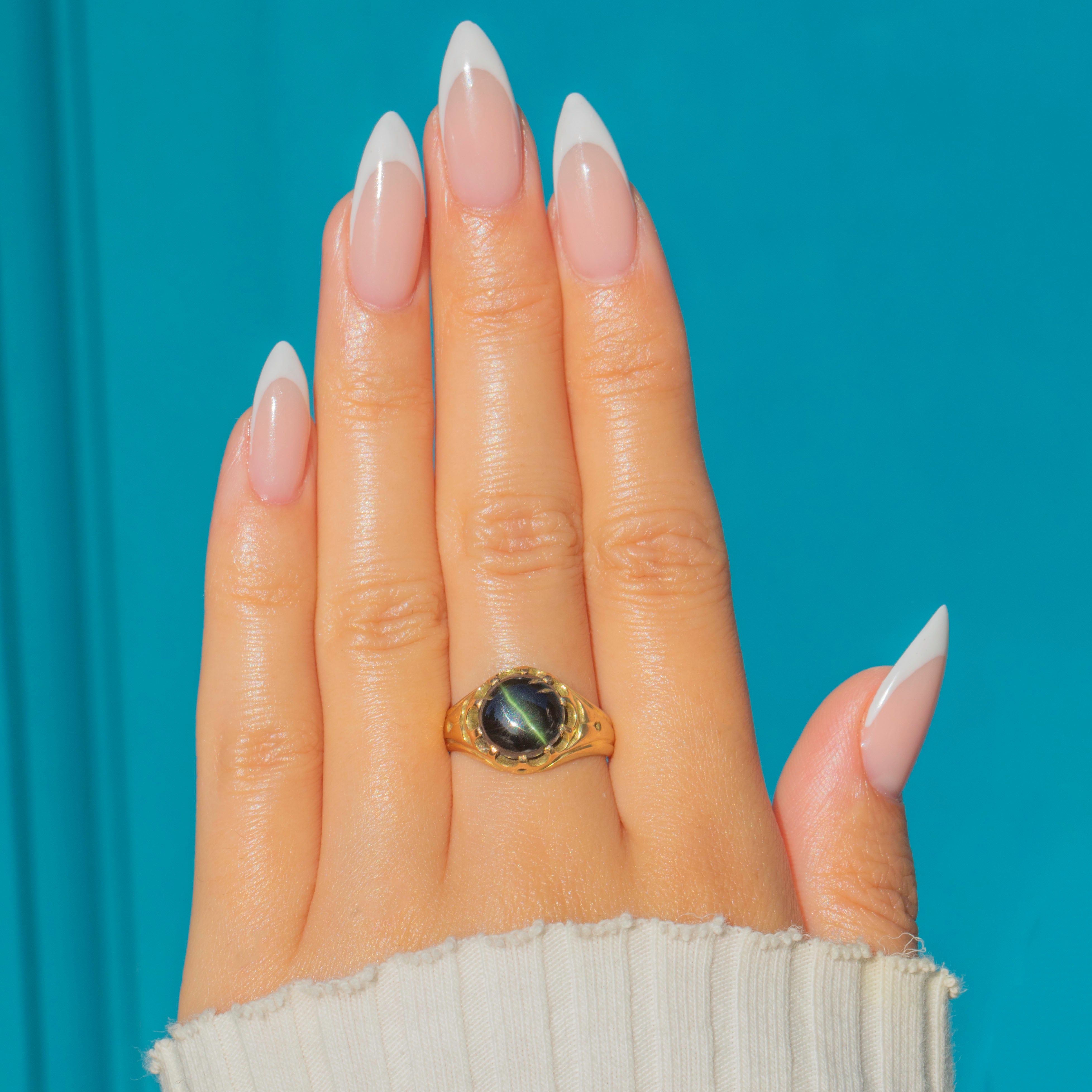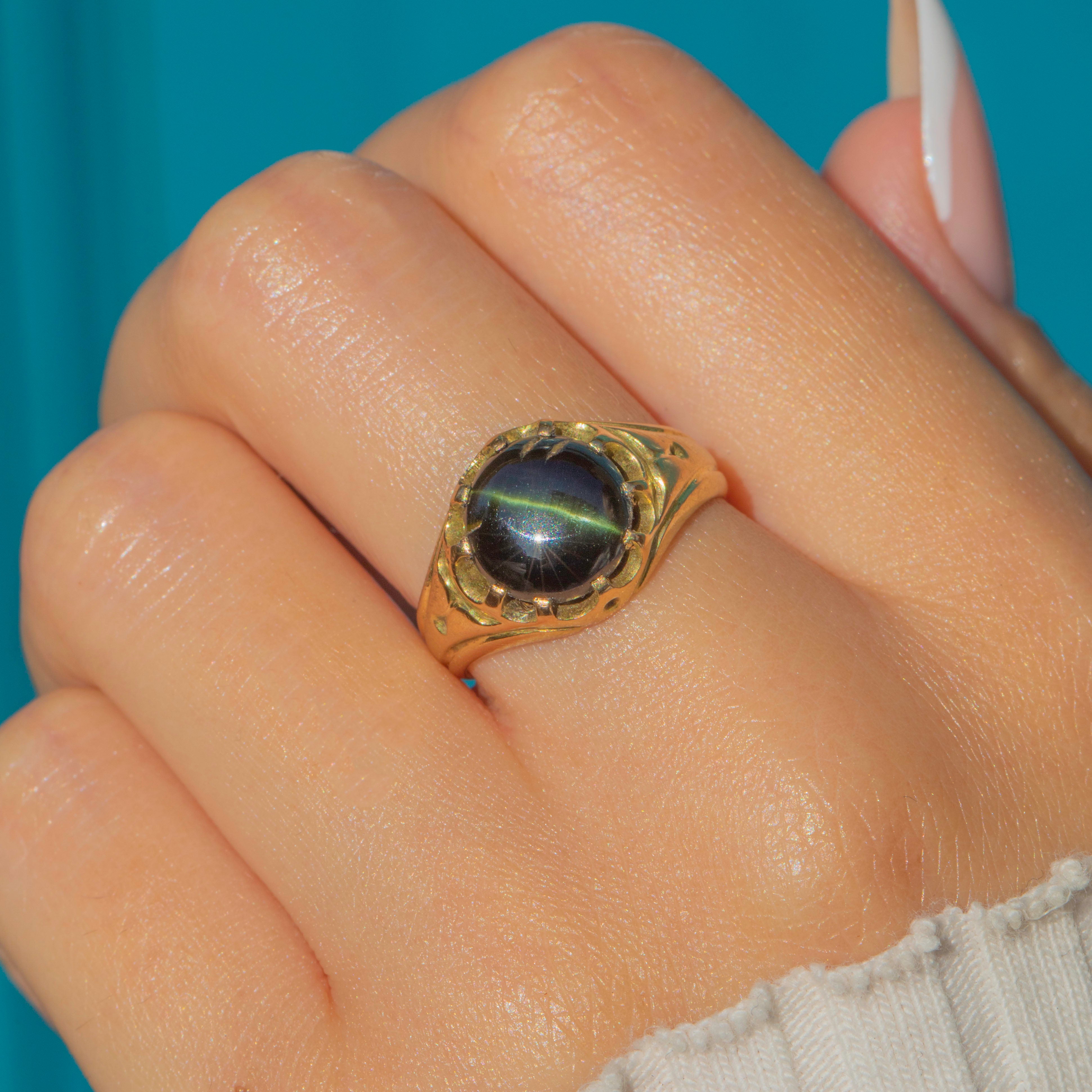 This Edwardian ring is set with a captivating Black Catseye Chrysoberyl, its inky cabochon surface displaying a subtle star-like phenomenon when it catches the light. The mysterious glow of the gem contrasts beautifully with the warm tones of the 18ct Gold mount, creating a jewel of understated elegance.