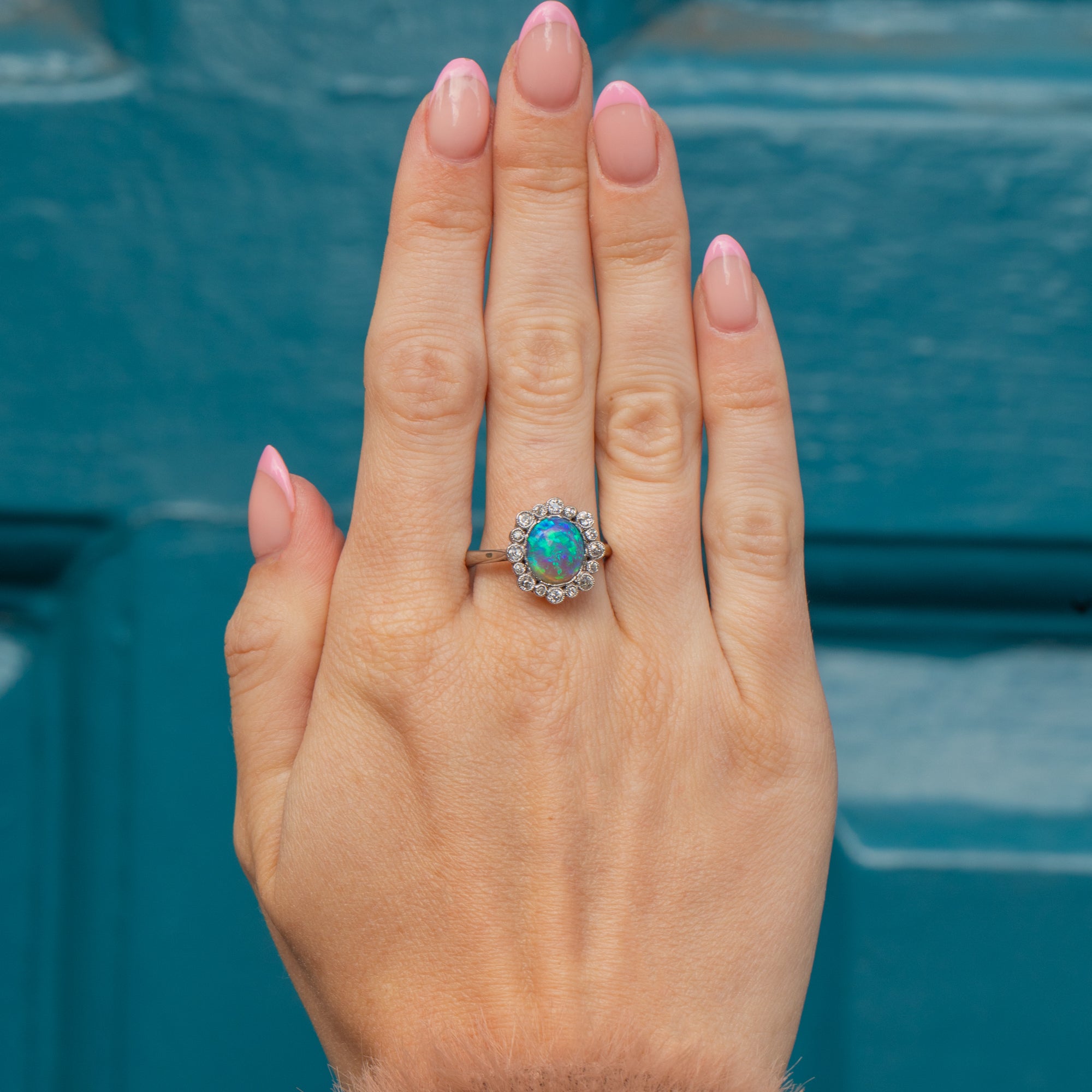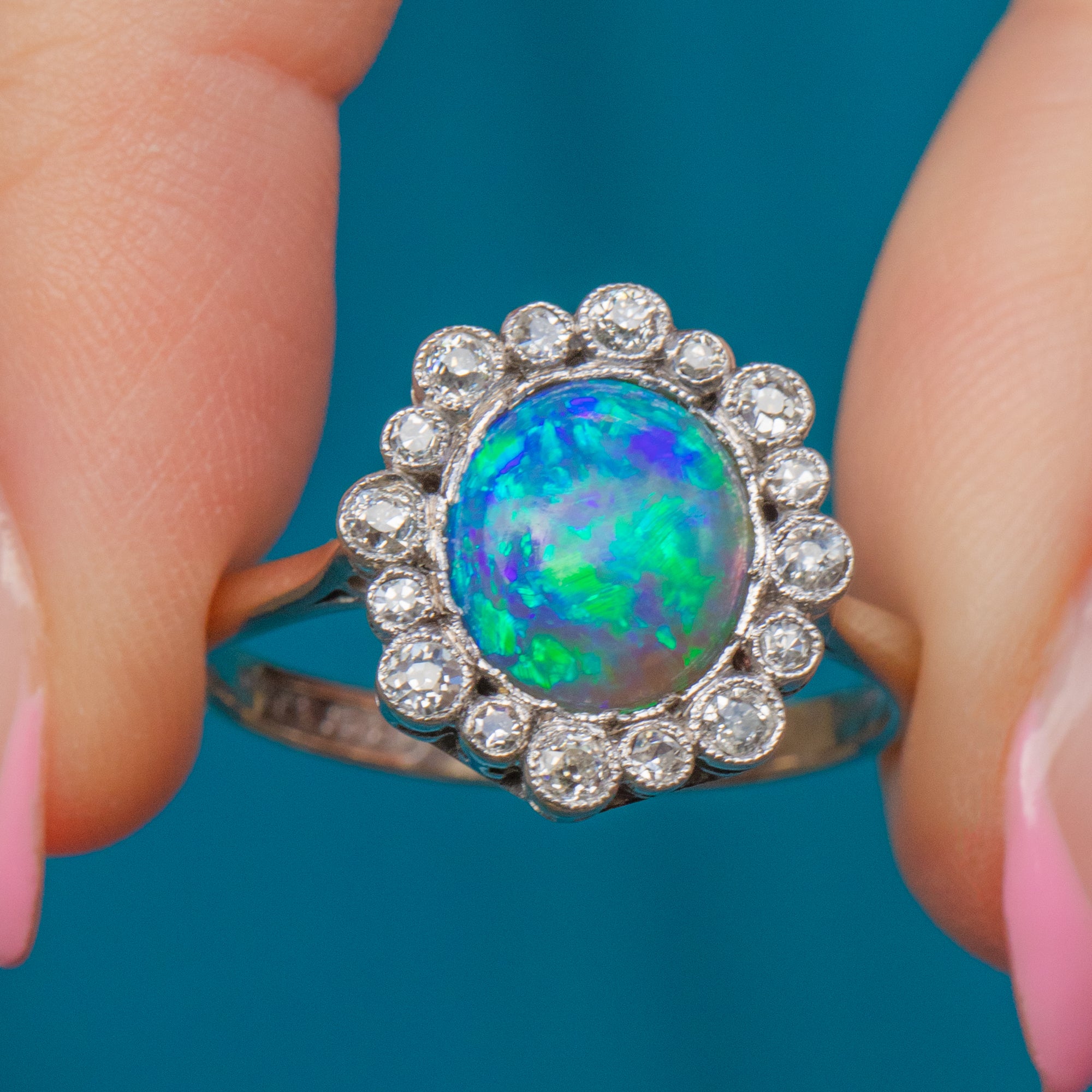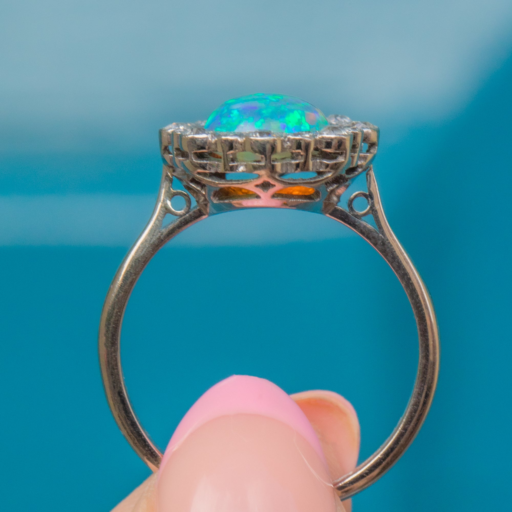 This Edwardian Black Opal Diamond cluster ring is a breathtaking piece! Possessing galaxy of spellbinding colours, the Black Opal boasts electric blues and zesty greens with a hint of soft peachy orange; this natural Black Opal is just heavenly!