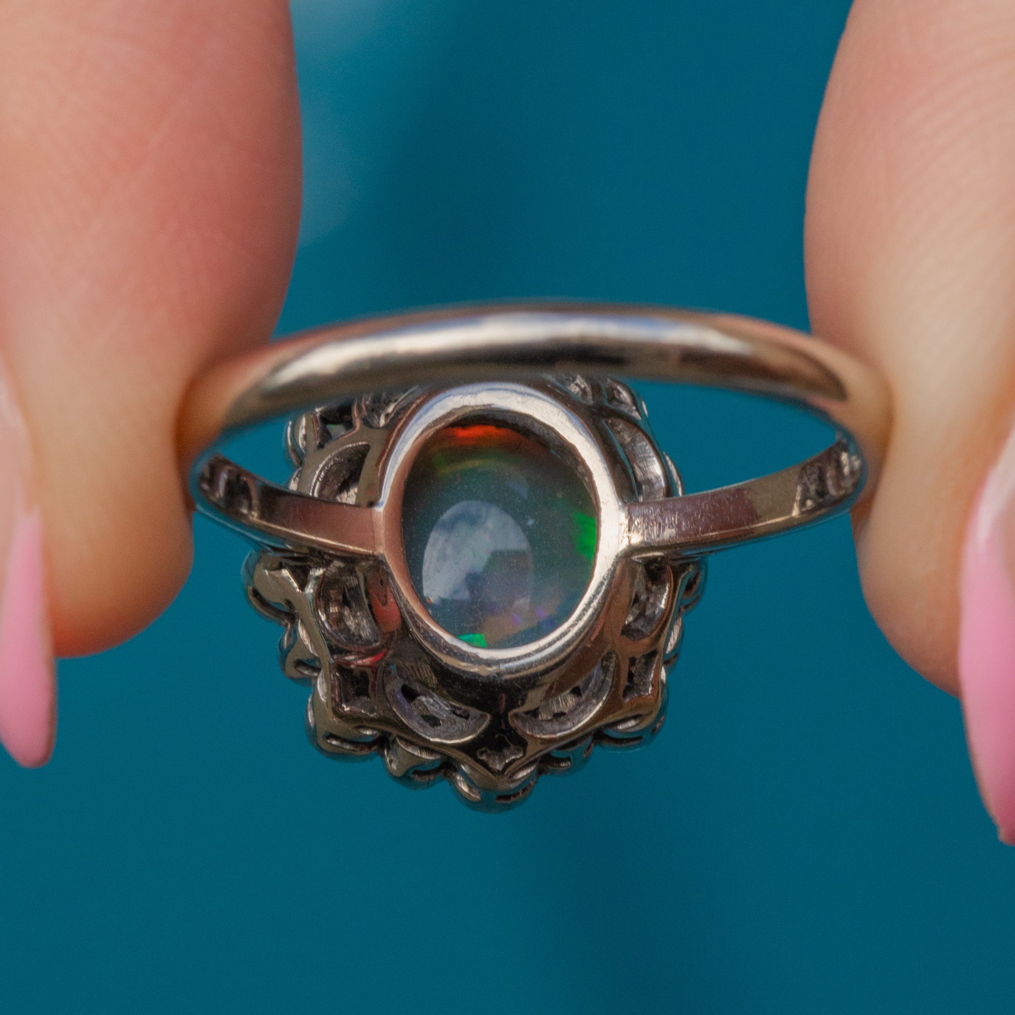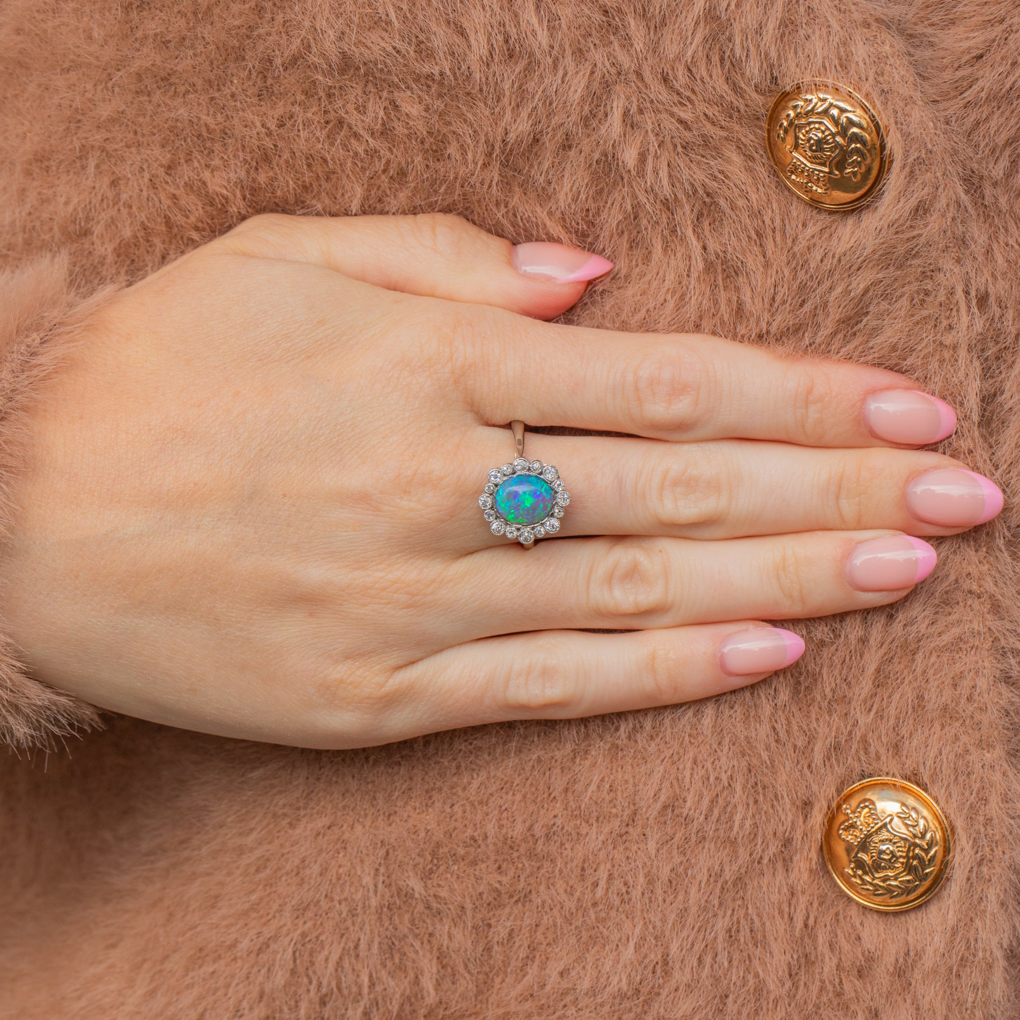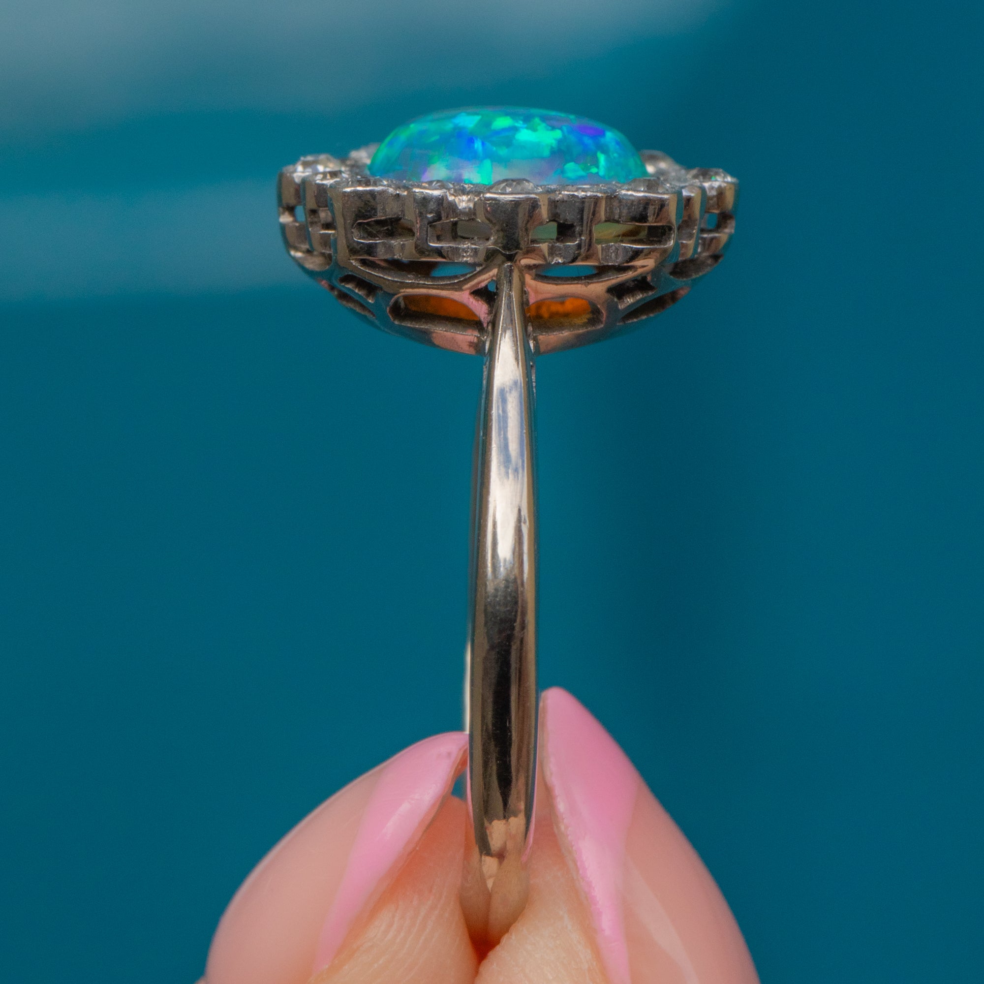 This Edwardian Black Opal Diamond cluster ring is a breathtaking piece! Possessing galaxy of spellbinding colours, the Black Opal boasts electric blues and zesty greens with a hint of soft peachy orange; this natural Black Opal is just heavenly!