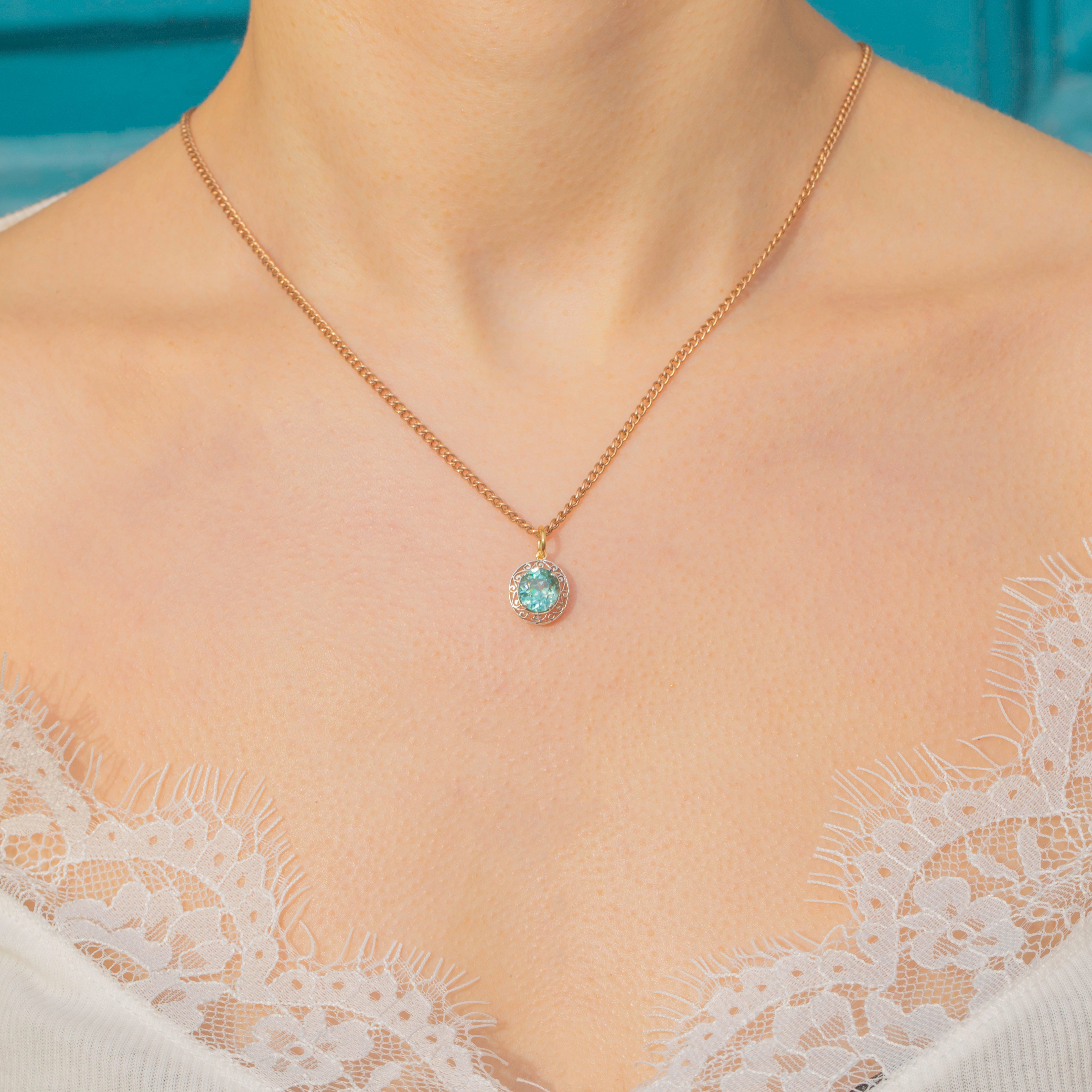 VERY GOOD: This Edwardian blue Zircon filigree charm is in wonderful condition. Wonderfully crafted, the Zircon sits securely within its settings. There are some small fleabites to the surface of the gemstone, though this is difficult to spot without a loupe. Gorgeous colour and life in the 1.30ct Zircon. With a well-soldered jump ring, you can wear this antique charm with confidence!
