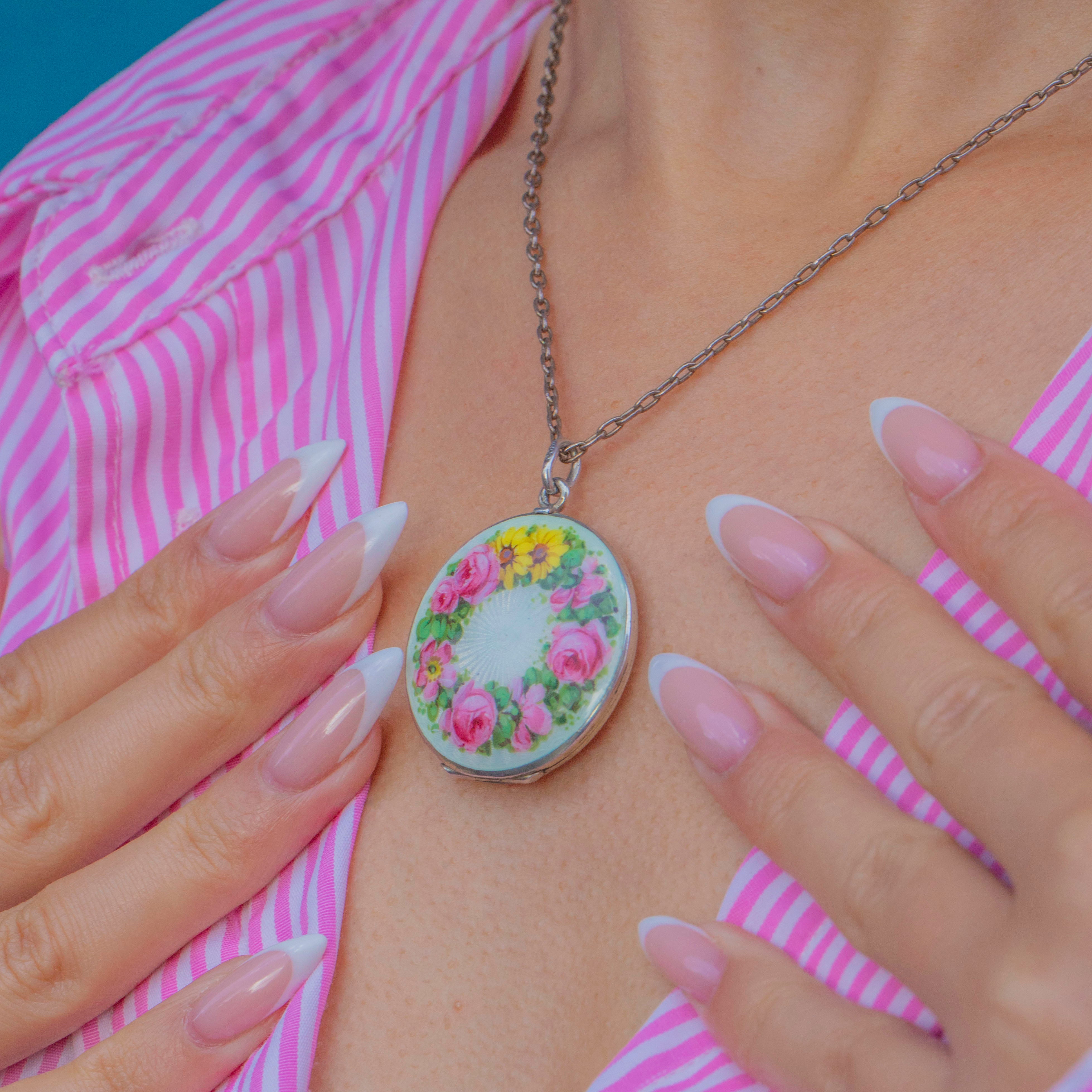 This delightful Edwardian locket is crafted in European Silver and decorated with exquisite Enamel work. The front features a vibrant guilloché Enamel ground in soft white, hand-painted with a colourful garland of flowers. Bright pink roses, cheerful yellow daisies, and fresh green leaves form a circular wreath, surrounding a radiating starburst motif at the centre.