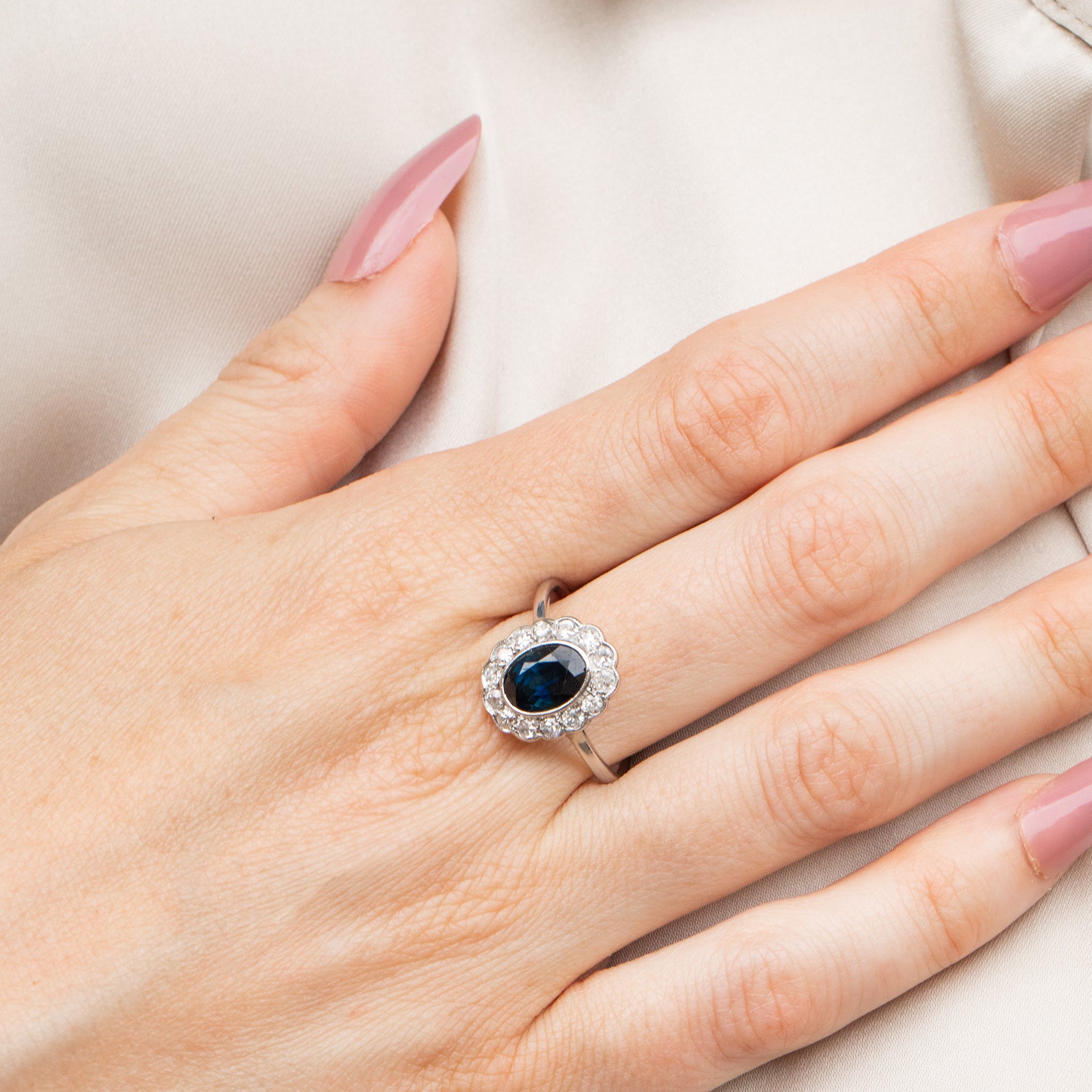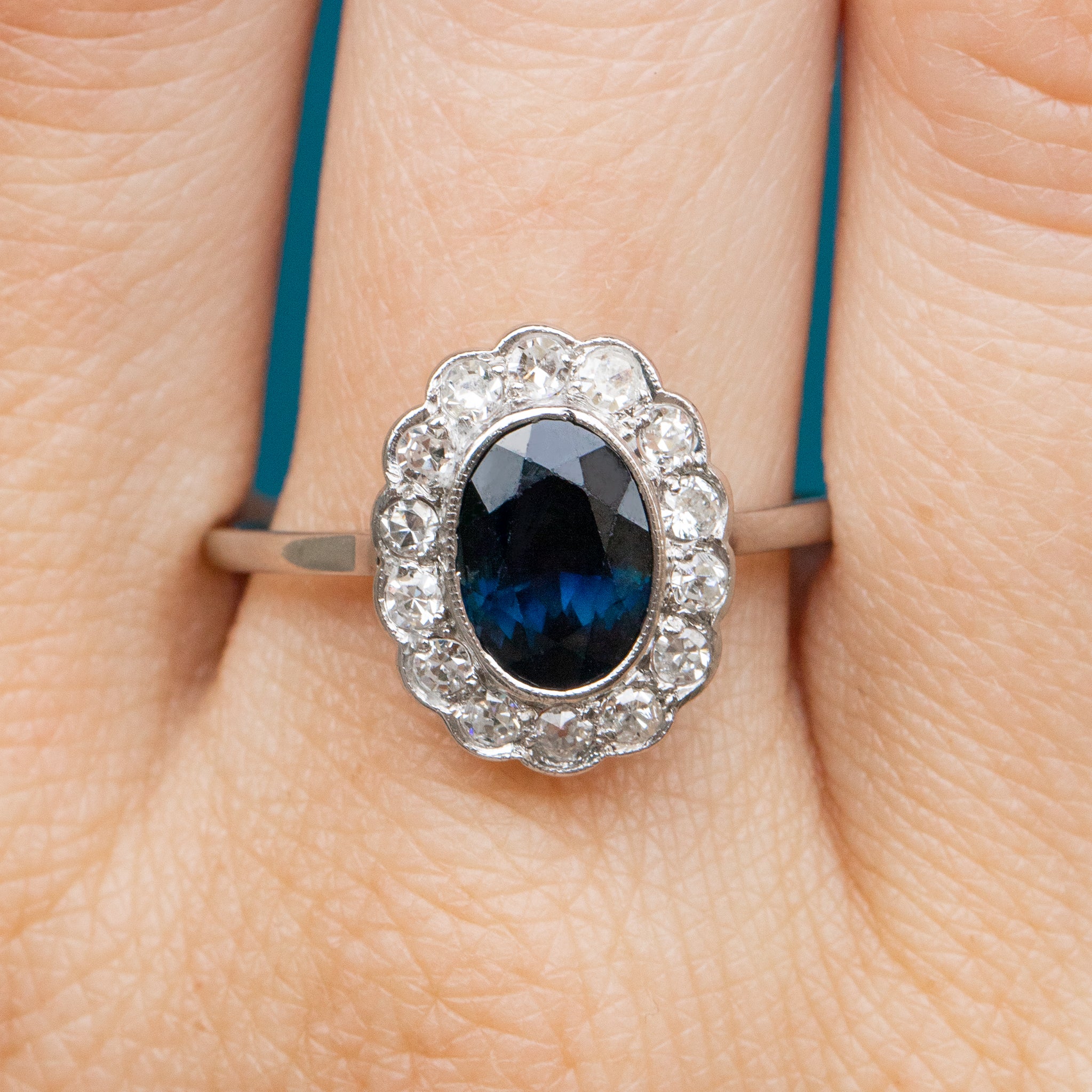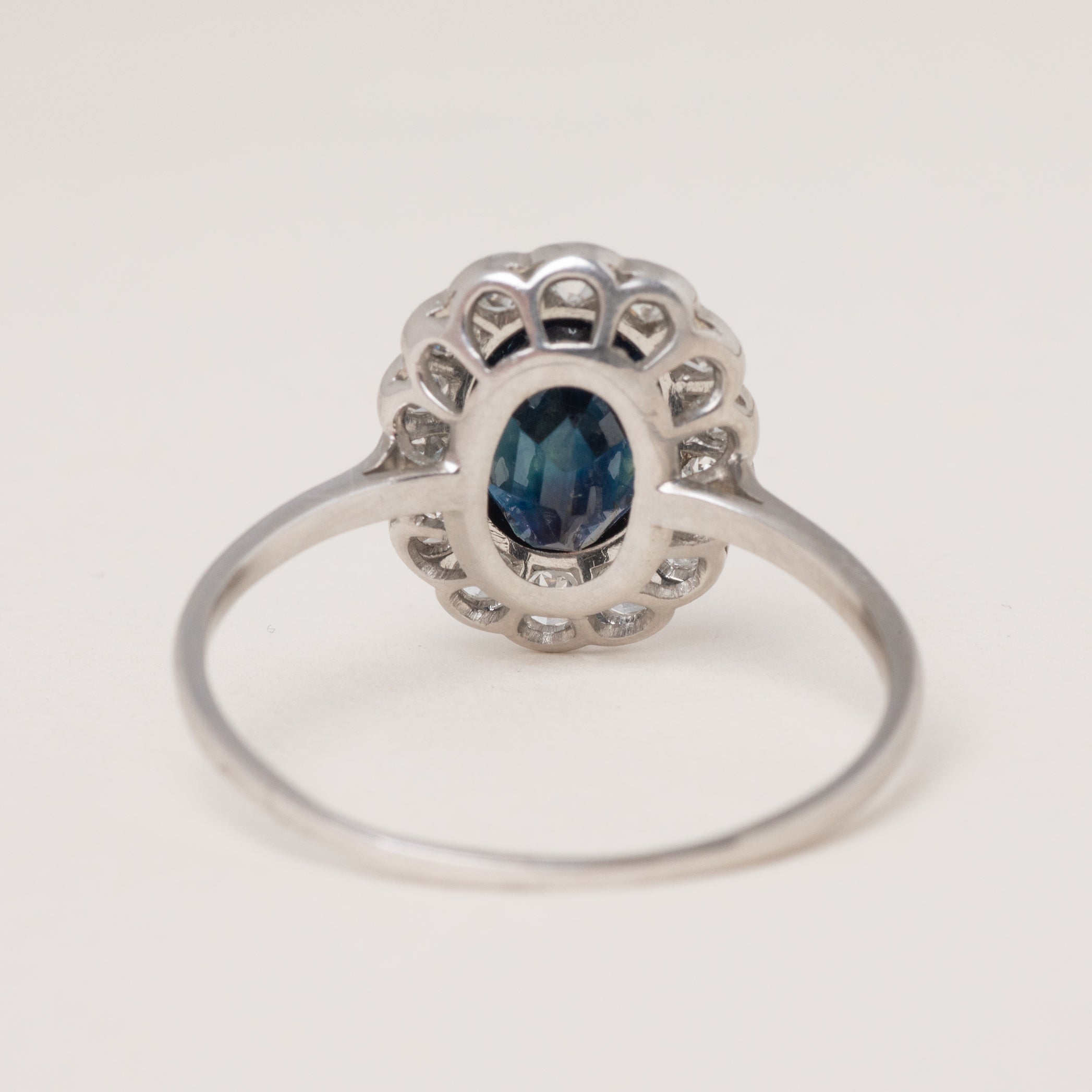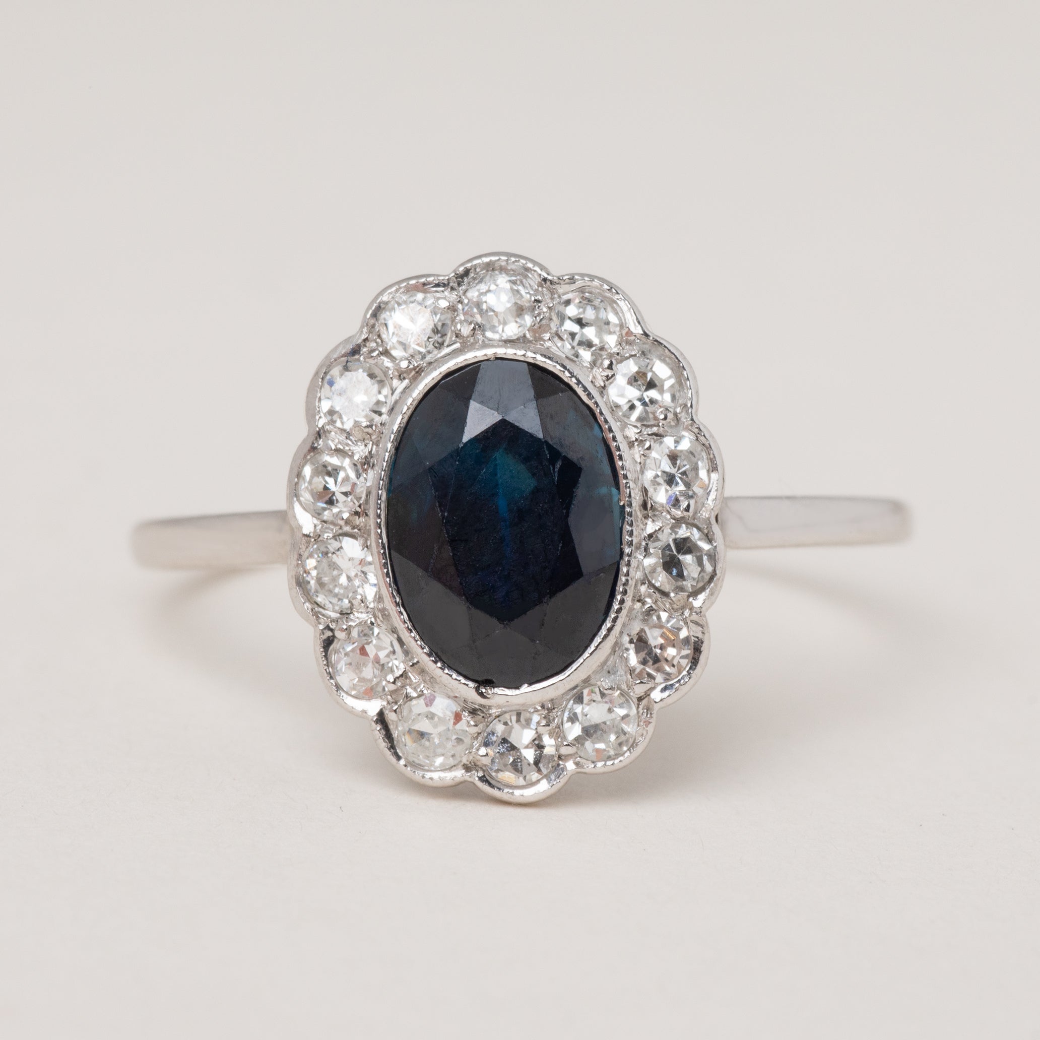 EXCELLENT. We are delighted to report that this Edwardian French 18ct Gold Sapphire Diamond oval cluster ring is in excellent condition. The sparkling Diamonds are beautifully bright and well-matched, and the 1.10ct natural Sapphire has a gorgeous deep midnight blue hue, with straight striations within the gem under strong light and magnification indicating this is a natural gemstone with no treatments or enhancements. The gemstones are securely set and completely free from chips or abrasions. She has antique French stamps on the outside of the band- confidently showing her French provenance. The 18ct white Gold band is lustrous and has retained great form allowing you to wear her with the utmost confidence.