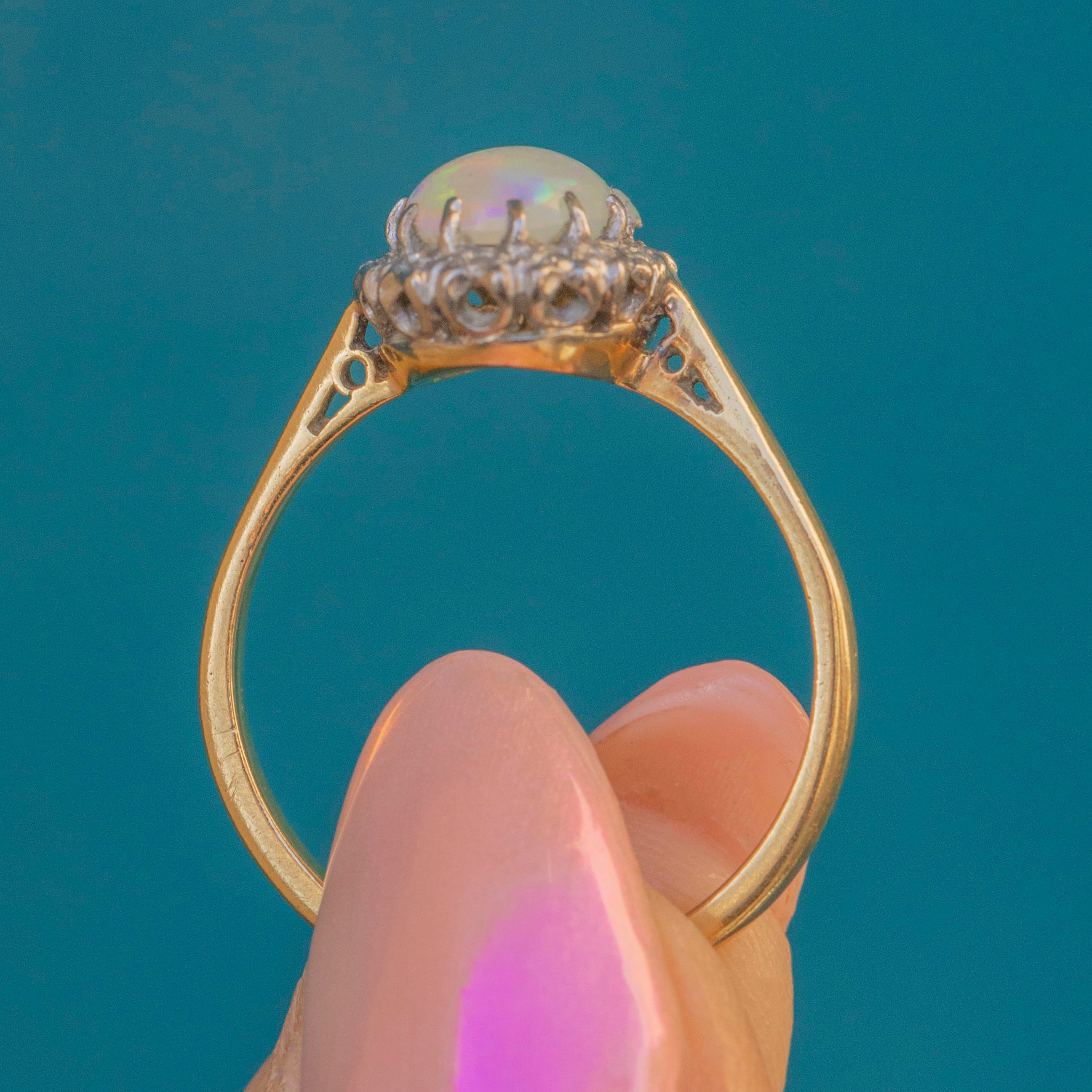 EXCELLENT. This antique 18ct Gold Opal Diamond ring is in excellent condition. The Opal is securely set and free from any scuffs or surface wear. The Diamonds are gorgeous and sparkle beautifully. With little else to note, she is in wonderful condition!