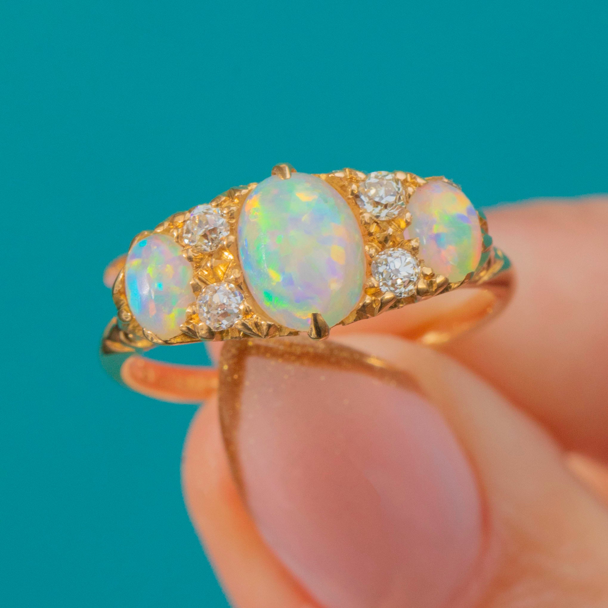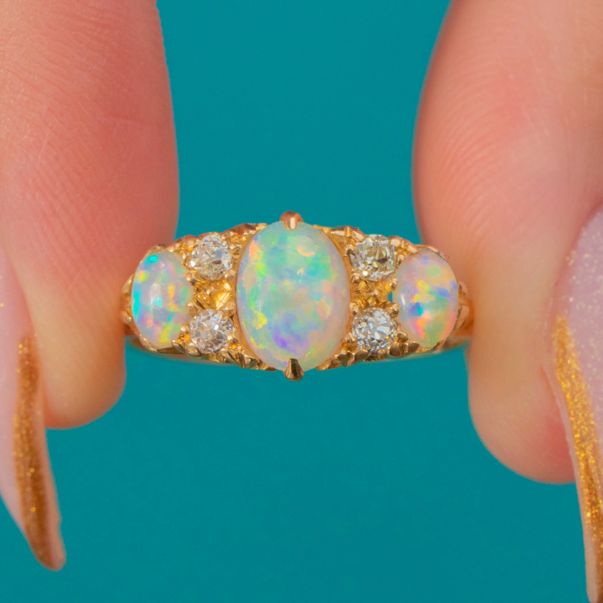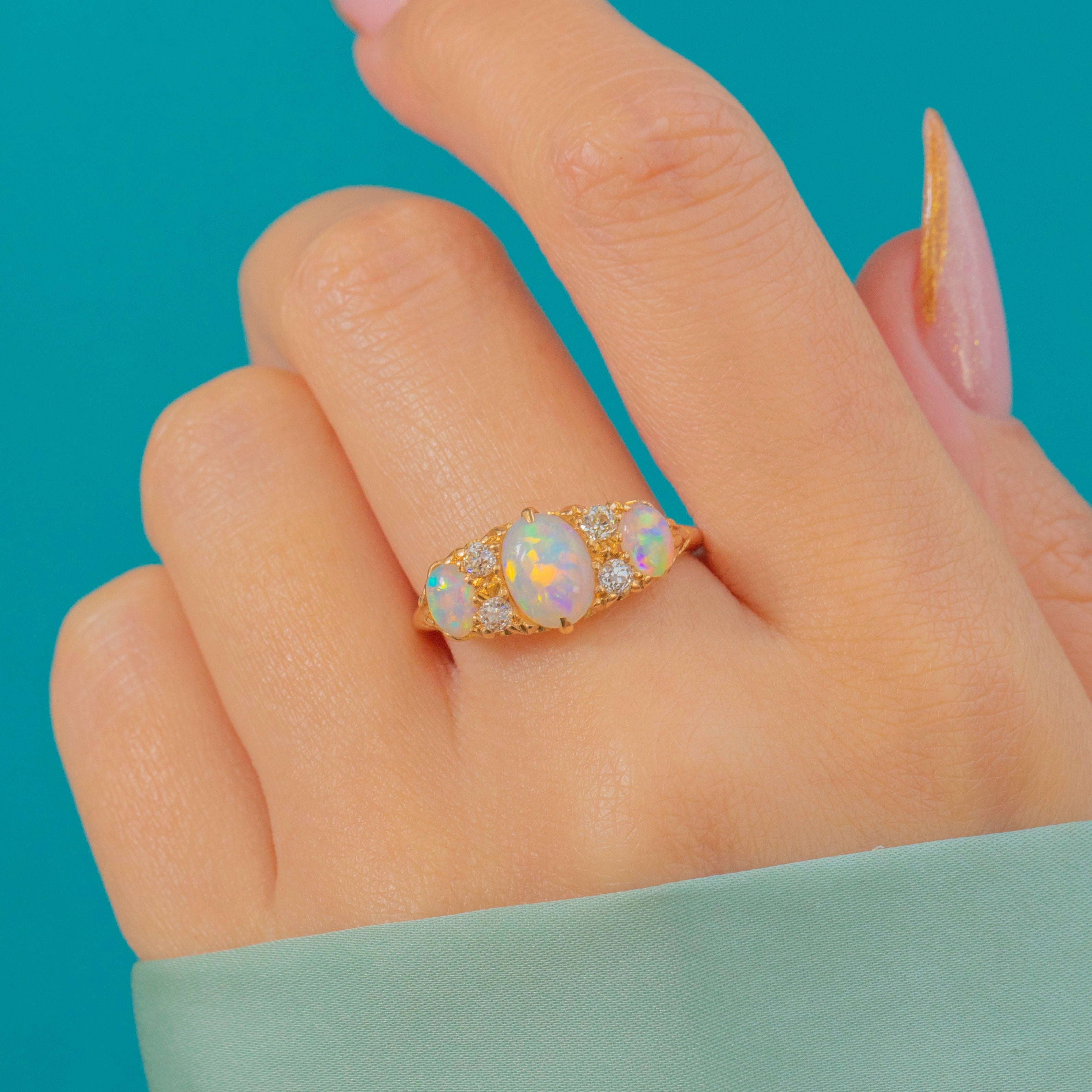 An exquisite Edwardian Opal trilogy ring, fully hallmarked for the year 1906. This romantic antique design features a luminous trio of Opals displaying bright rainbow flashes of green, turquoise, and orange, accented by four sparkling old-cut Diamonds nestled between.