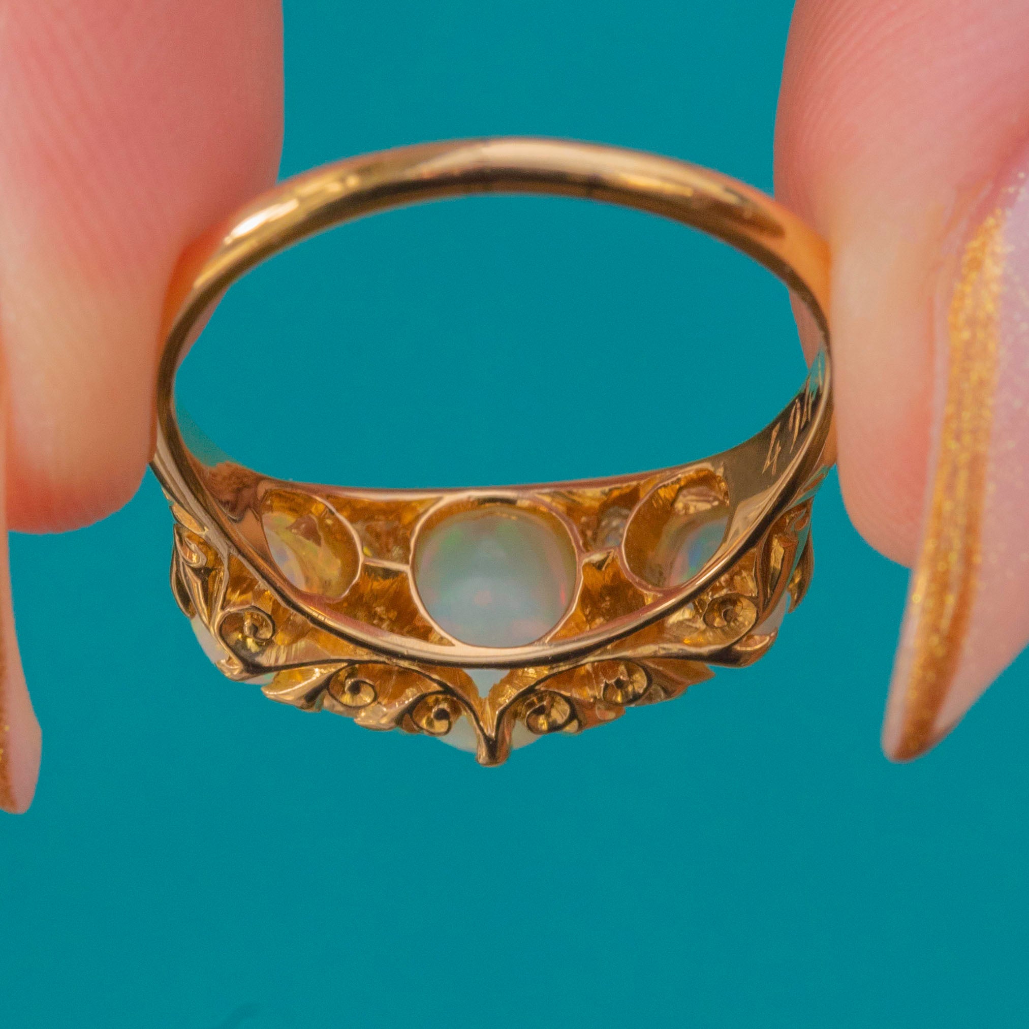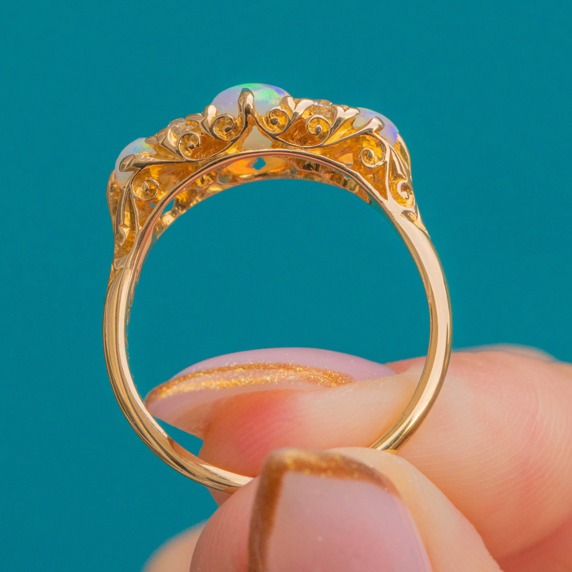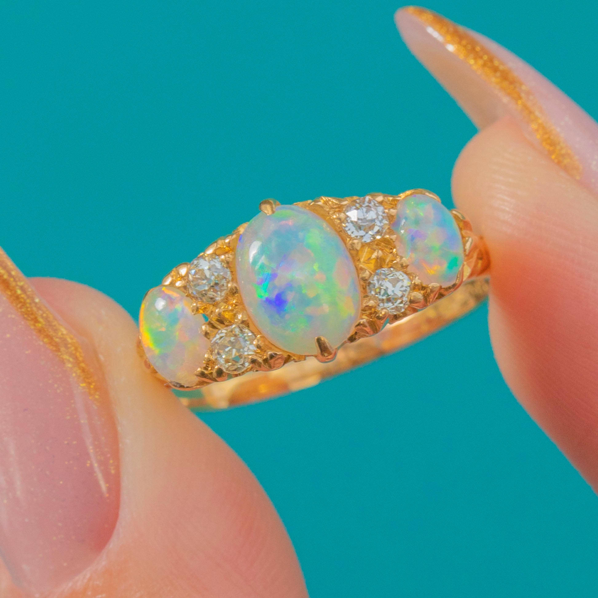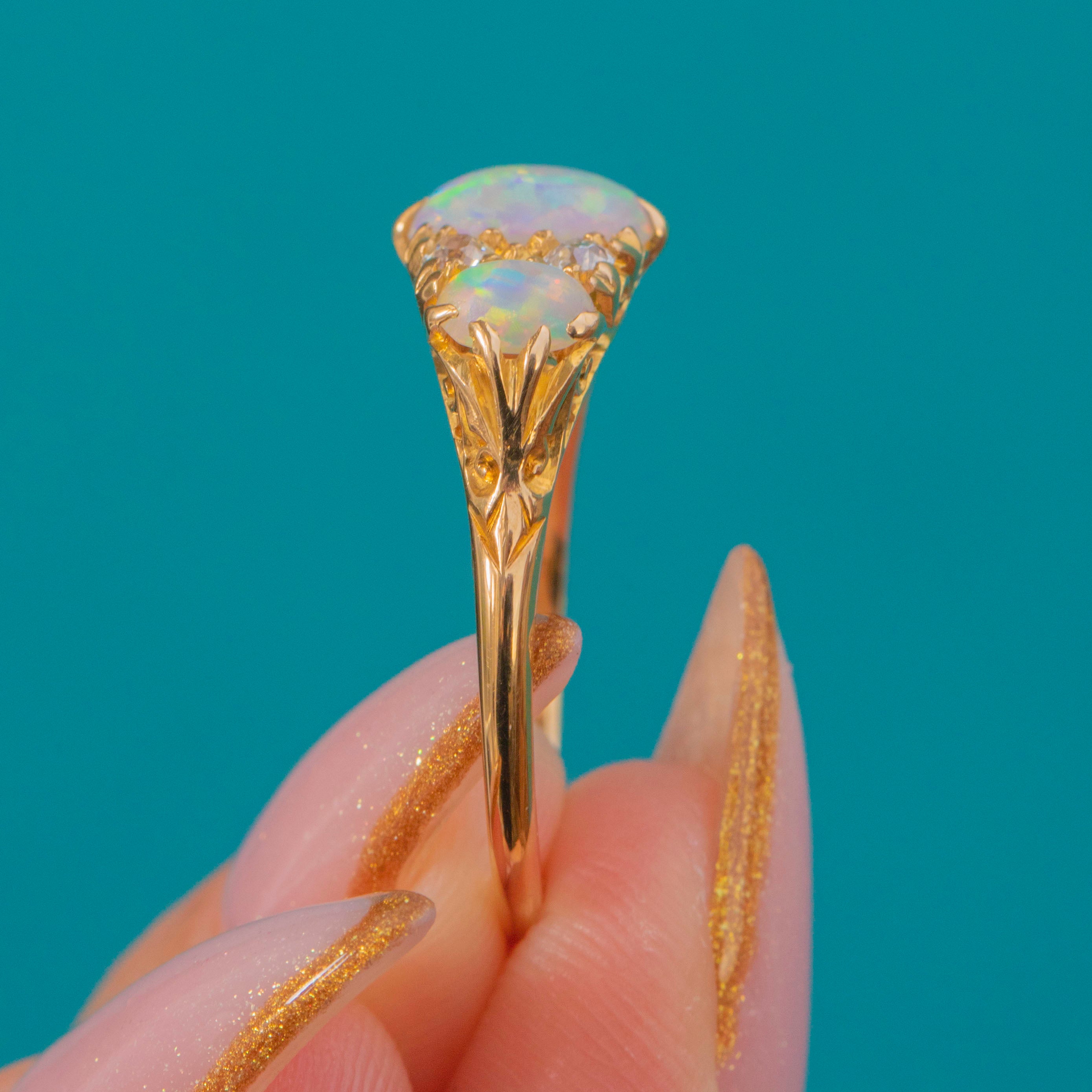 An exquisite Edwardian Opal trilogy ring, fully hallmarked for the year 1906. This romantic antique design features a luminous trio of Opals displaying bright rainbow flashes of green, turquoise, and orange, accented by four sparkling old-cut Diamonds nestled between.