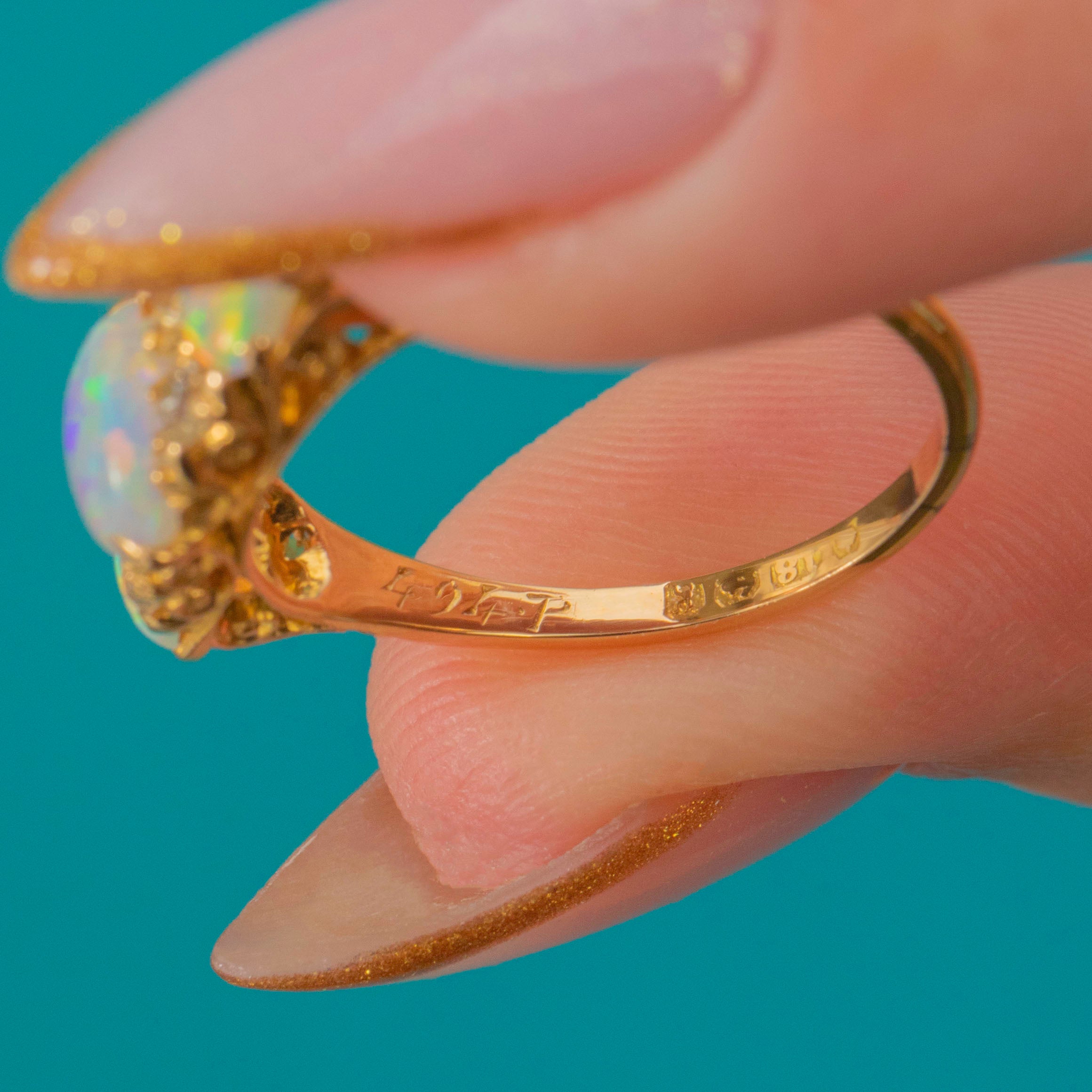 MATERIALS: 18ct Gold, Natural Solid Opals (1.30ct), Old-Cut Diamonds (0.12ct).