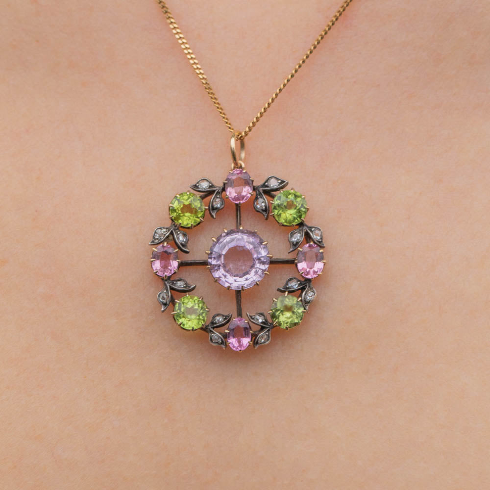 MATERIALS: Tests as Sterling Silver, backed with 9ct Gold, centre Pink Topaz, Pink Tourmaline, Peridot, Diamonds.