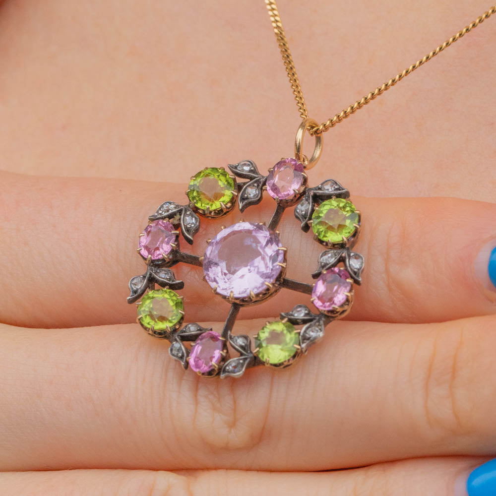 Featuring an elegant combination of pastel gemstones, this pendant exudes delicate sophistication and whimsical charm. In her centre sits a stunning faceted pink Topaz, catching the light wonderfully and radiating beautiful soft blush hues. She is adorned by a halo of alternating pink Tourmaline and green Peridot, accented by twinkling Diamonds.