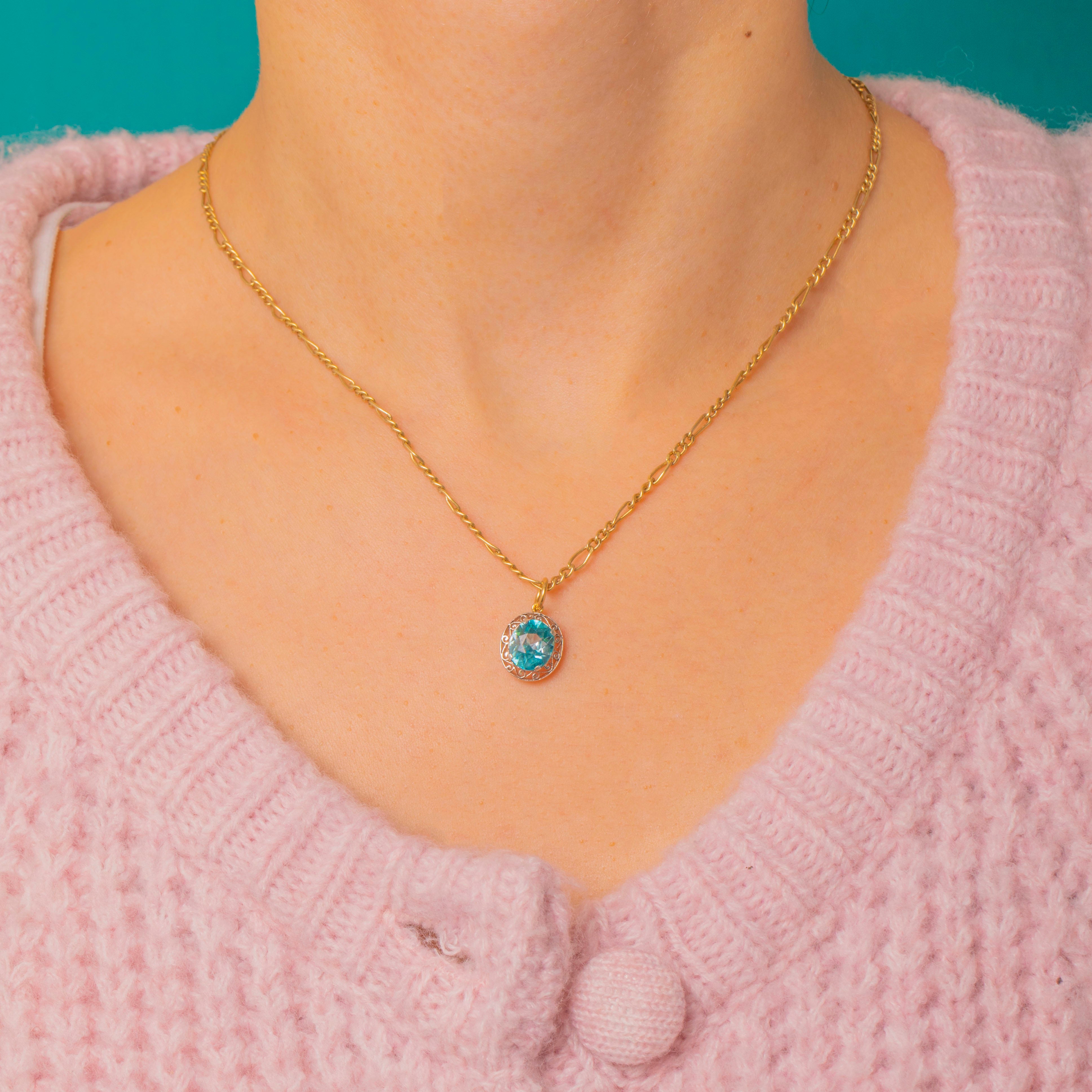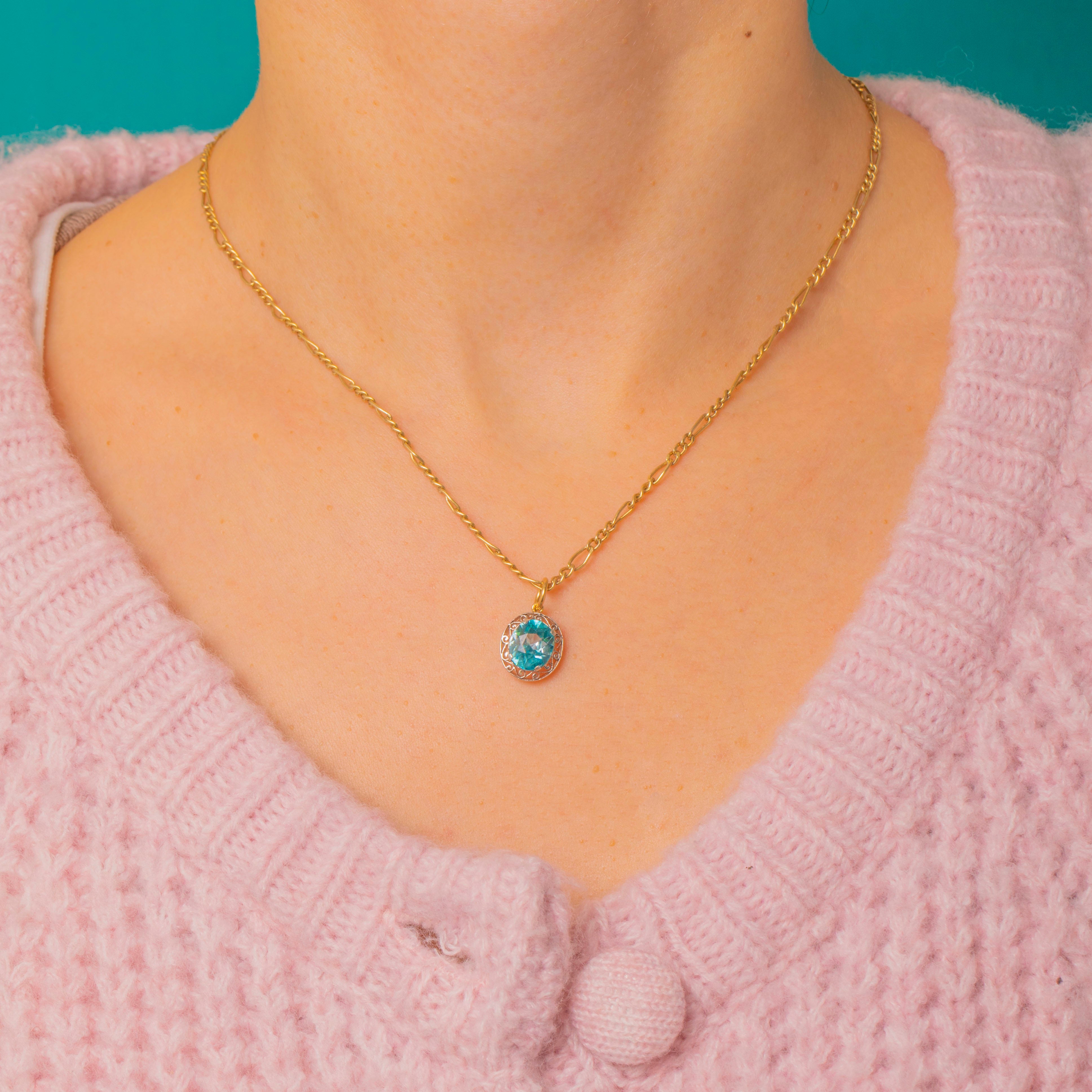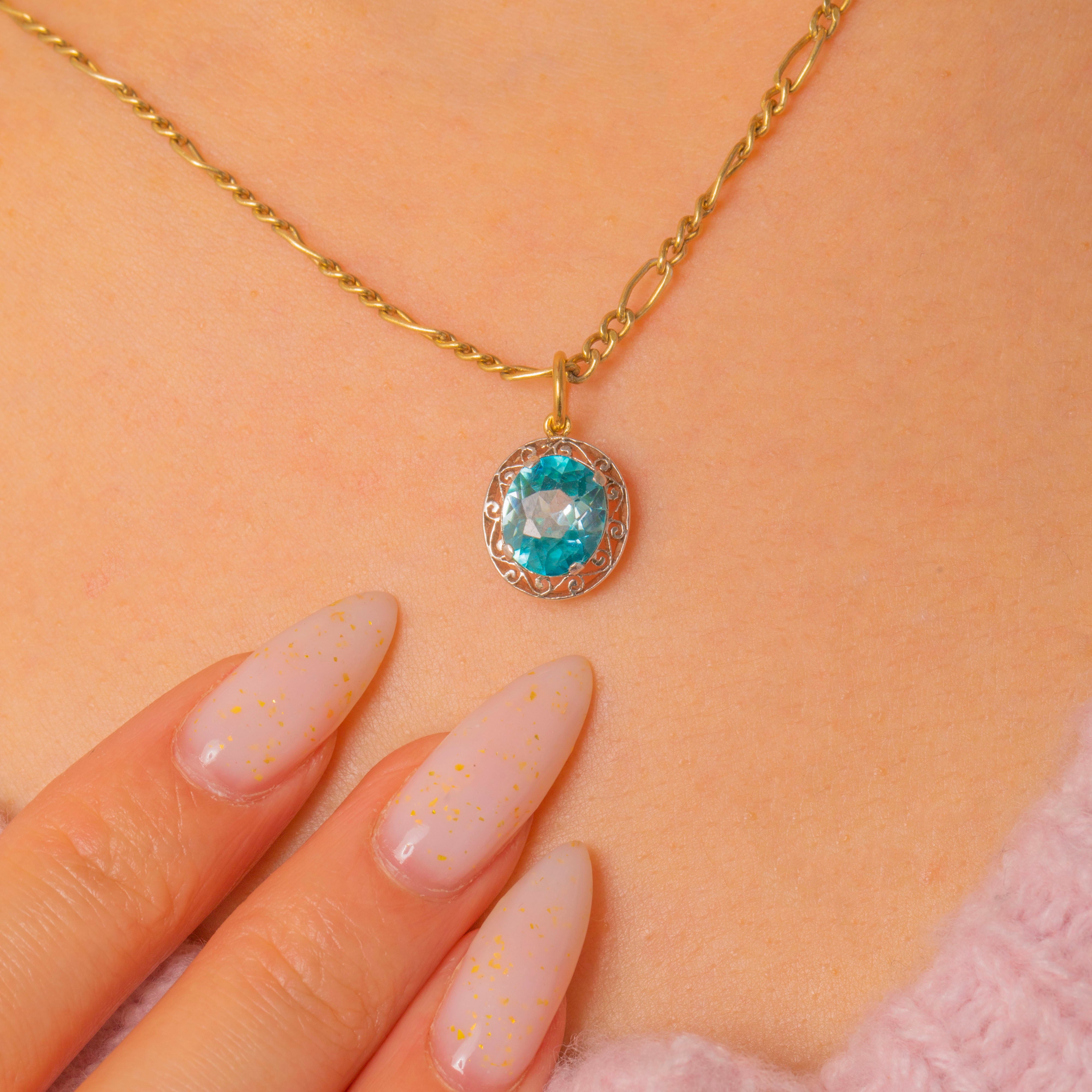 A petite two‑tone charm that pairs ornate Edwardian‑inspired filigree with a bright, faceted Blue Zircon. The aqua‑teal zircon sits in a low collet within a pierced scroll and foliate surround, the openwork halo lending an airy, romantic silhouette. Delicate and refined on a fine chain, this charm reads as vintage revival—ornate yet dainty, perfect for everyday wear or layered styling.