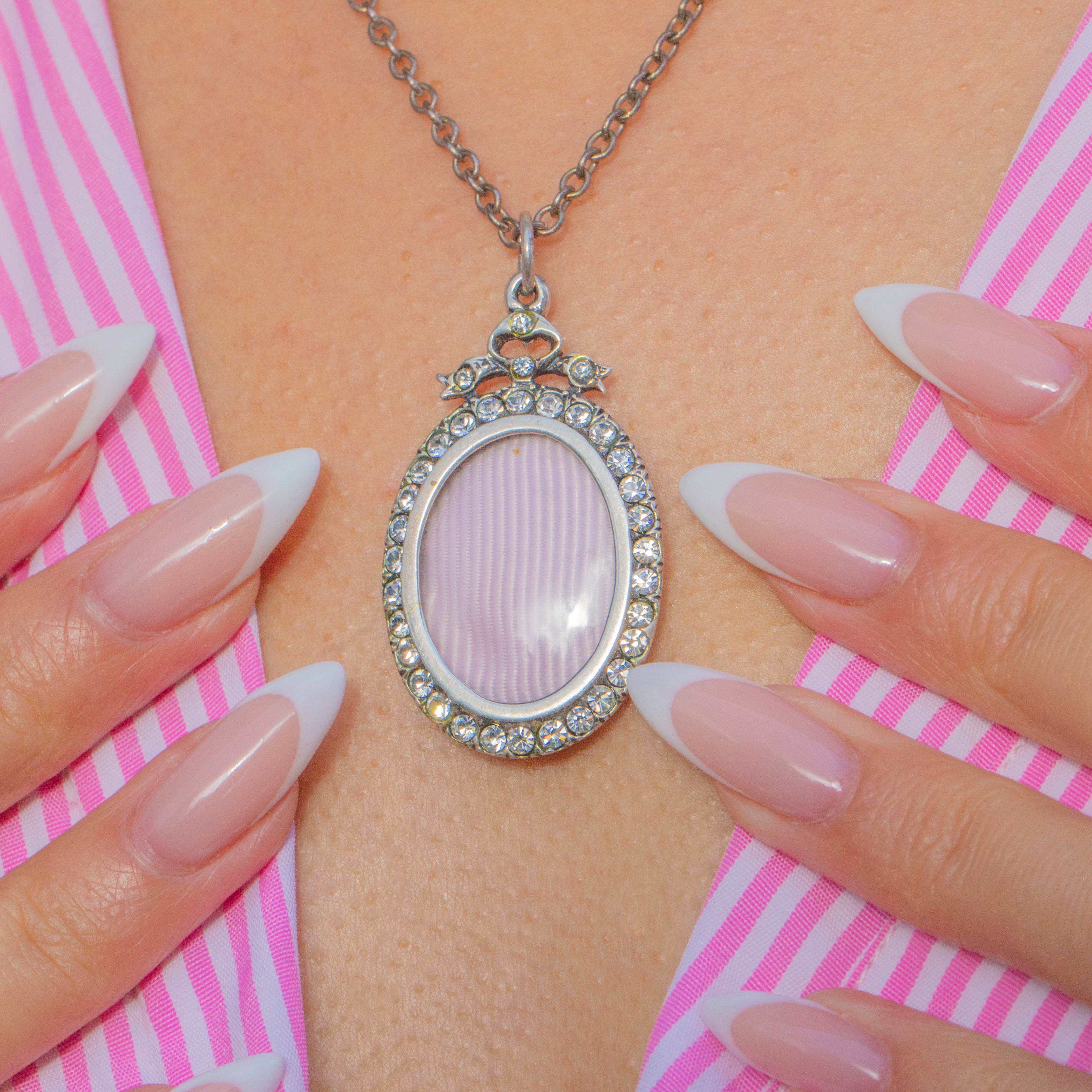 This Edwardian oval shaker locket is crafted in Sterling Silver and adorned with bright white Paste gemstones. Its classic oval form is simple yet elegant, with the glittering Paste stones providing a crisp sparkle against the cool Silver.