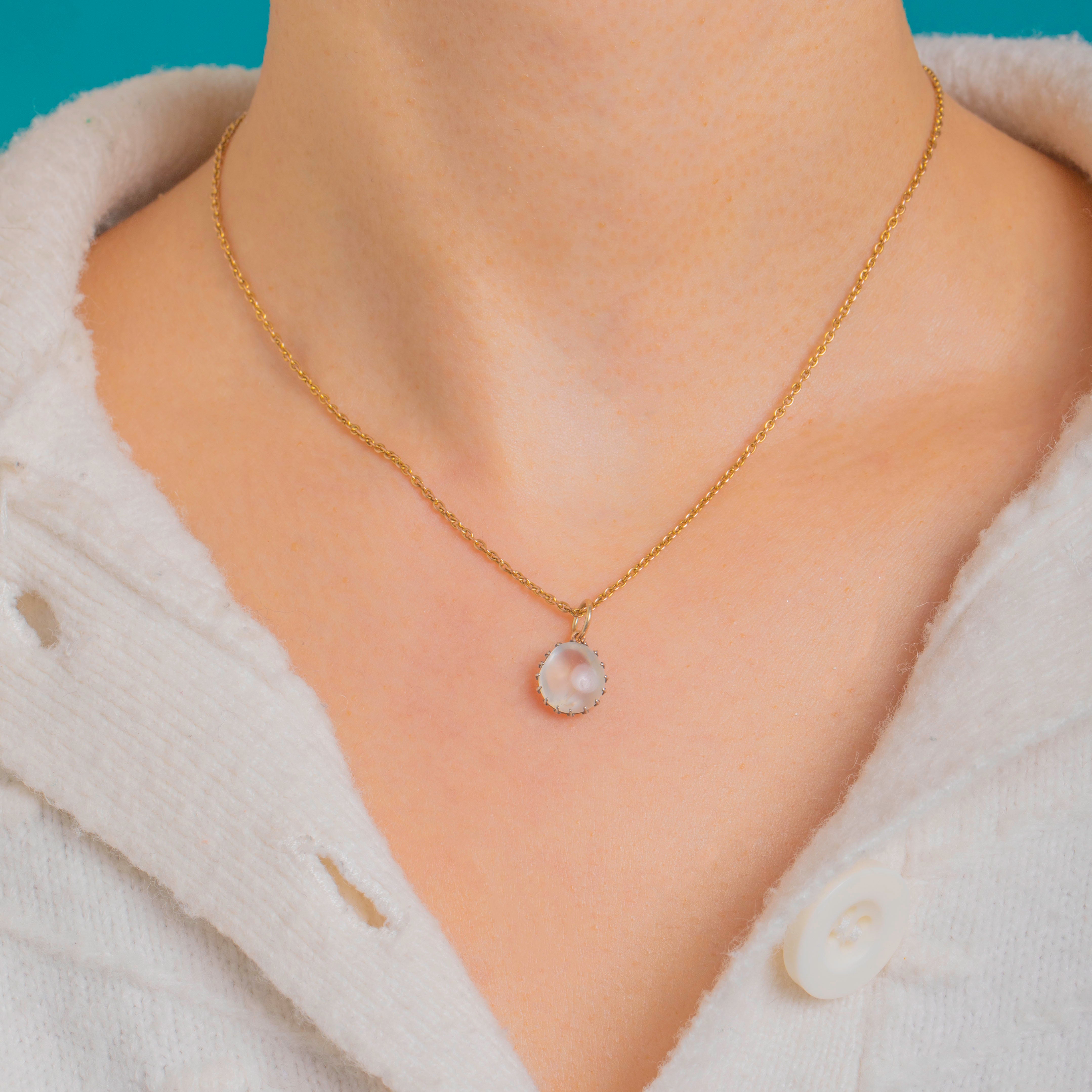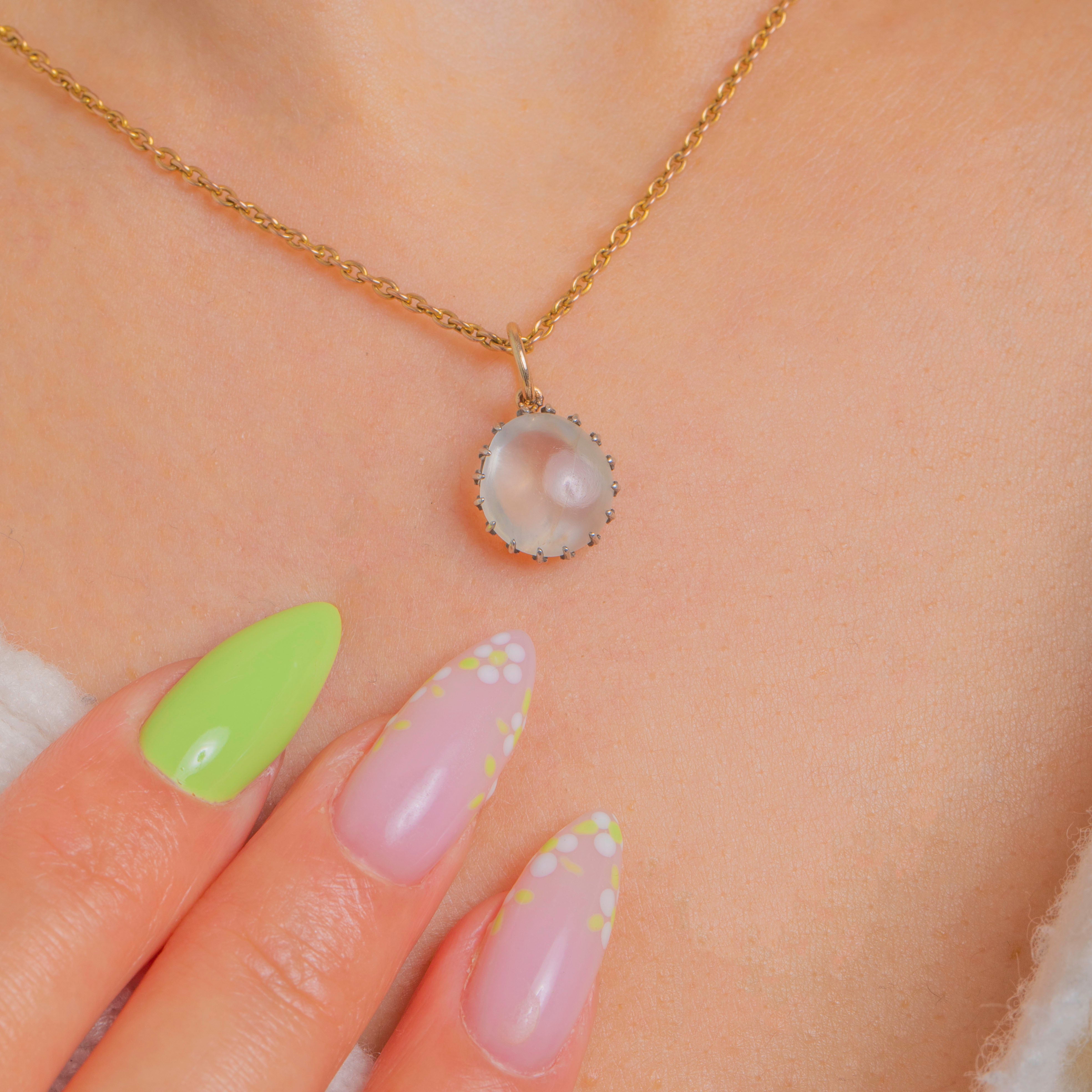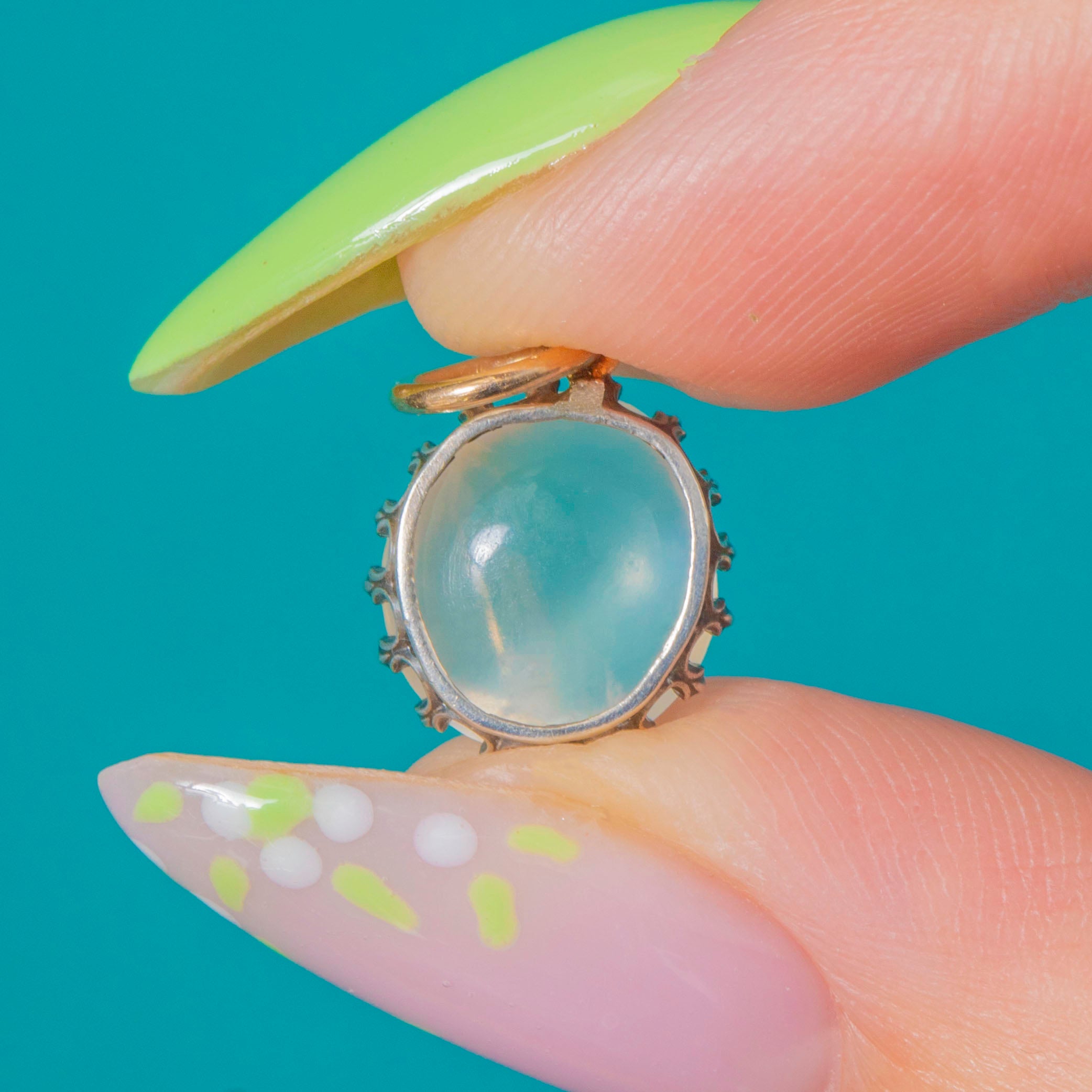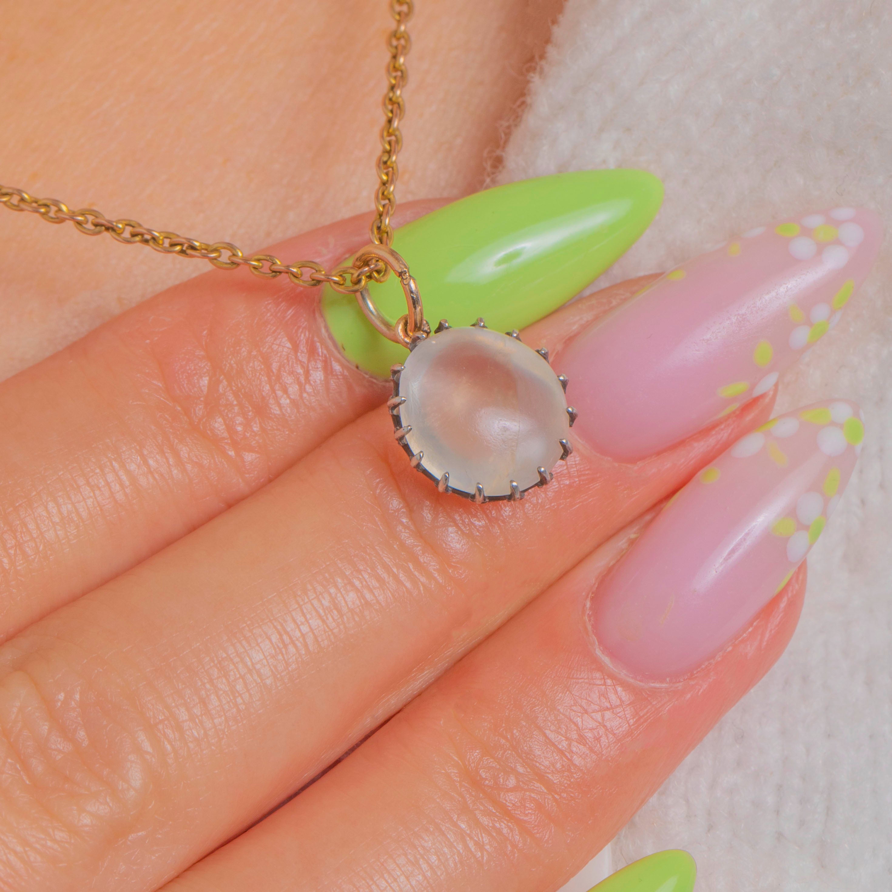 A luminous Edwardian Moonstone charm, crowned in a delicate Silver claw setting that lets the gem’s soft blue-white adularescence glow with every movement. A simple 9ct Gold jump ring adds a warm accent and makes it effortless to suspend from your favourite chain.