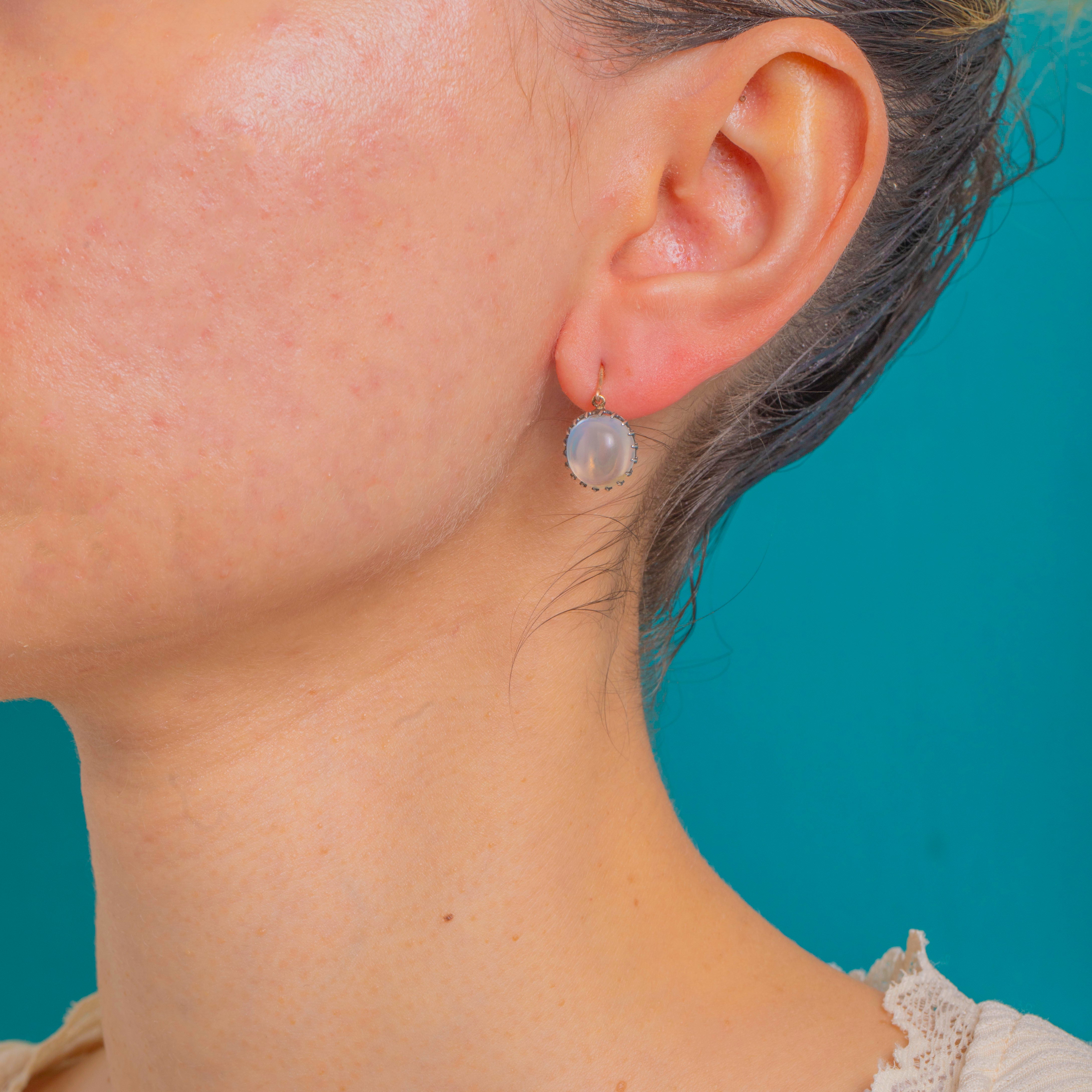 These Edwardian Moonstone drop earrings capture the era’s soft romance beautifully. Each luminous, high-domed Moonstone glows with ethereal blue-white flashes, cradled in a scalloped crown collet that frames the gem like delicate petals. The cool sheen of Silver is perfectly complemented by the warmth of 9ct Gold shepherd hooks, creating an elegant two-tone silhouette that flatters every look.