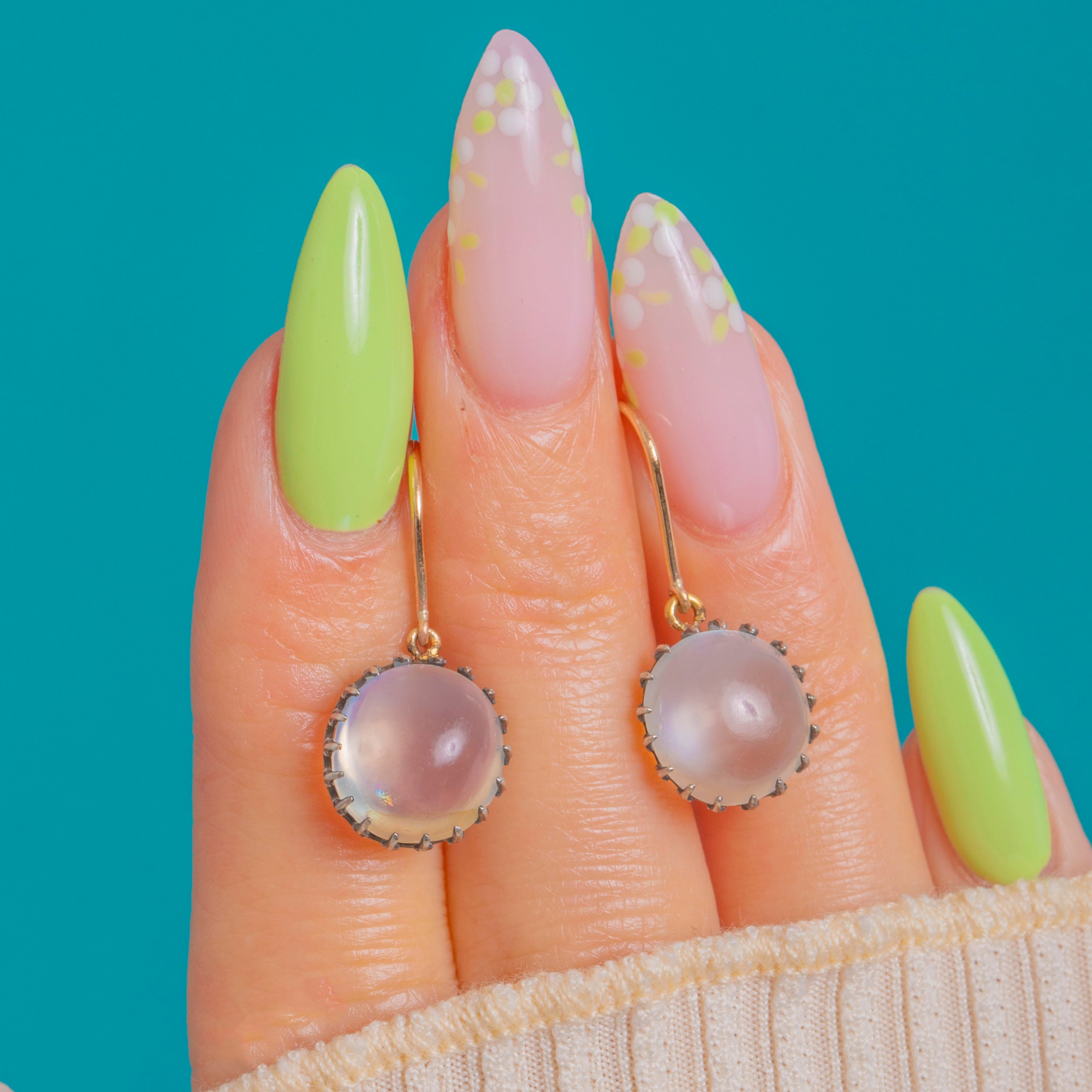 Graceful and timeless, the smooth cabochons sway lightly from slim hooks for effortless day-to-evening wear. With approximately 4.50cts in each Moonstone (about 9.00cts combined), their serene presence and gentle movement offer a dreamy, antique charm you’ll reach for again and again.
